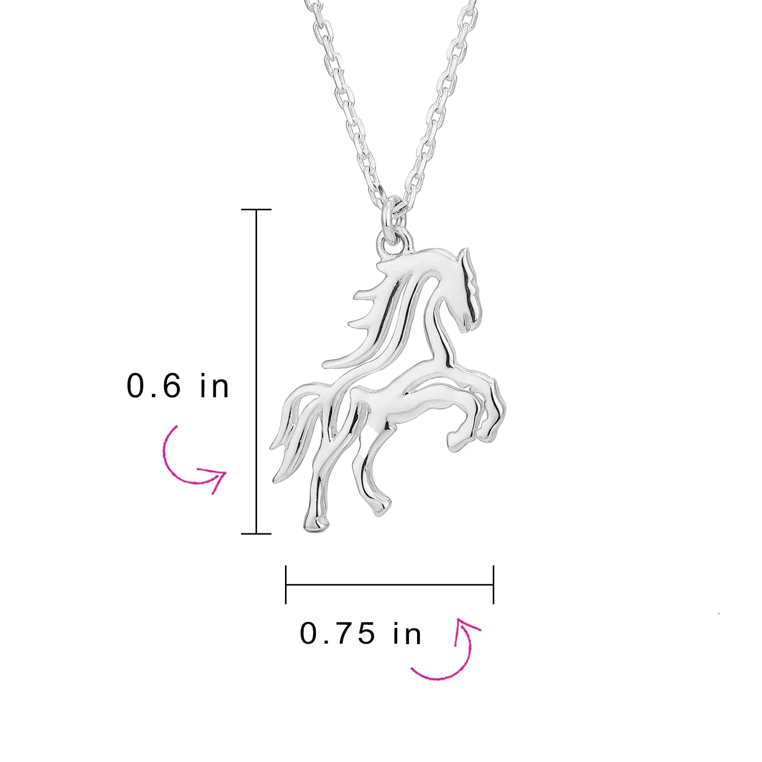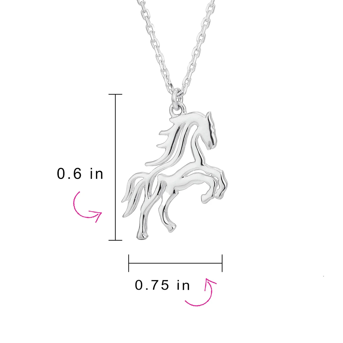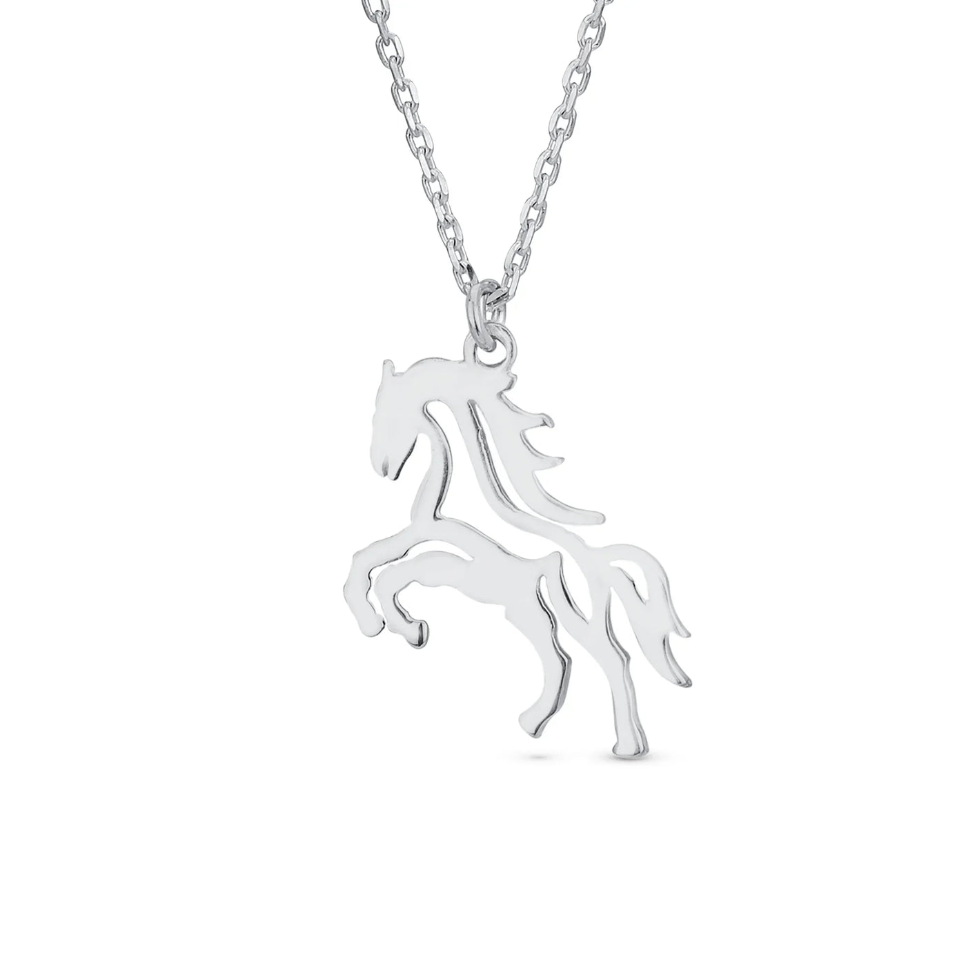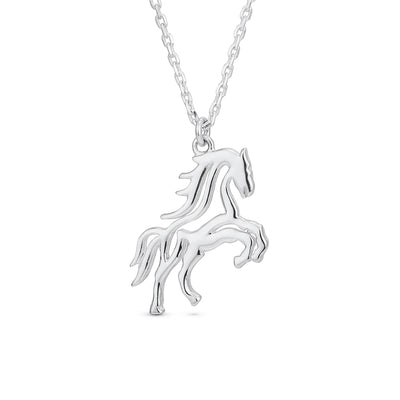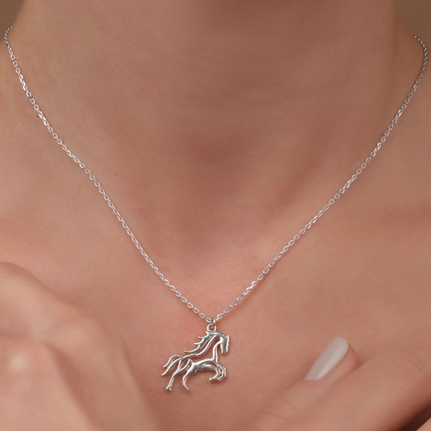- Discover the enchanting allure of our majestic horse pendant necklace. Crafted from .925 Sterling Silver, it exudes elegance and grace. Lightweight and delicate, perfect for everyday wear. Ideal for animal lovers and high fashion enthusiasts. This unique horse pendant makes a perfect gift. Elevate your style with the charm of stunning horses.