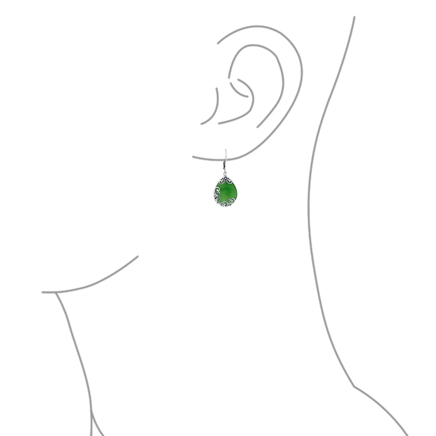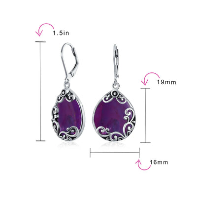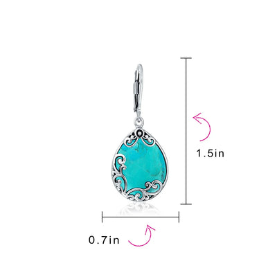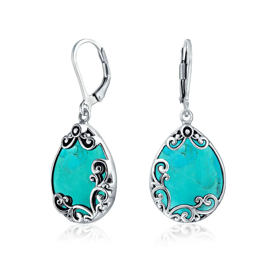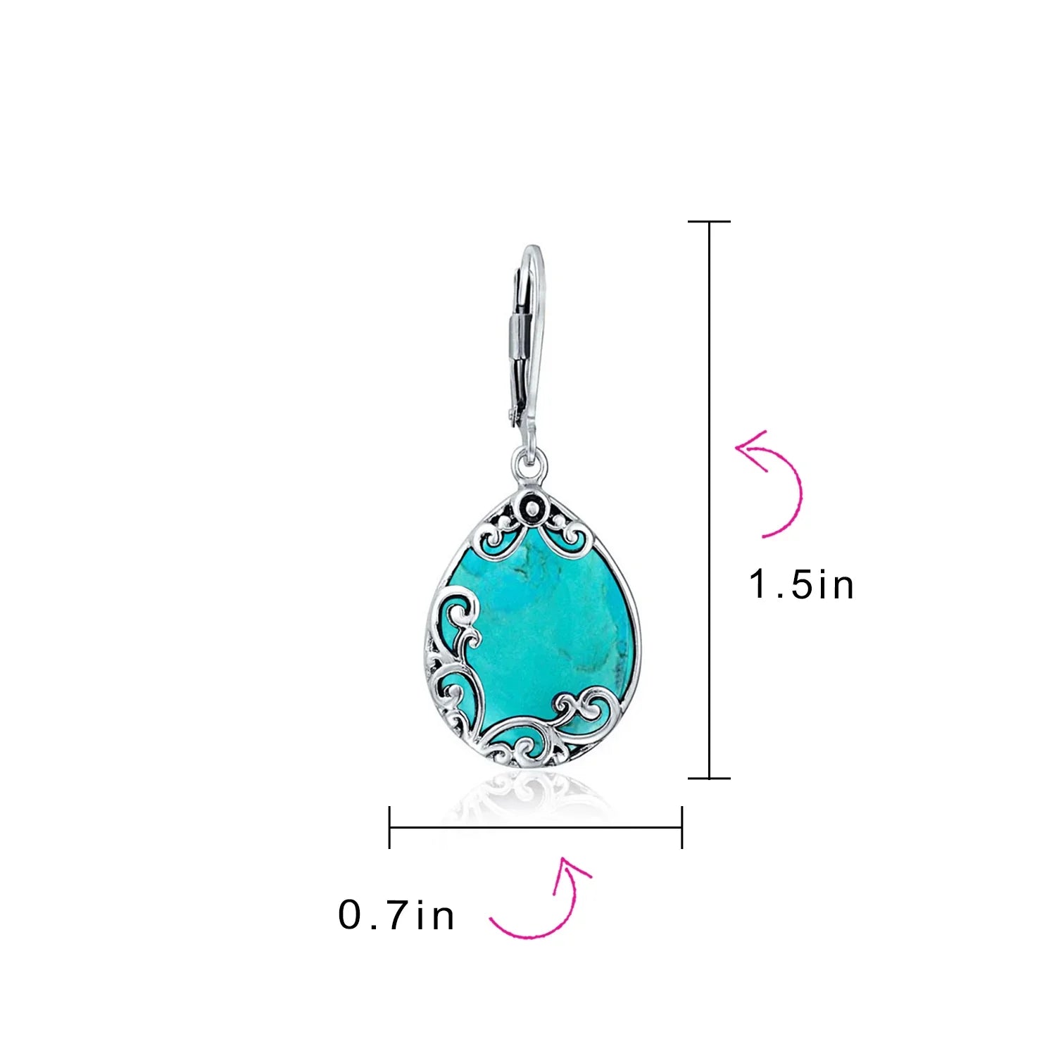 - These mesmerizingly lovely .925 silver pear shape dangle earrings will breathe fresh life into your style. Highlighted by an enchantingly vivid blue, stabilized turquoise tear drop stone with intricate vine scroll adornment. Splendid for December birthday.