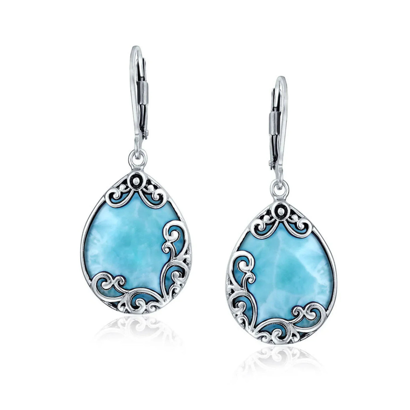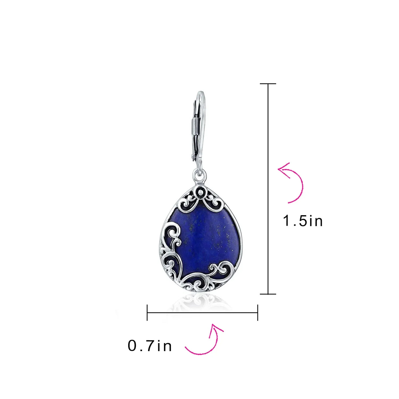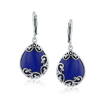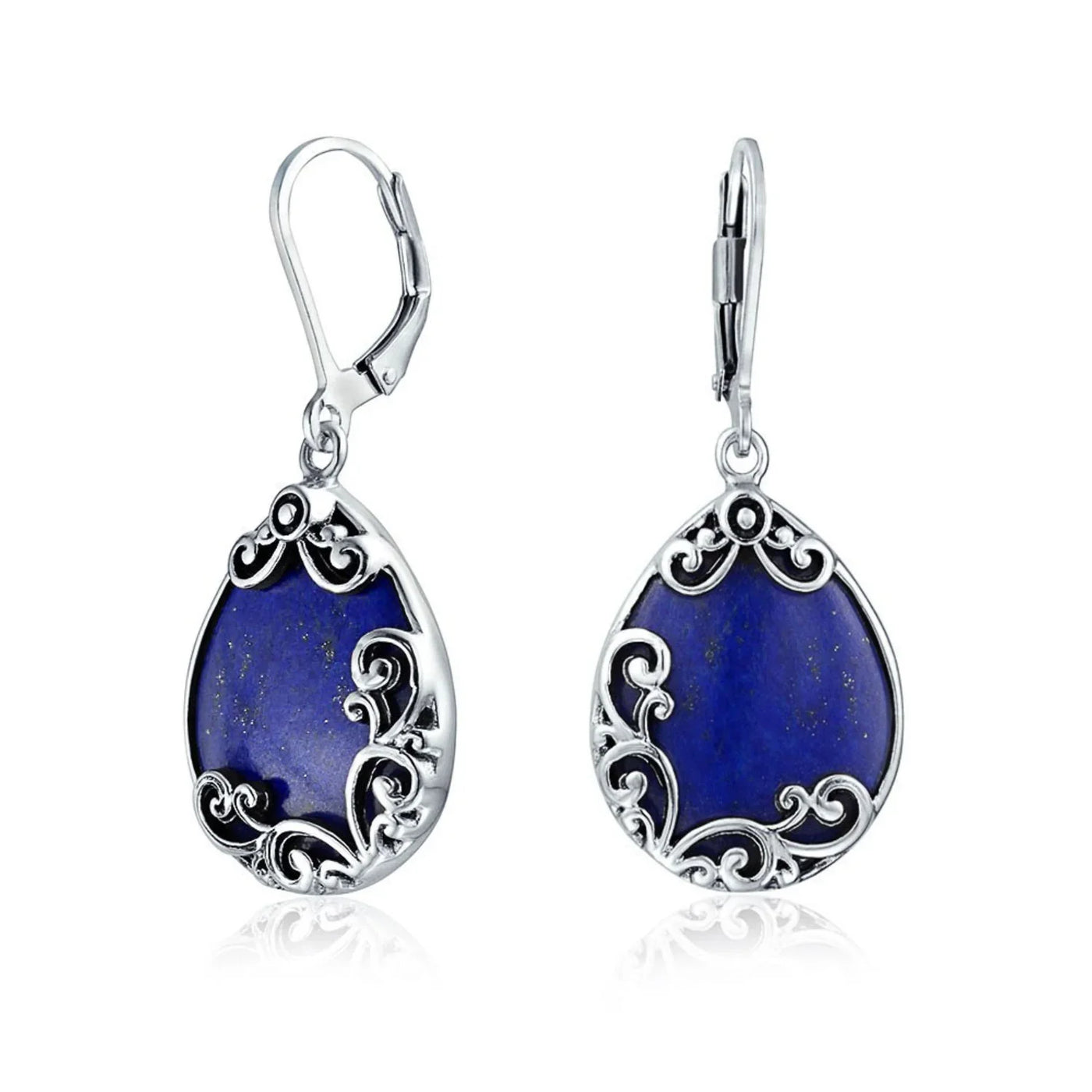 - These stunning Balinese sterling silver gemstone earrings feature chic silver vine detailing and blue teardrop stones. Natural stones add a vibrant pop of blue to these lever back earrings. They will soon become the MVP of your jewelry collection. Note: Color may vary due to natural stones.