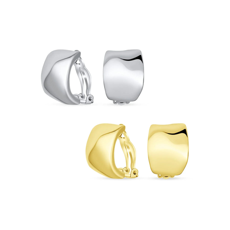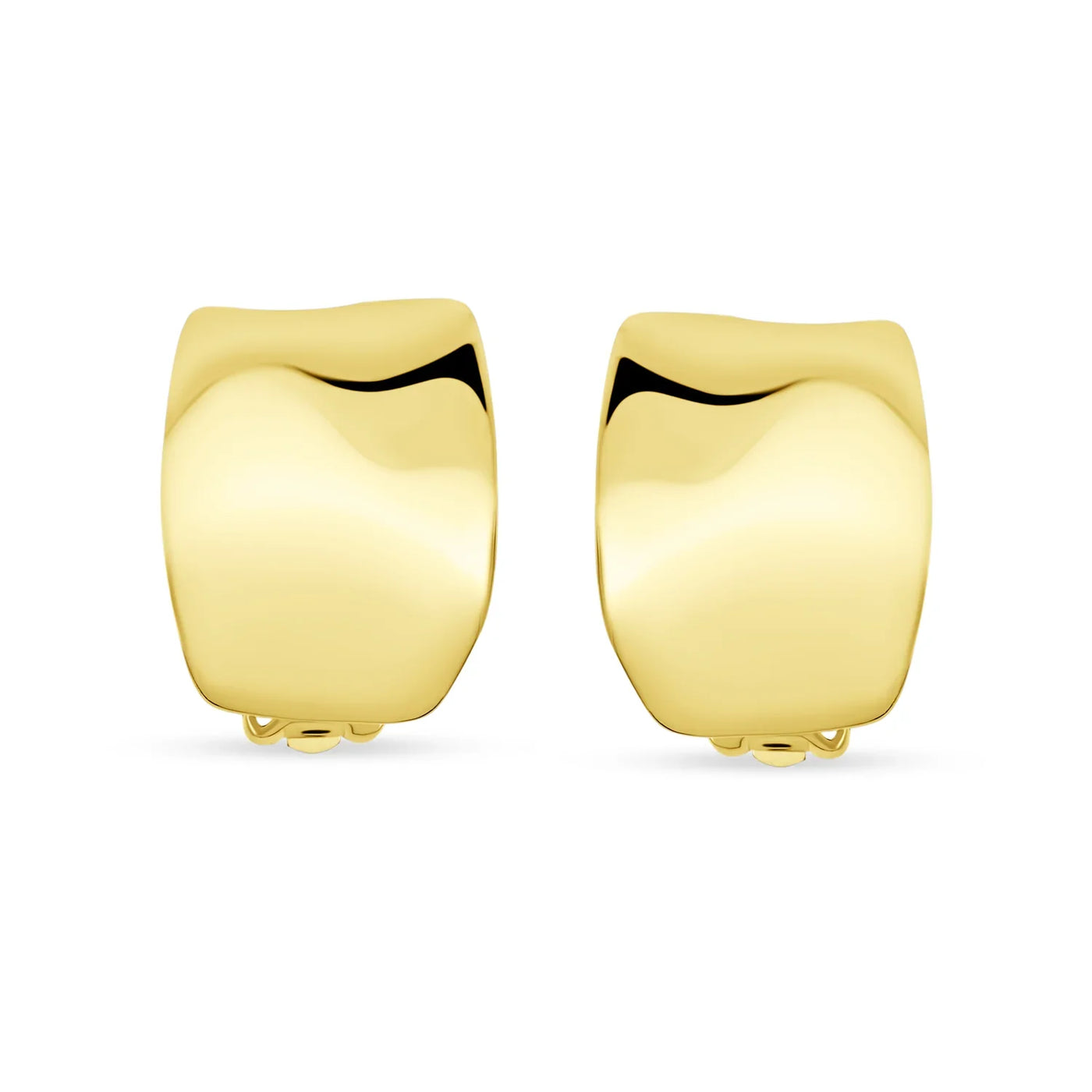 - Enhance your style with these modern huggie hoop clip-on earrings for non-pierced ears, featuring a gold-plated brass construction with a captivating hammered texture and an eye-catching geometric design on half hoops.