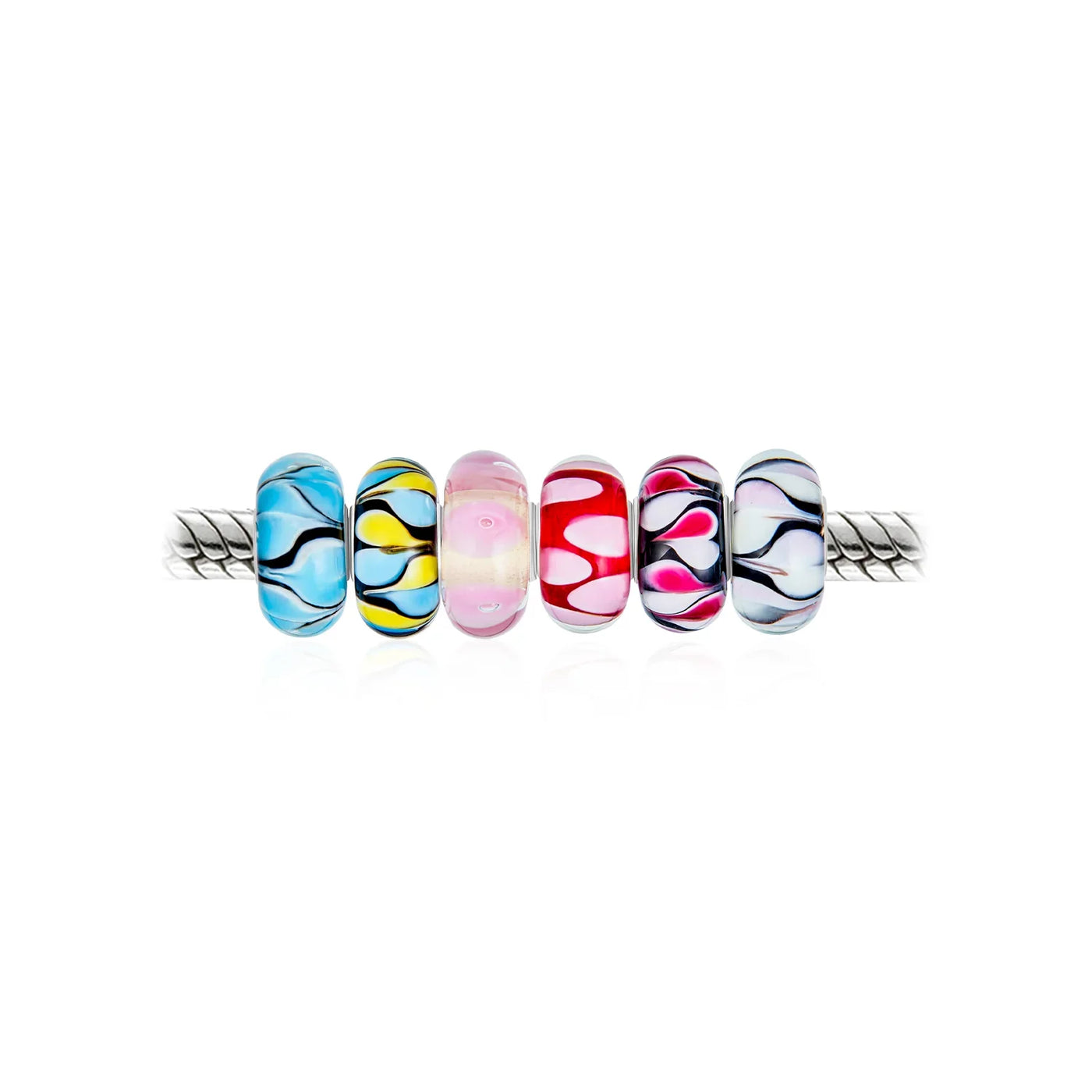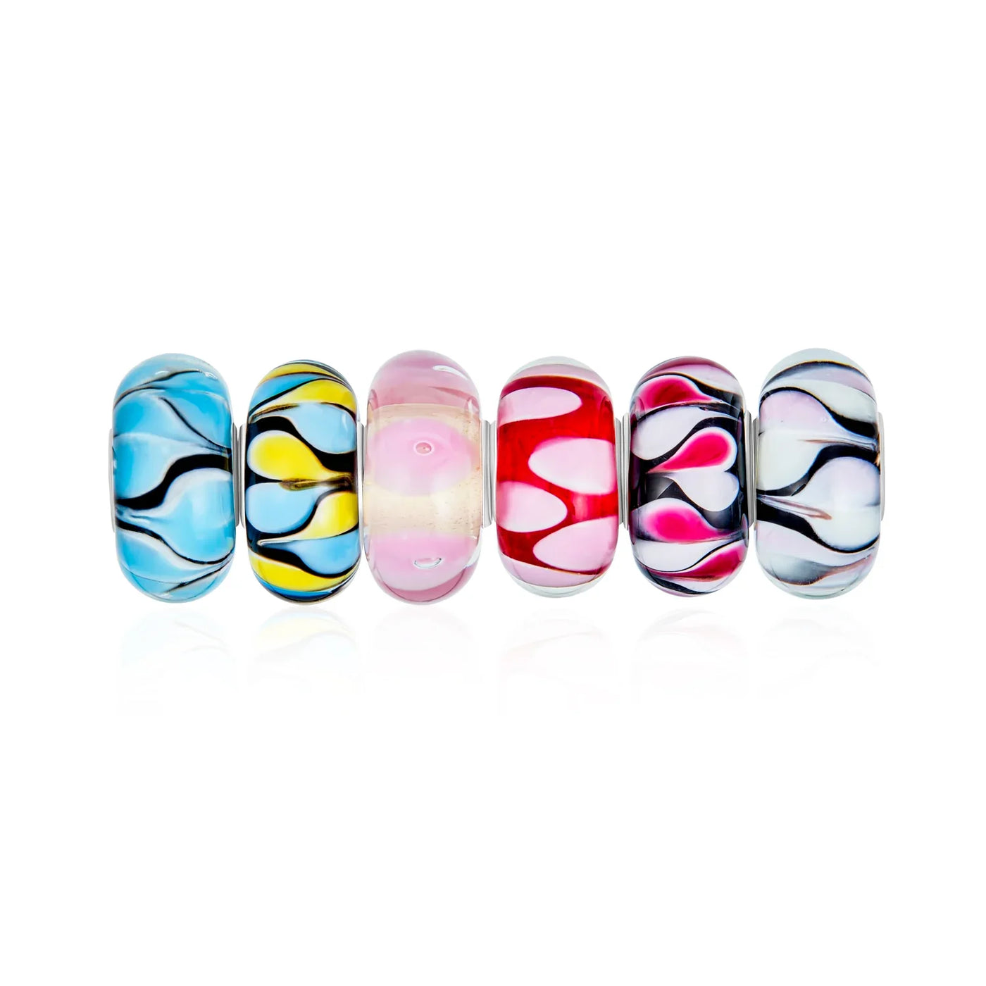 - This Pastel Dot Murano Glass Bead Bundle includes six festive, glistening beads. Each bead is .5 inches in diameter with a 4mm .925 sterling silver core. The colorful assortment features bold combinations like pale Simulated Turquoise and black, dark red and pastel pink, and black and white. Perfect for personalized European Story bracelets, these Murano Glass Beads stand out. Ideal for gifts or adding to charm bead bracelets. Available in various patterns: love beads, crystal beads, heart beads, and more. Fit for bracelets, necklaces, earrings, or key chains.