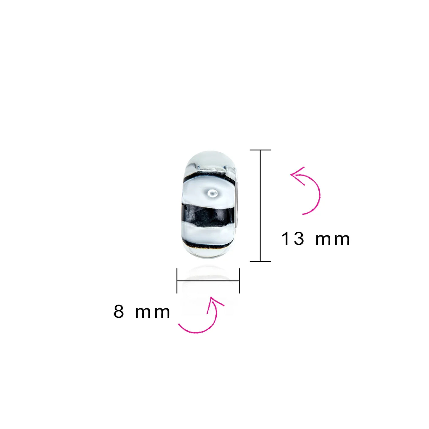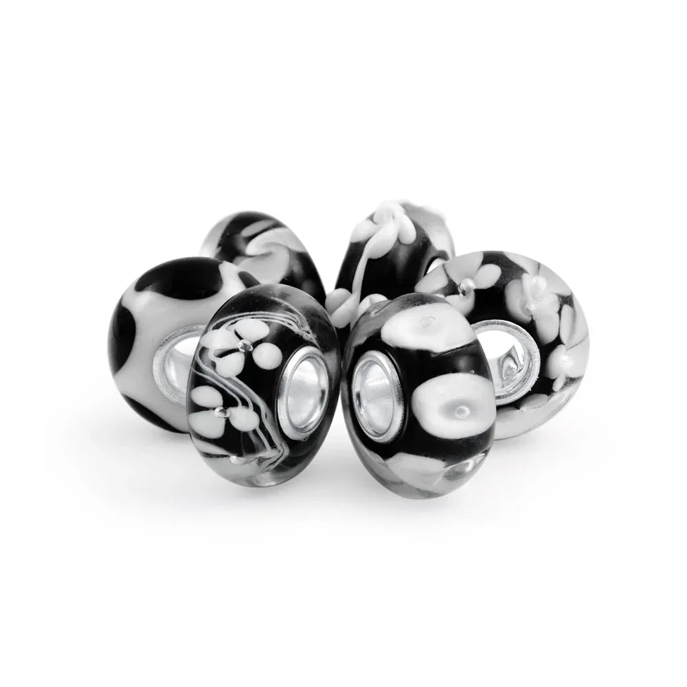- This Assorted Black White Murano Glass Bead Bundle includes five artistically crafted round beads. Each bead features Murano glass and a 925 sterling silver core. The black and white beads add style to your charm bracelets. The set includes six unique beads: squiggle, morning glory, floral, swirl, and lamp work. Perfect for European Story bracelets.