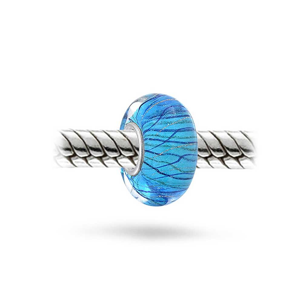 • This stunning sterling silver Murano Glass Bead evokes ocean waters. Navy blue, green, and gold foil lines resemble waves. This chic March birthstone charm adds glam to any beads bracelet. Charm jewelry effortlessly adds sparkling style.