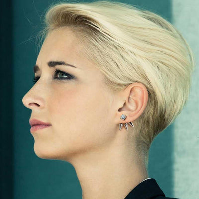 - A glam take on one of the newest ear silhouettes around, our newest detachable CZ ear jackets are suspended from a round, clear cubic zirconia stud and are made in an up to the minute, modern spiked design. Exuding confidence and style, these ear jackets are crafted from 925 sterling silver that has been plated with rhodium for a dramatic look. With the shimmering CZs made on a post with a friction back that attaches to the ear jacket, a slightly curved design of three spikes are meant to peek out from just under the lobe. With eye catching style, it is easy to create a signature look this season with a new pair of silver ear jacket earrings. Perfectly convertible, you can wear these ear jackets with or without the detachable rhodium plated sterling silver spiked cones.