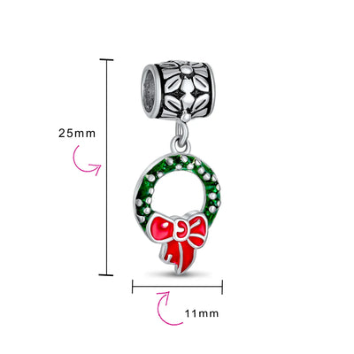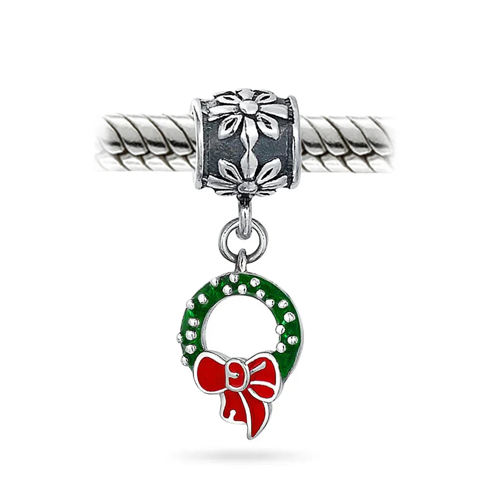 - Enhance your holiday decor with our exquisite Christmas wreath charm. Cherished for centuries, it captures timeless beauty and tradition. Crafted meticulously, this dangling Xmas charm is perfect for your beads bracelet. Vibrant red and green enamel with Sterling Silver accents add elegance. Ideal for bracelets or bead jewelry necklaces. The circular wreath symbolizes eternity and the unending circle of life. Hang it on your door, mantle, or window for festive spirit. Its 5mm bead core fits various bracelet styles. Celebrate the holidays in style with this beloved Christmas charm.
