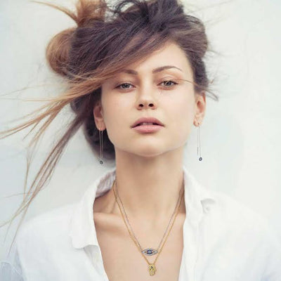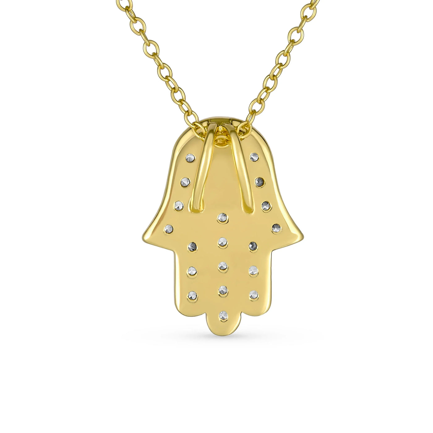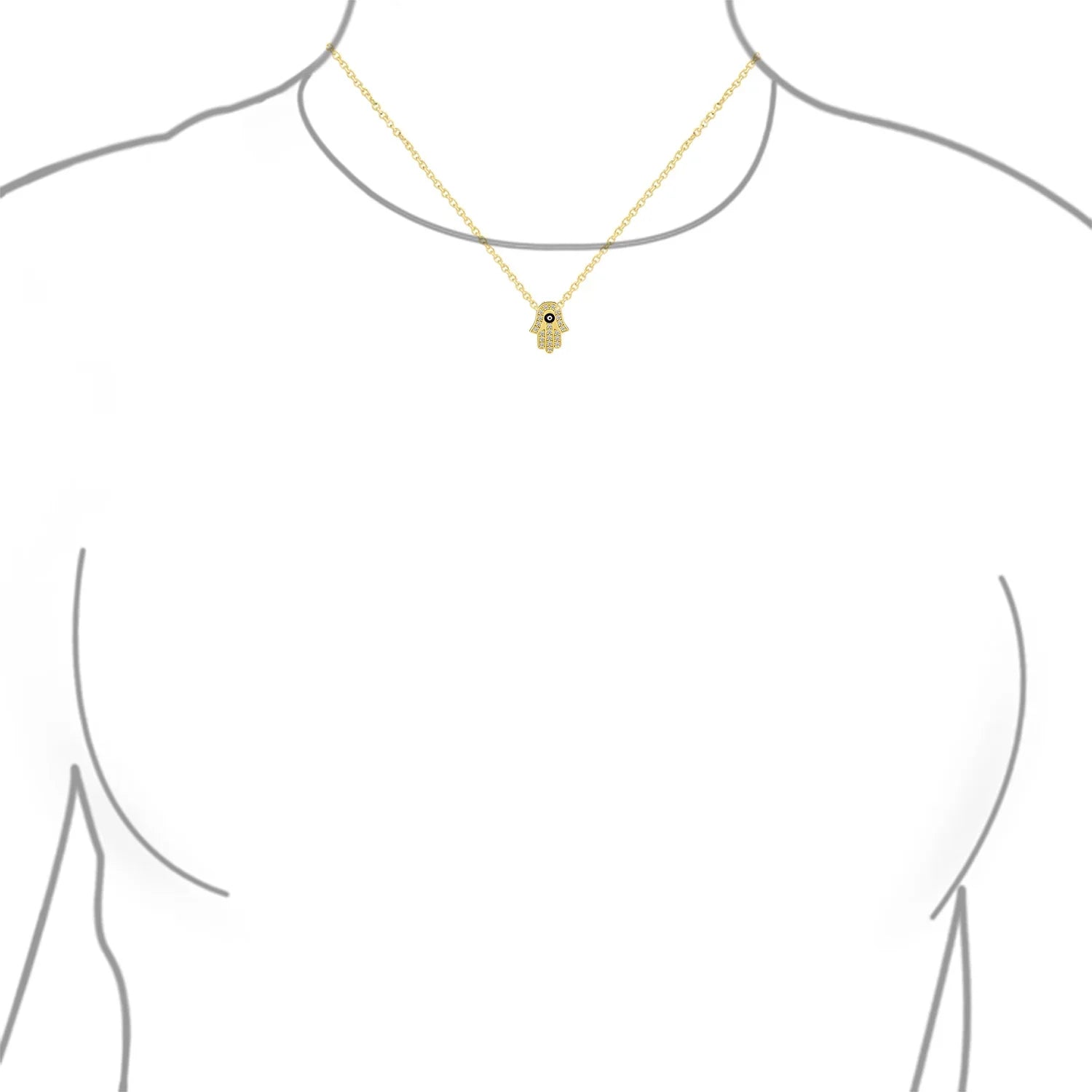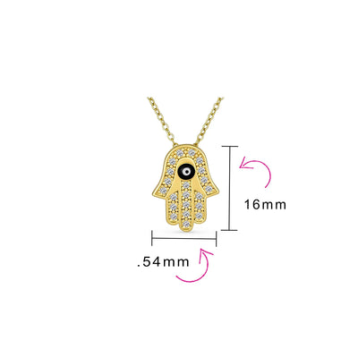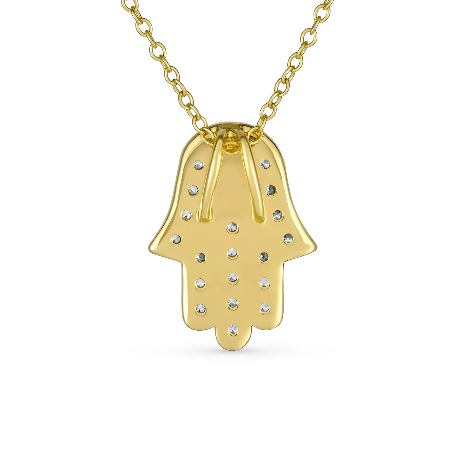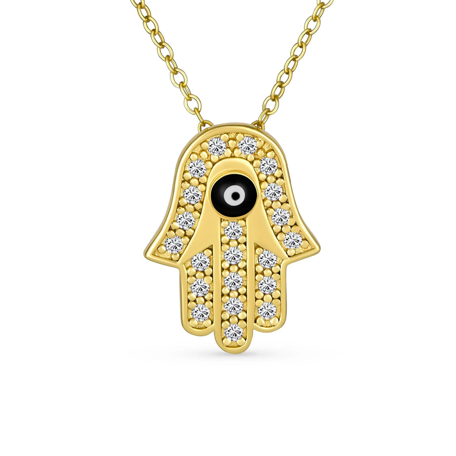 - Stylish and spiritual, our Gold Plated CZ Hamsa Hand Evil Eye Necklace evokes deep spirituality. This evil eye gold necklace features a distinctive design. Destined to become a treasure in your jewelry collection. Evil eye jewelry has been cherished for thousands of years. The Hamsa symbol is believed to bring good luck and protection. Made from .925 Sterling Silver, this necklace will make you feel lucky day and night. Buy this inspirational Cubic Zirconia Hamsa hand necklace as a unique gift. Perfect for anyone who loves original and exotic jewelry.