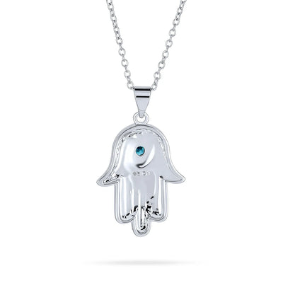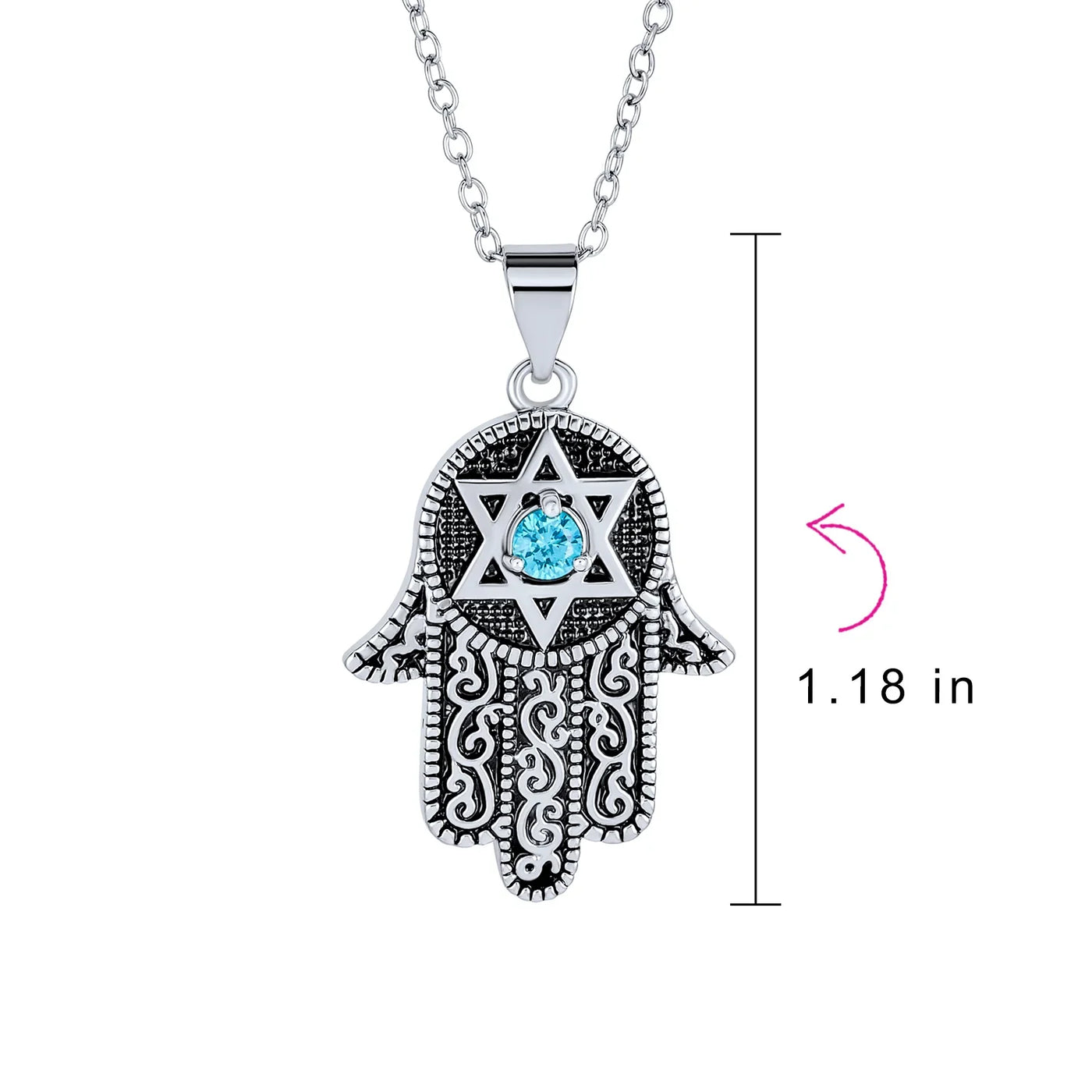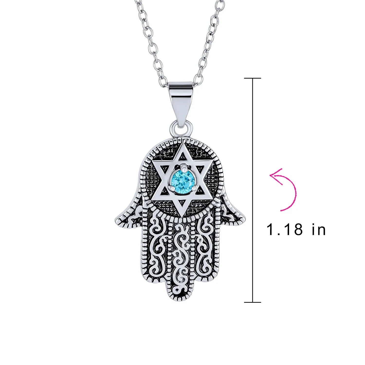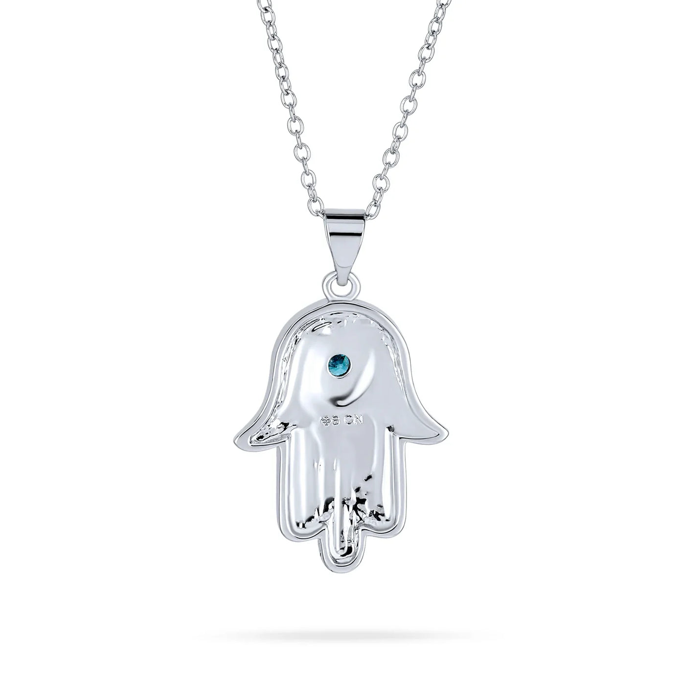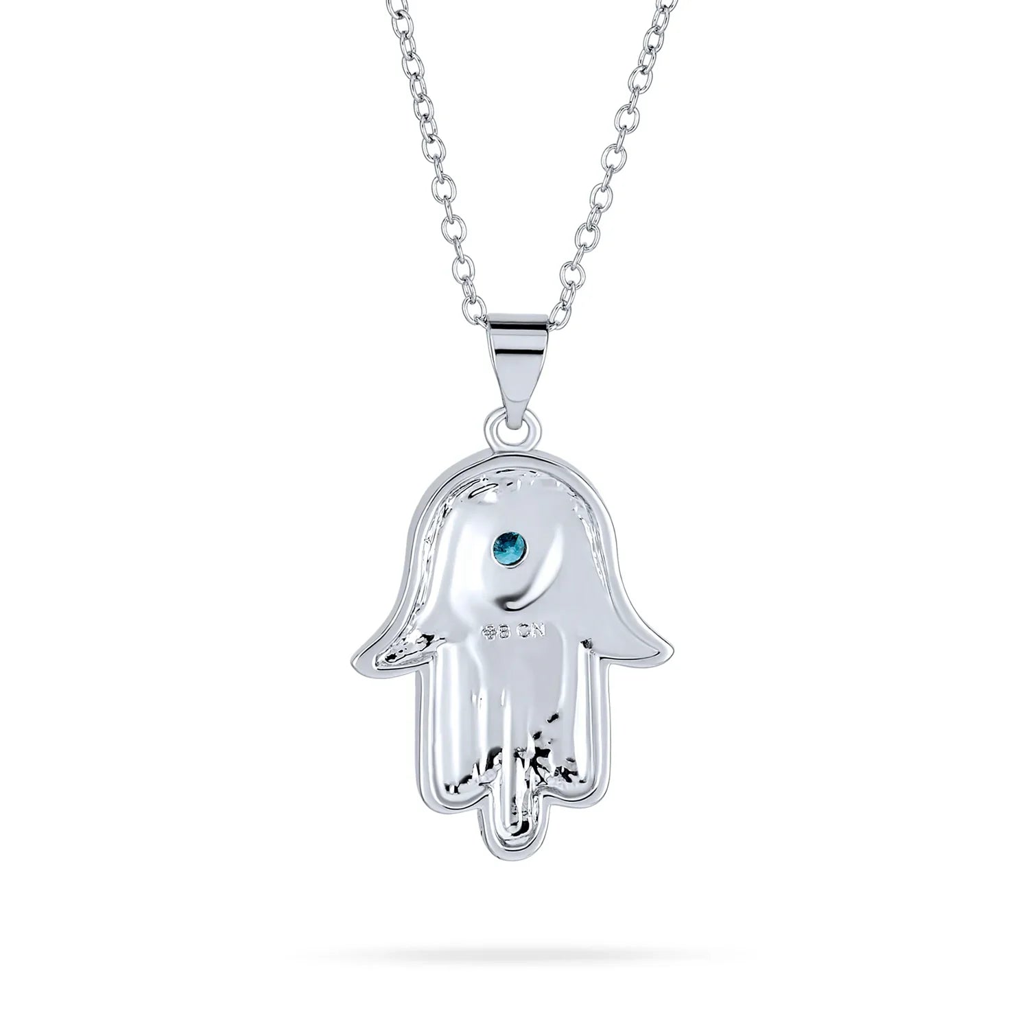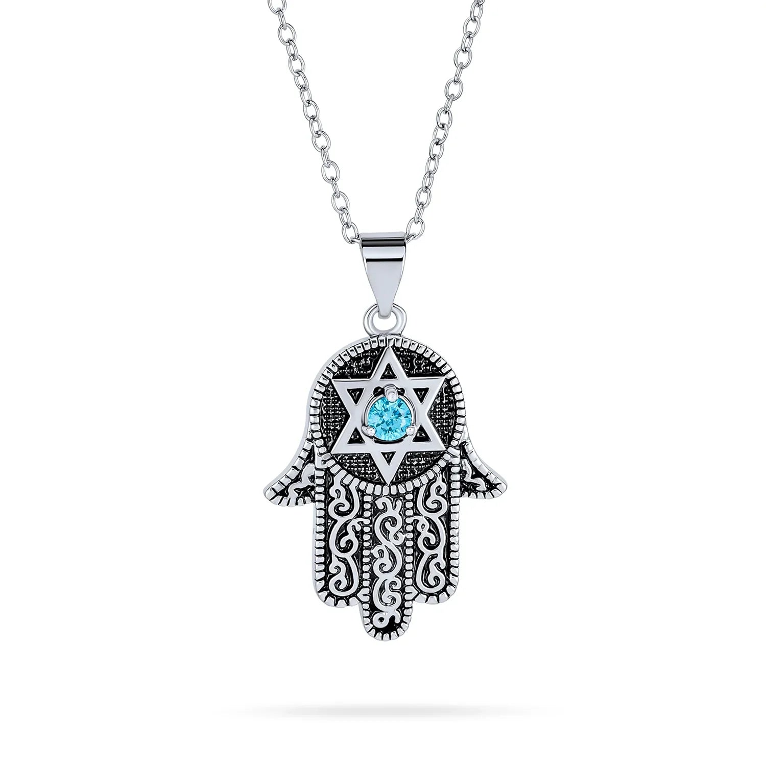 - A symbol of protection and luck, the Hamsa hand of God is beautifully crafted as a rhodium-plated charm on a chain, featuring a blue CZ at the center of an engraved Star of David for a modern twist on a classic emblem.