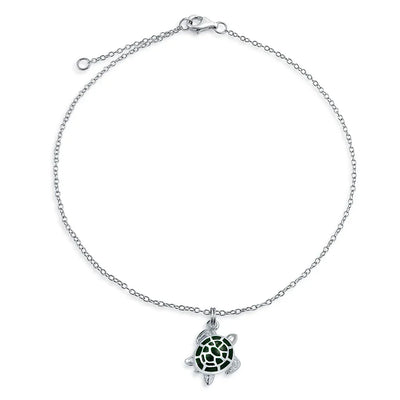 • Embrace the sea turtle's essence with our stunning ankle bracelet. Symbolizing creation, endurance, and strength, it embodies life's steadfast approach. Elevate your summer style with our chic sterling silver anklet. Featuring an adorable nautical turtle design, it's crafted with meticulous detail. Green Simulated Emerald enamel adds elegance to the turtle's body. The one-inch extender makes it versatile for all ages. Treat yourself or surprise a turtle-loving friend with this exquisite beach jewelry. Order today and indulge in the fashionable allure of our sea turtle ankle bracelet.