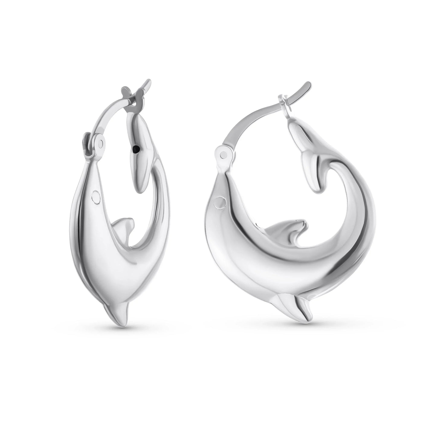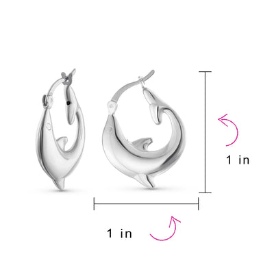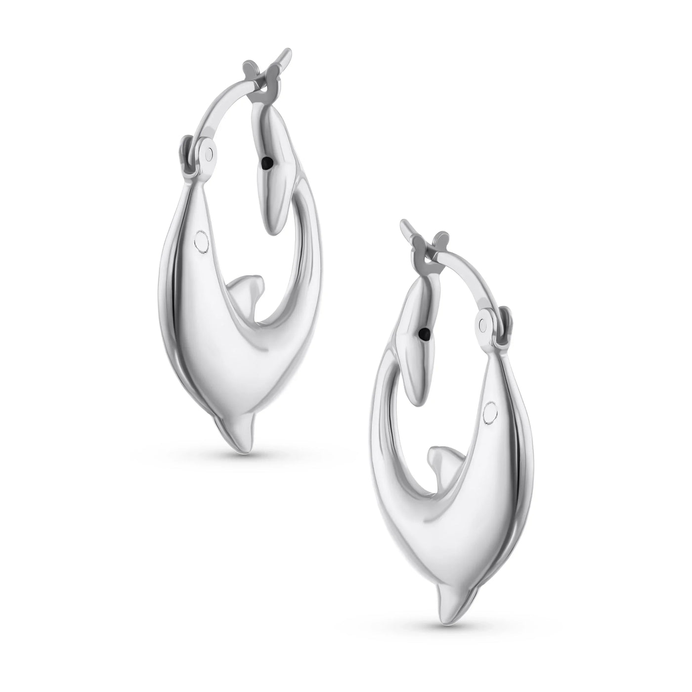 • Elevate your style with stunning sterling silver dolphin hoop earrings. Crafted with precision, these nautical-inspired earrings are perfect gifts. Mix and match with your nautical jewelry for a coordinated look. Pair with a business suit for a whimsical touch. Secure snap hinge back ensures all-day comfort. Lightweight design won't weigh you down. Dive into great style and enjoy dolphins everywhere you go.
