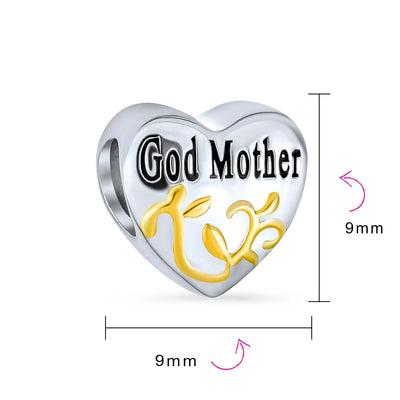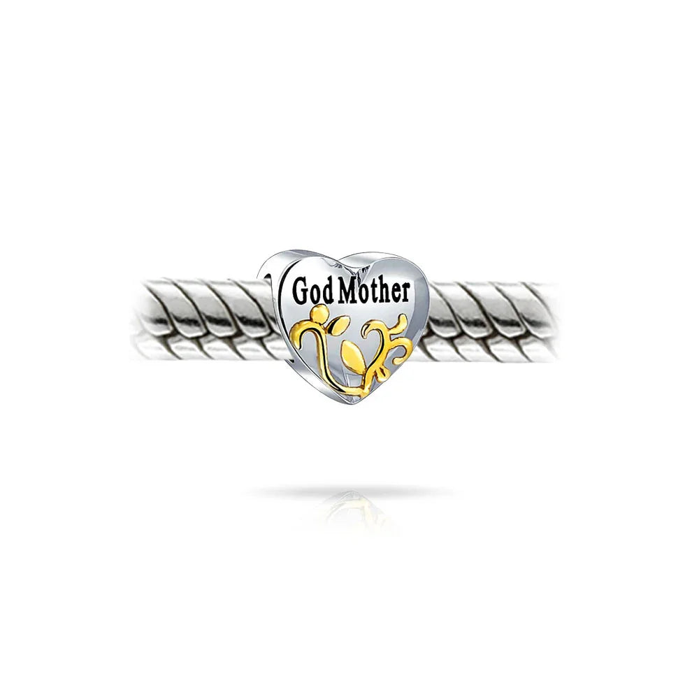 - Gift your Godmother extra love with this heart-shaped Godmother message bead. Crafted from 925 sterling silver, it features a 5mm bead core. The black-lettered inscription and gold-plated scroll vine motif add elegance. This tri-color heart charm enhances any beads bracelet, telling a unique story. Perfect for Mother's Day, it shows heartfelt appreciation.