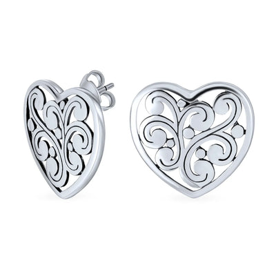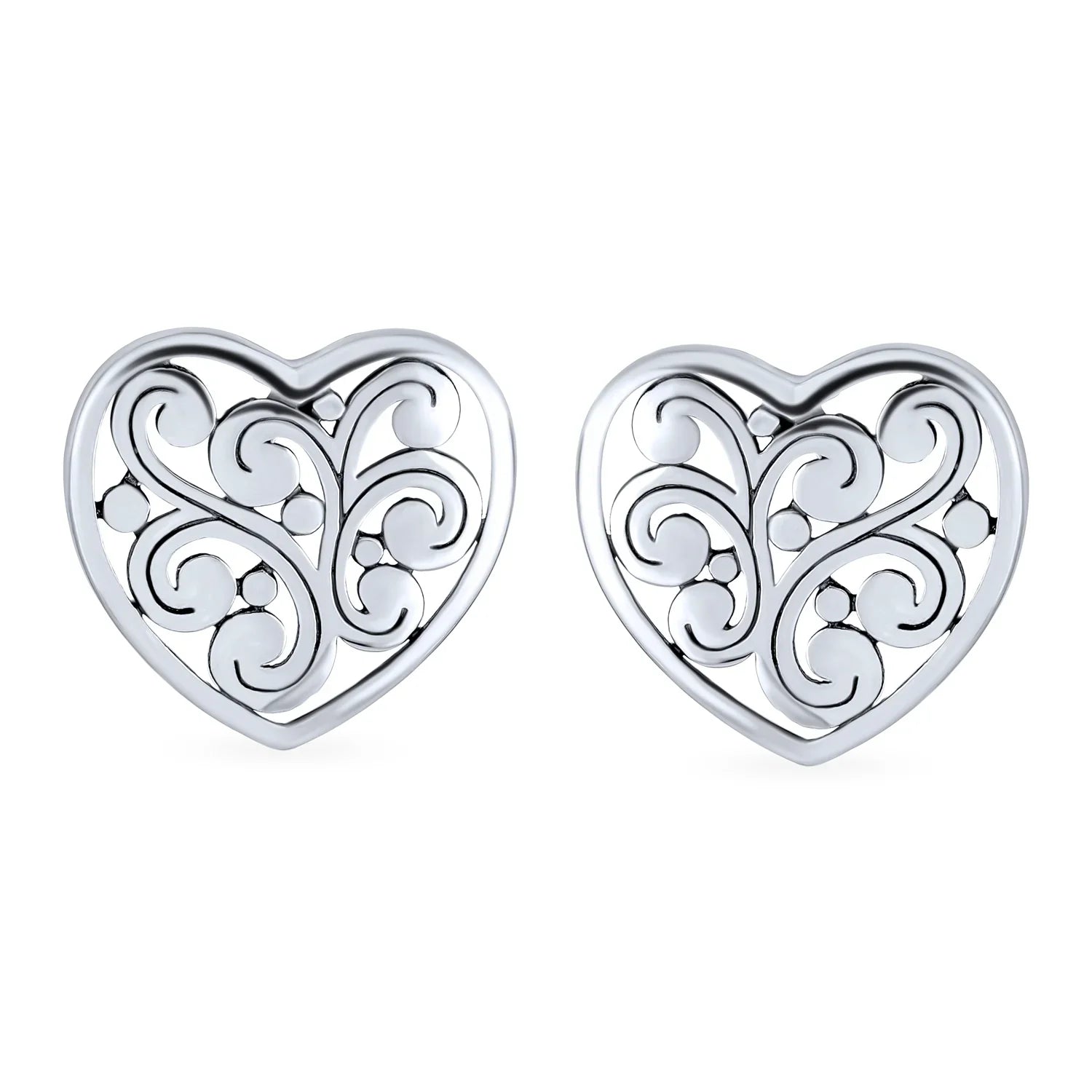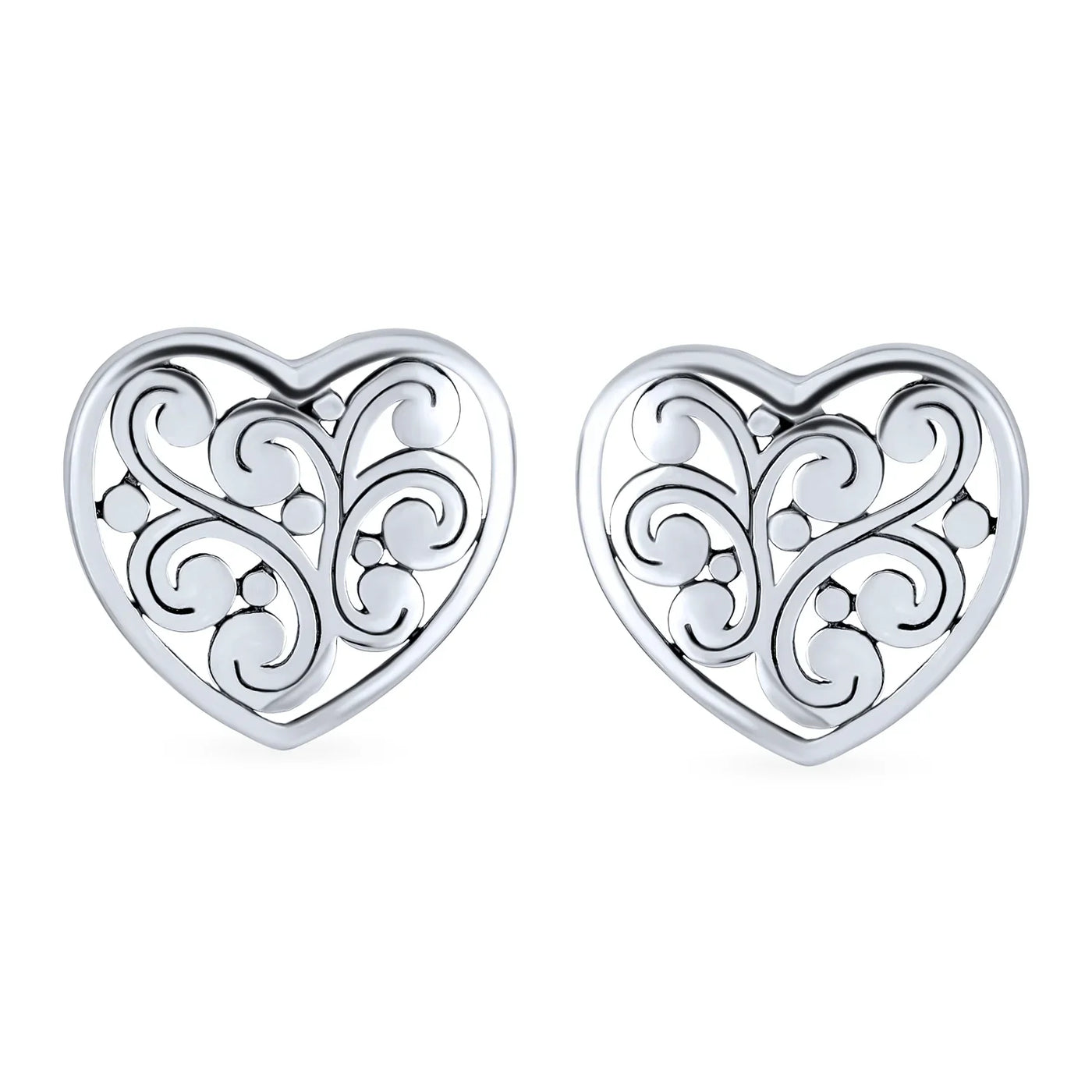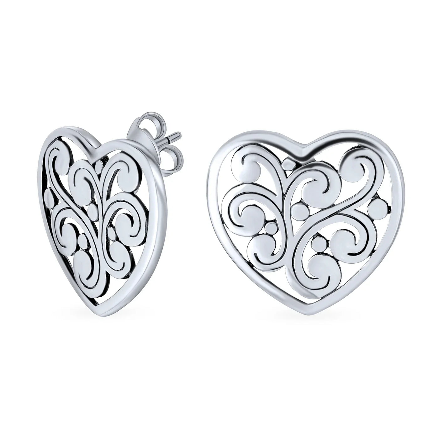 - Fall in love with these stunning heart-shaped stud earrings. Featuring intricate filigree scroll detail and oxidized 925 silver, they captivate. Perfect Valentine's Day gift for your sweetheart.