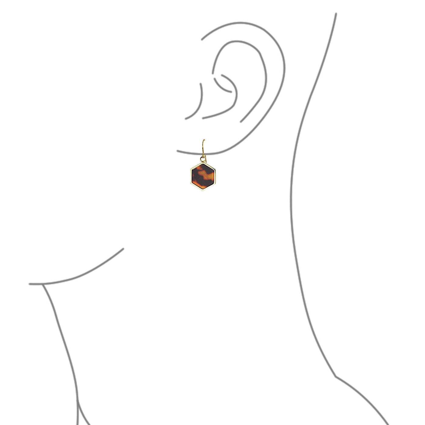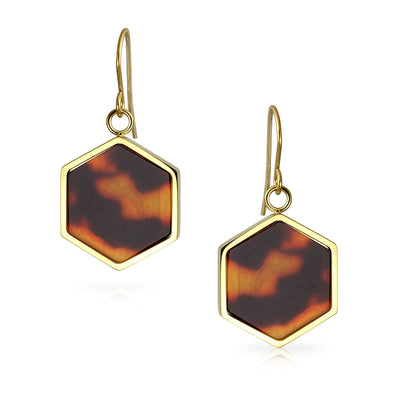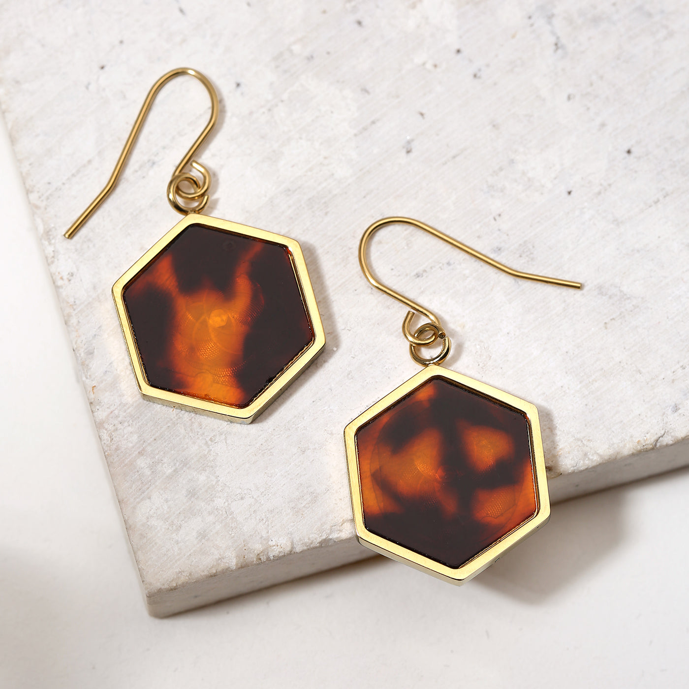 - These divine, gold plated stainless steel dangle earrings will infuse your everyday look with a dash of elegance. Accented by a hexagon shape featuring acrylic tortoise shell in an up to the minute, modern style.