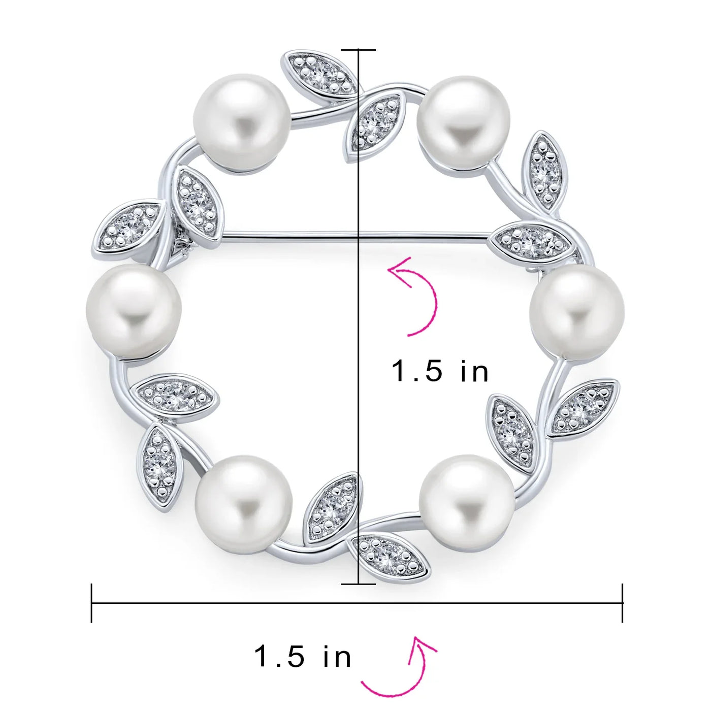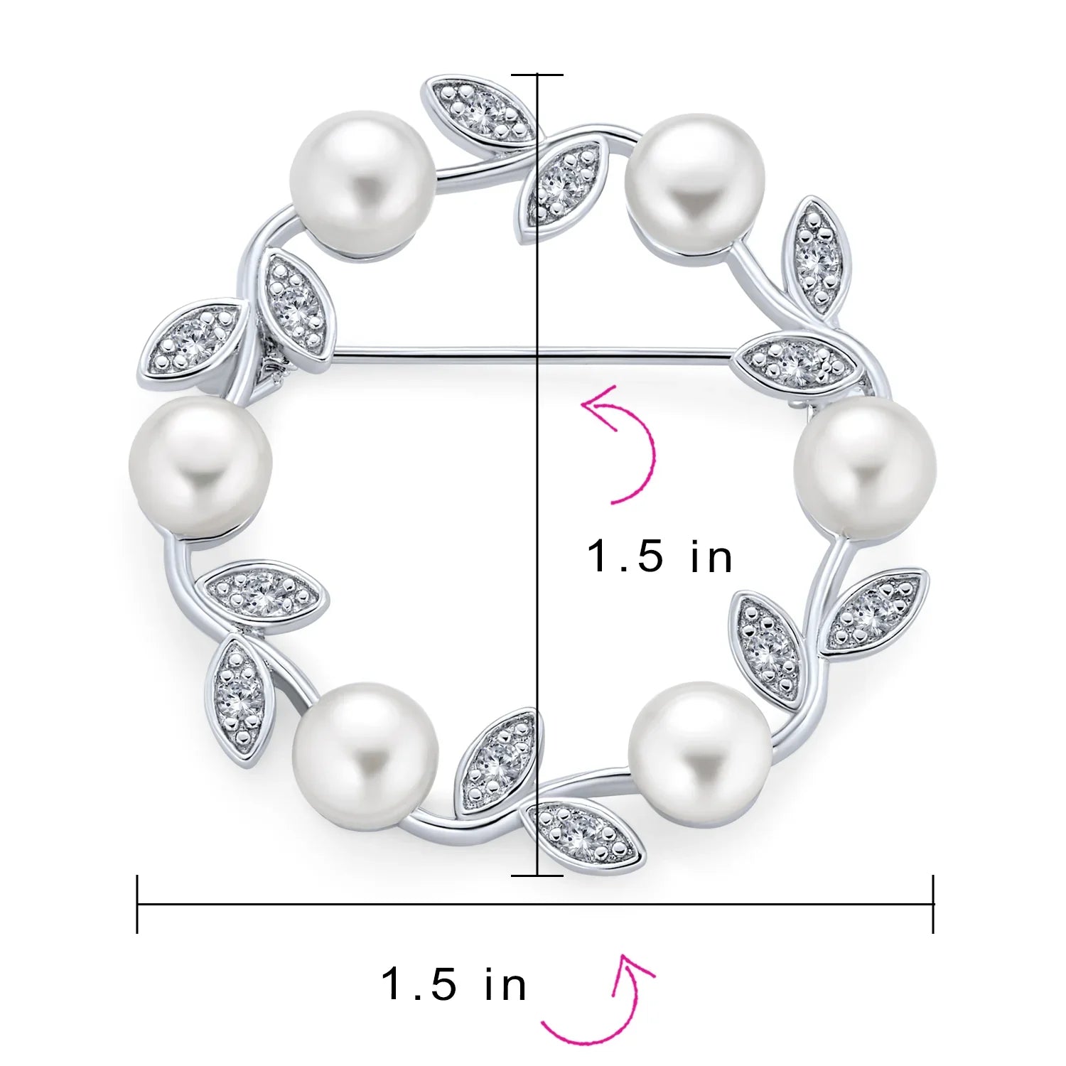 - Material: Rhodium Plated Alloy, Simulated Pearls, Cubic Zirconia Measure: 1.75 inch L x 1.75 inch W, Weight: 14 grams, High luster simulated pearls. Circle style with hinged clasp