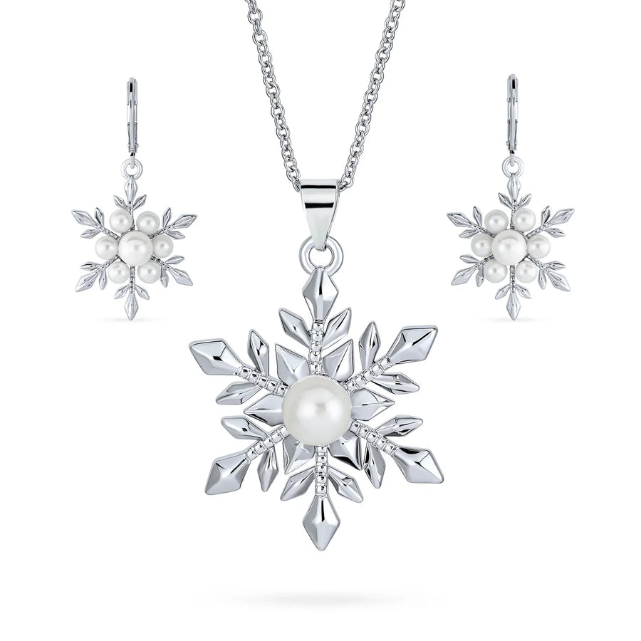 - Prepare for the winter season with our exquisite snowflake white pearl earring and pendant jewelry set. This stunning set features a snowflake pendant adorned with a 7mm simulated button pearl at its center, complemented by matching snowflake earrings with a secure Leverback clasp.