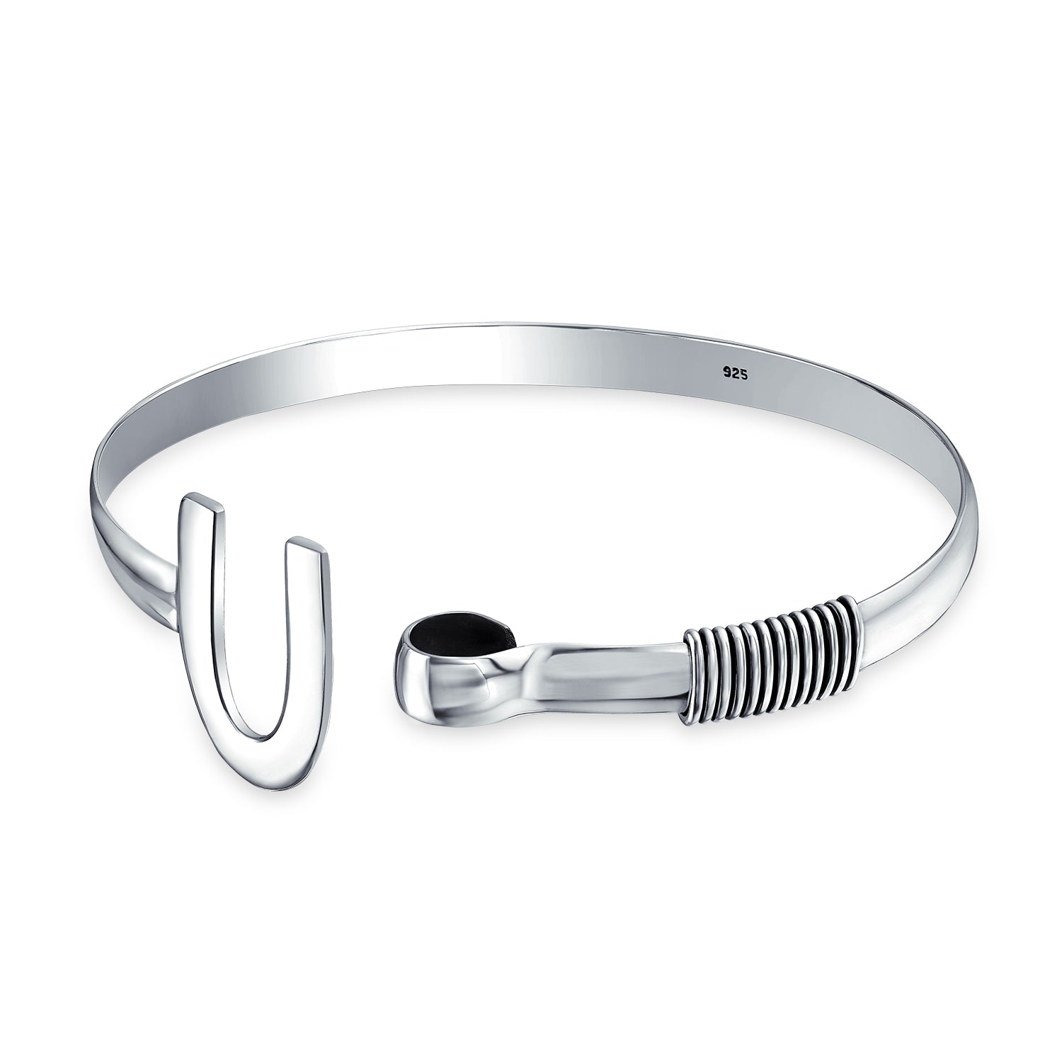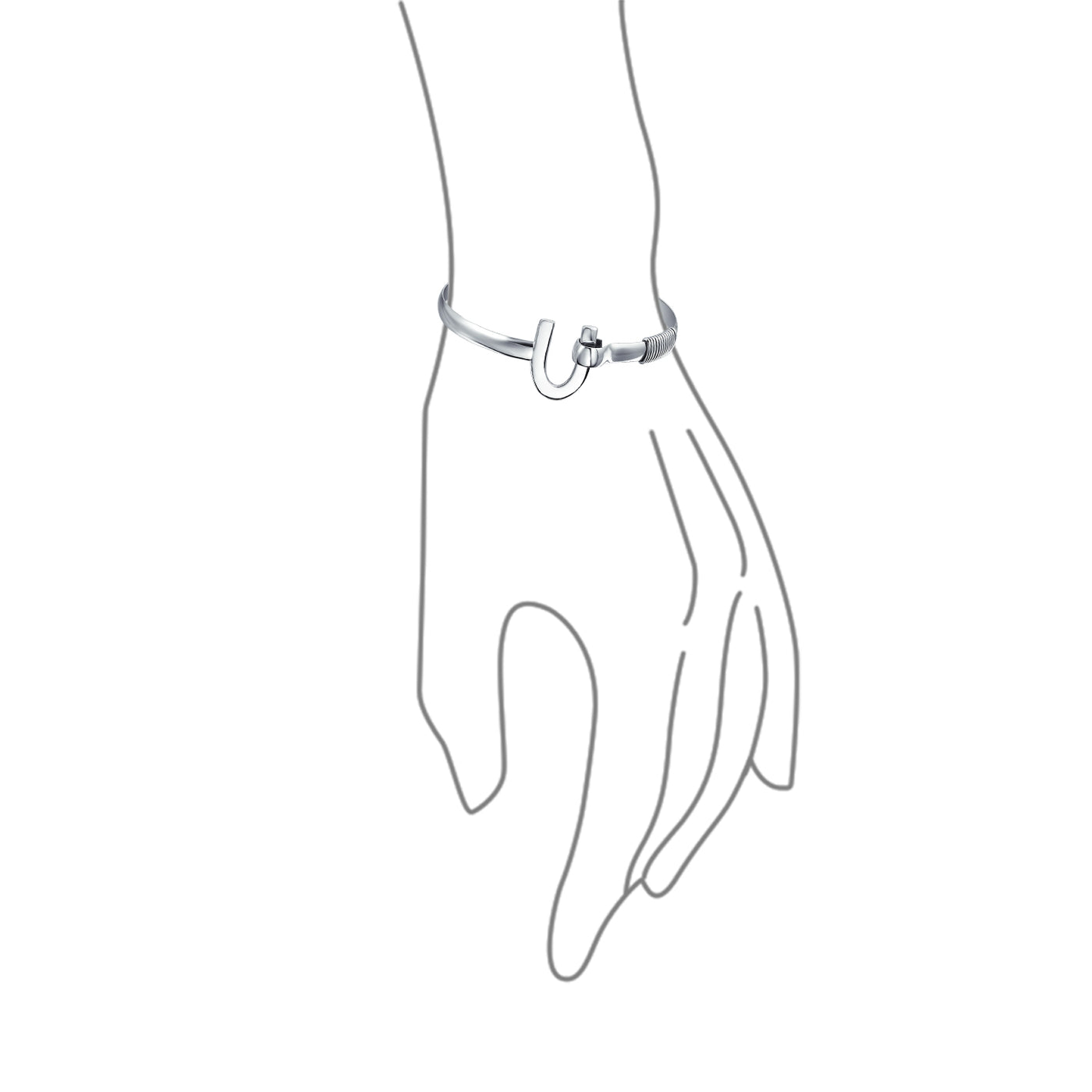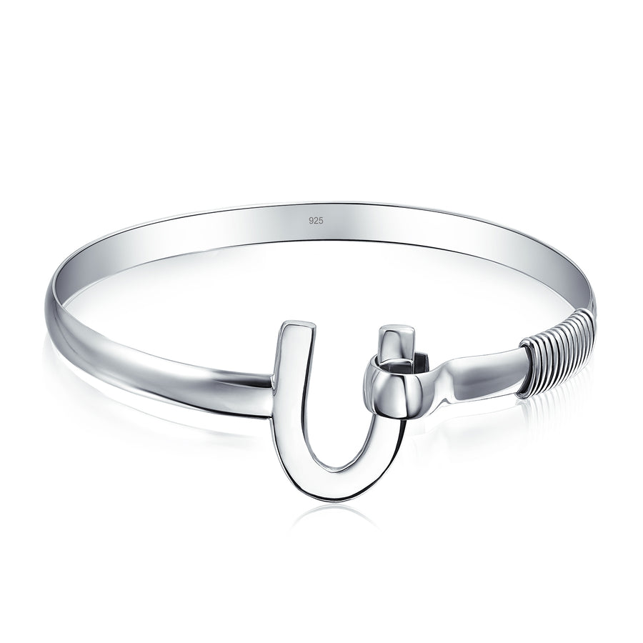- Enhance your look with this .925 silver bangle bracelet , featuring a modern horseshoe motif. Sleek design with a unique hook clasp. Ideal for equestrian enthusiasts, this bracelet is a timeless, elegant accessory.