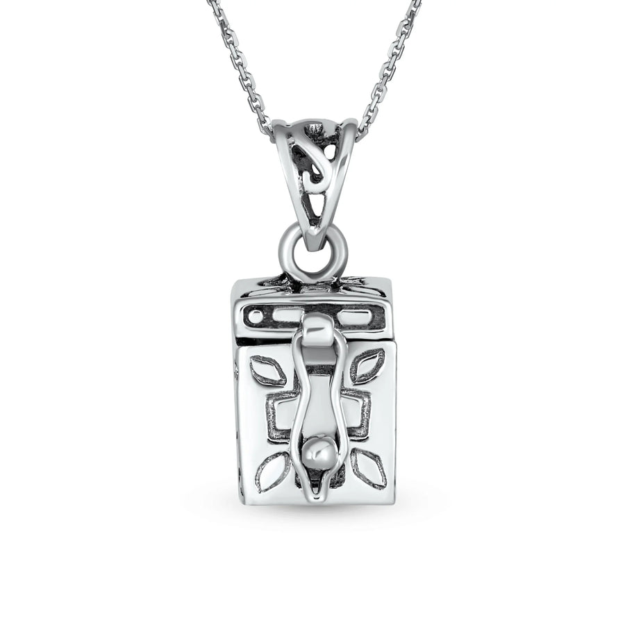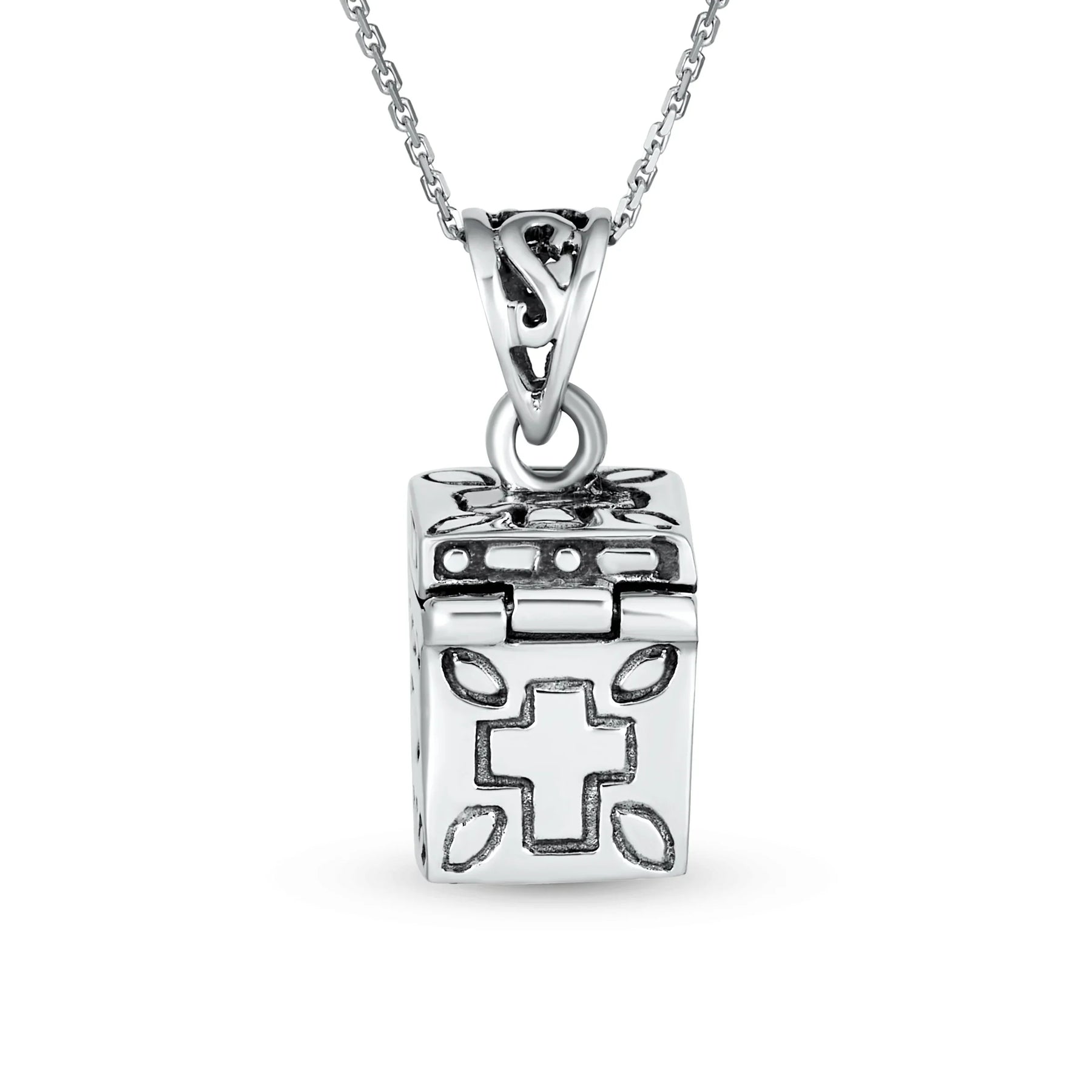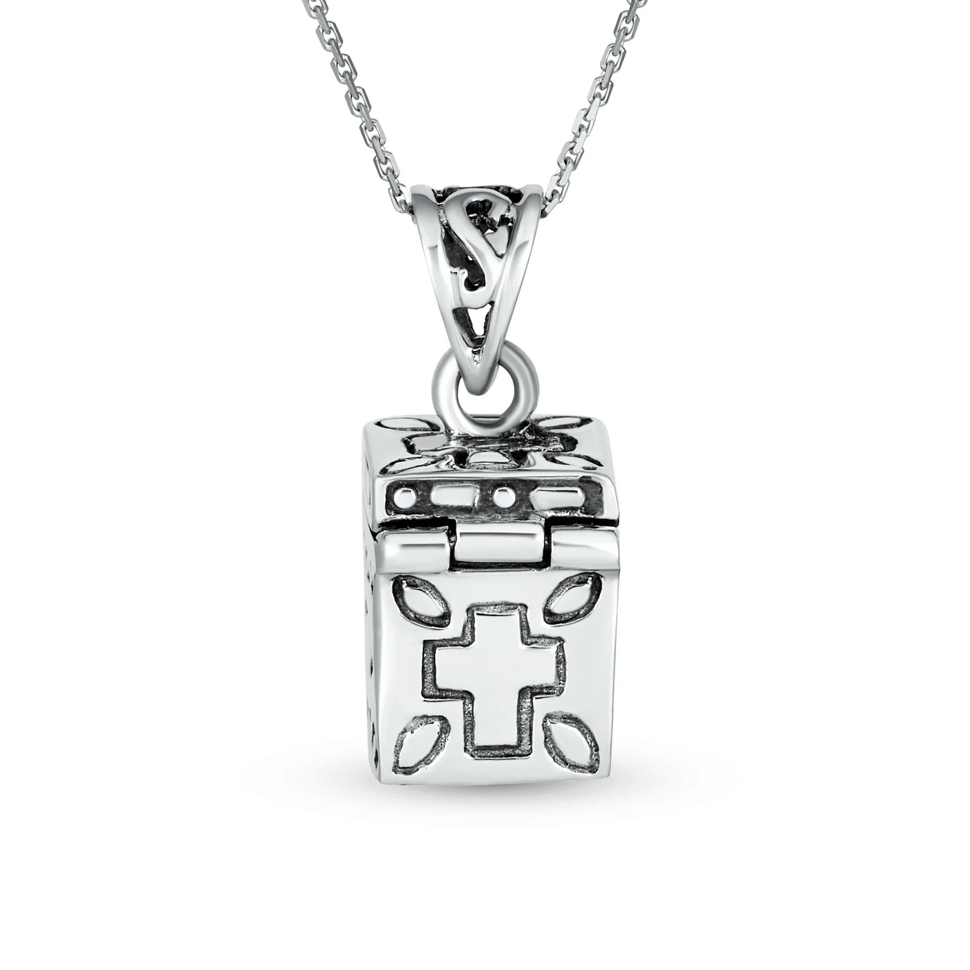 - Discover the allure of exotic elegance with our .925 Silver Antique Style Poison Prayer Box locket Pendant with Ichthys. This stunning Celtic jewelry piece, under one inch square, is a true masterpiece. Meticulously crafted, it features a timeless fish and cross design. Prayer boxes hold deep personal significance and inspiration. Our prayer box necklace keeps cherished mementos close to your heart. It symbolizes love and connection, perfect for sharing with loved ones. Gift this pendant locket to show appreciation for someone special. An 18-inch Rolo chain is included for comfort and style. Embrace the elegance and meaning of this Antique Style Poison Prayer Box locket Pendant. Make a statement of unique taste and spirituality.