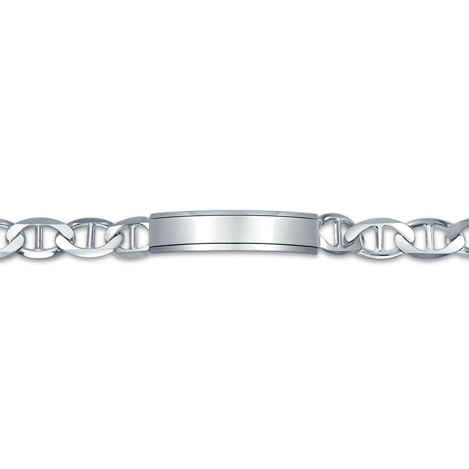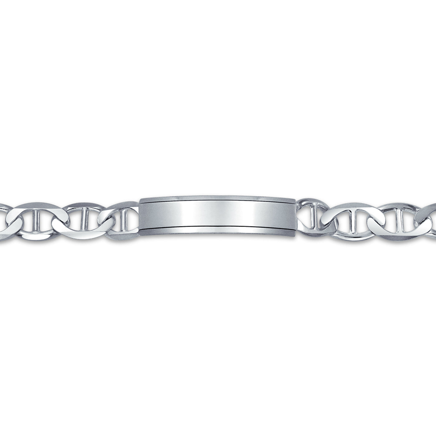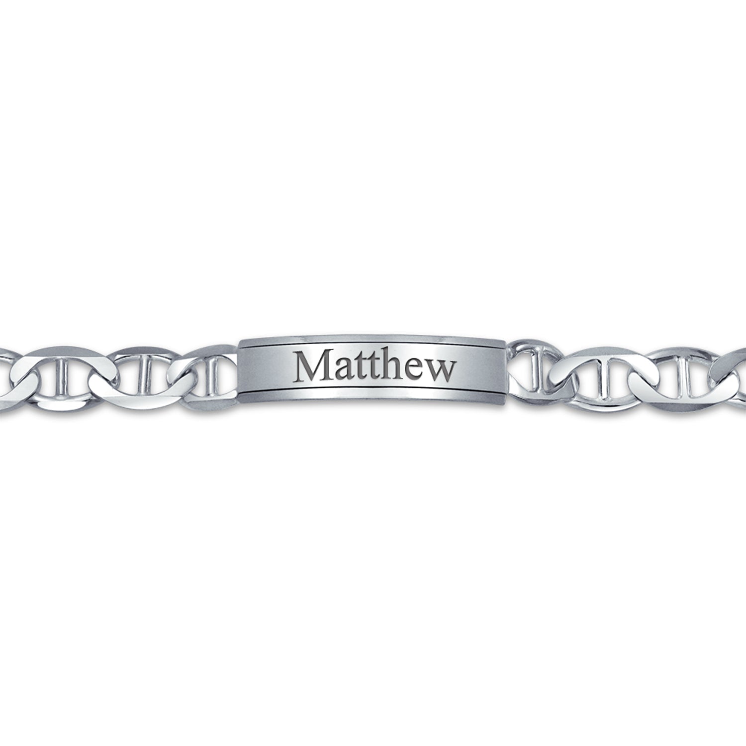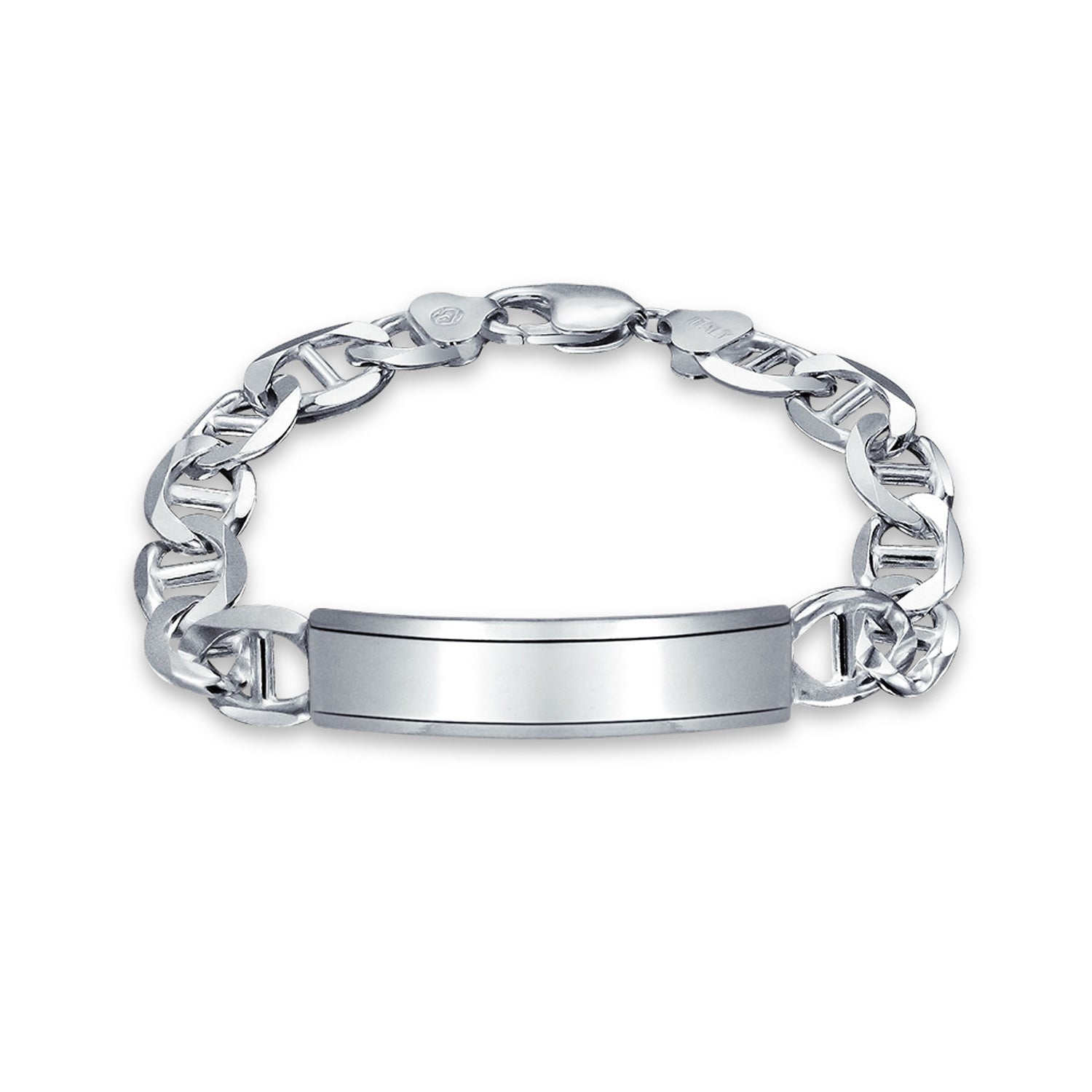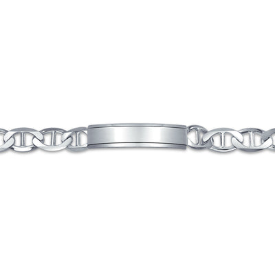 - Elevate your style with this stunning identification bracelet that exudes masculine charm. Crafted with a sleek mariner link chain, this bracelet showcases a rectangular name id tag at its focal point, adding a touch of sophistication. It boasts impeccable craftsmanship and a lustrous finish that will surely turn heads.
