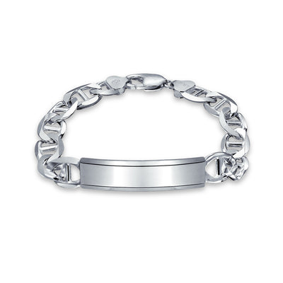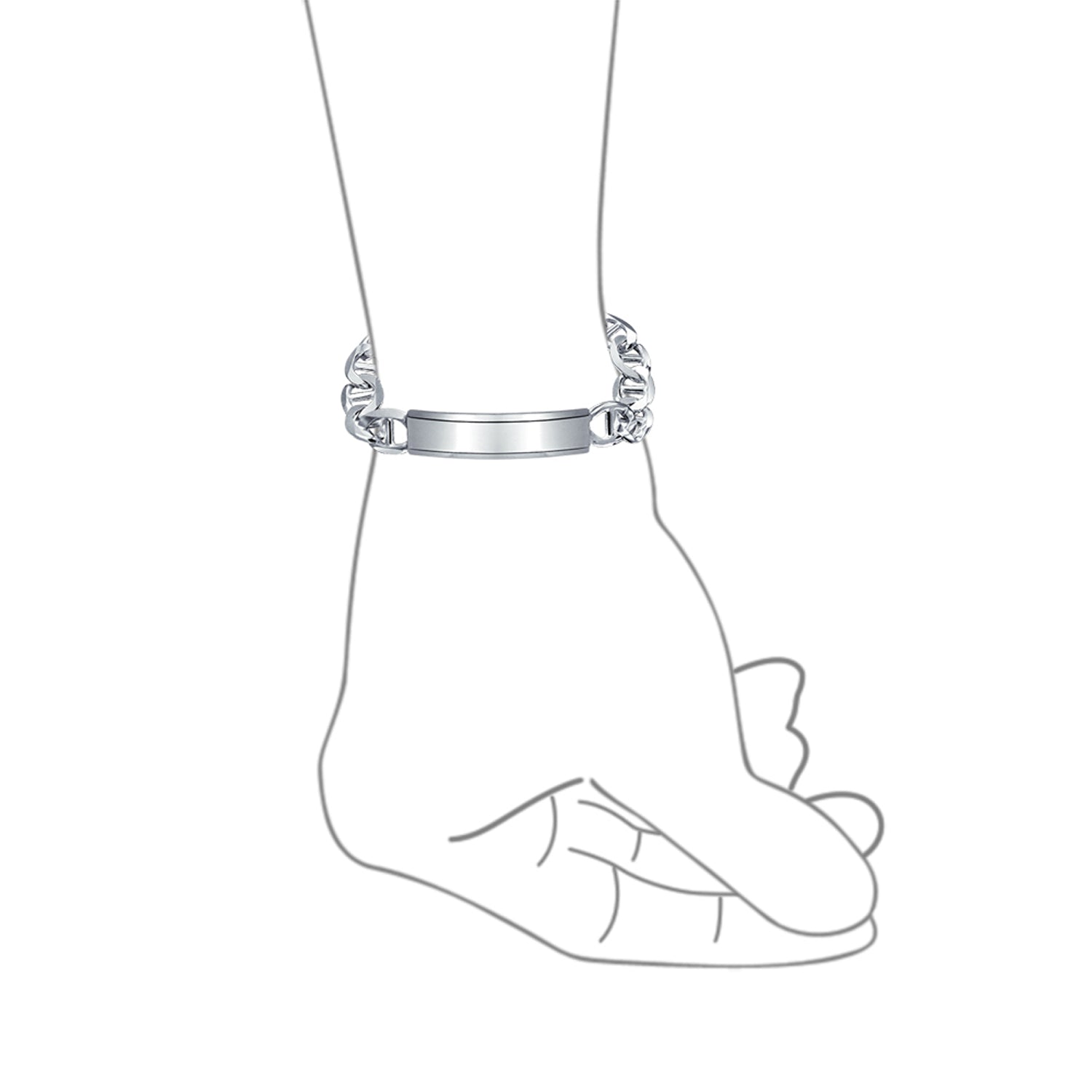 - Introducing our exquisite sterling silver identification bracelet, exuding pure class and elegance. The sleek 1.5" x 0.4" name plate can be personalized with engravings. Showcase your friend's initials or your own name for your beloved husband. This bracelet doubles as a stylish accessory and a medical ID bracelet. Engrave your specific illness or affix a discreet sticker on the back. The sterling silver composition ensures a brilliant shine and exceptional quality. Attached to an extra-large mariner chain, it exudes strength and masculinity. Built to last a lifetime, it's a wise investment. Purchase yours link ID Bracelet today and elevate your style with unparalleled sophistication.