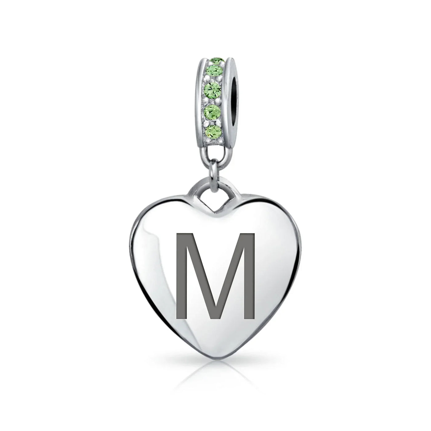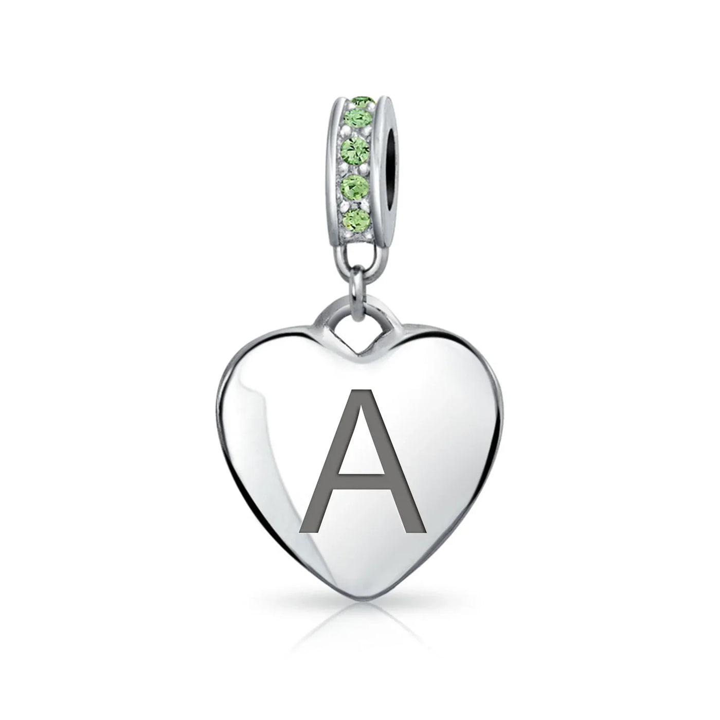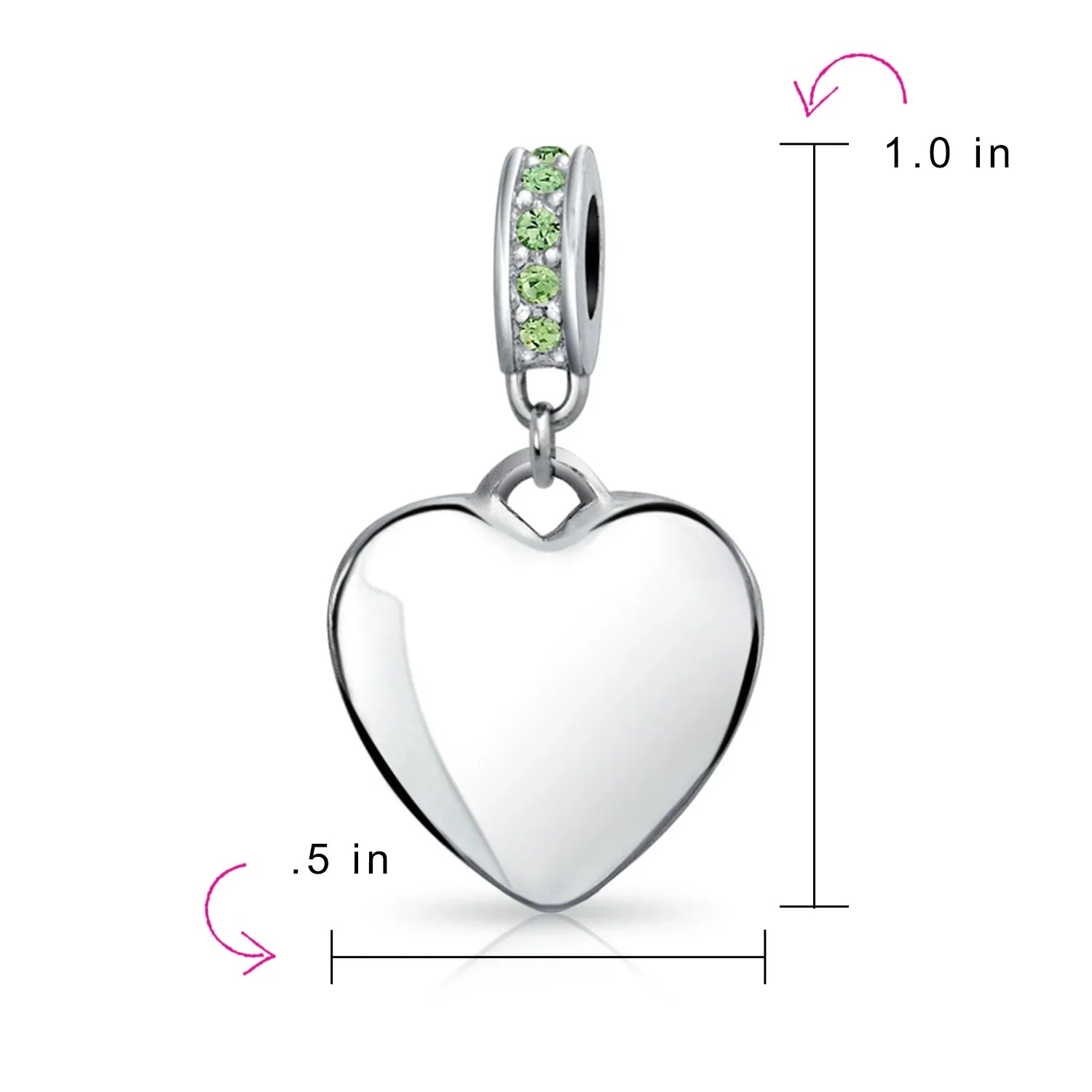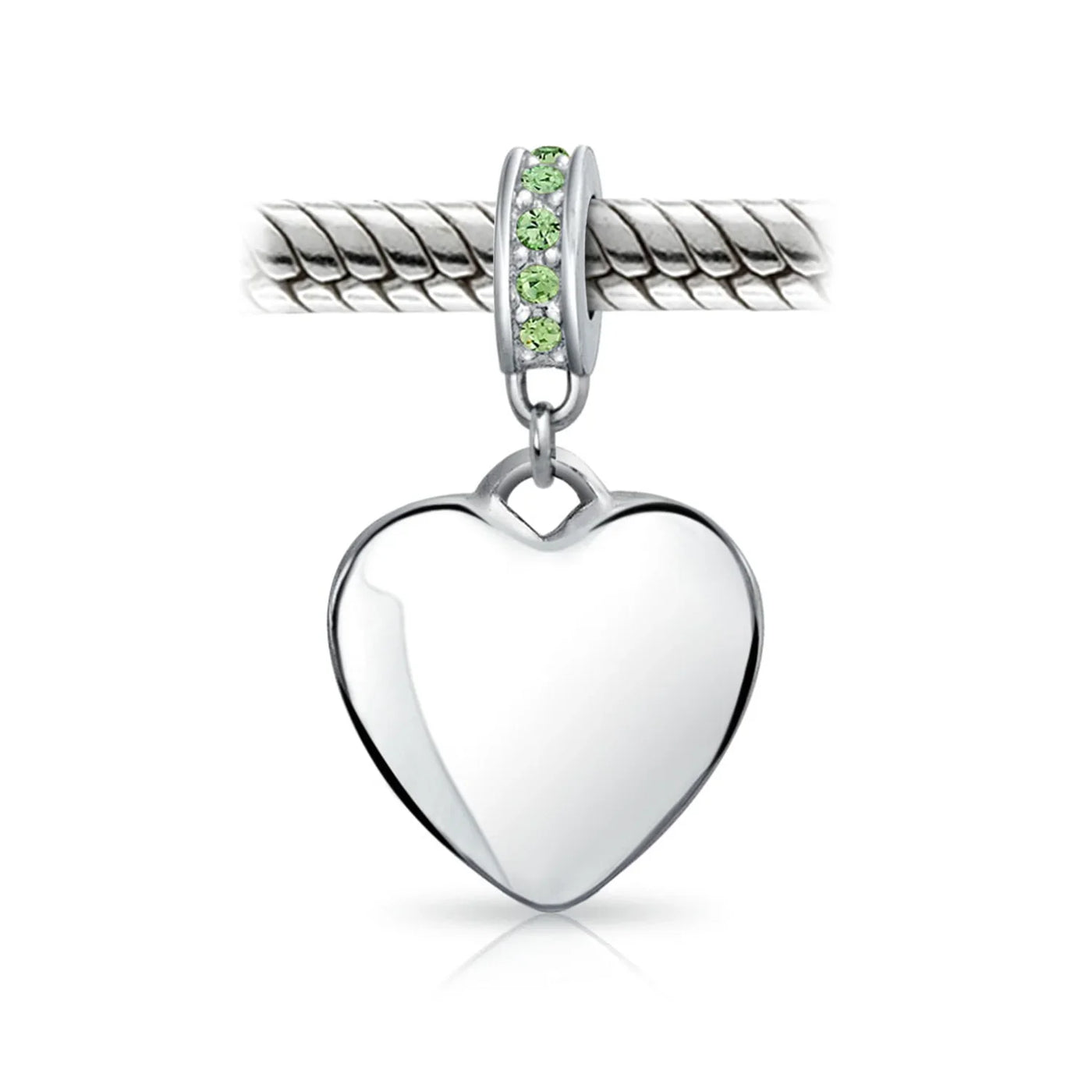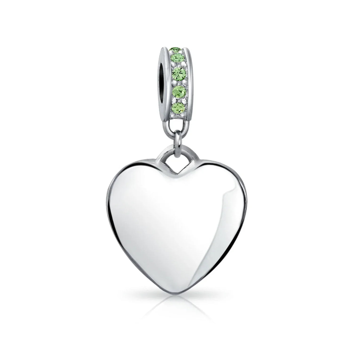- Why not engrave names inspirational message, letters, numbers, date or coordinates. This modest polished heart shaped charm hangs from a 4.5mm unthreaded core and holds a single, elegant green simulated Peridot August birth month color, perfect for bringing that unique something to your bead story.