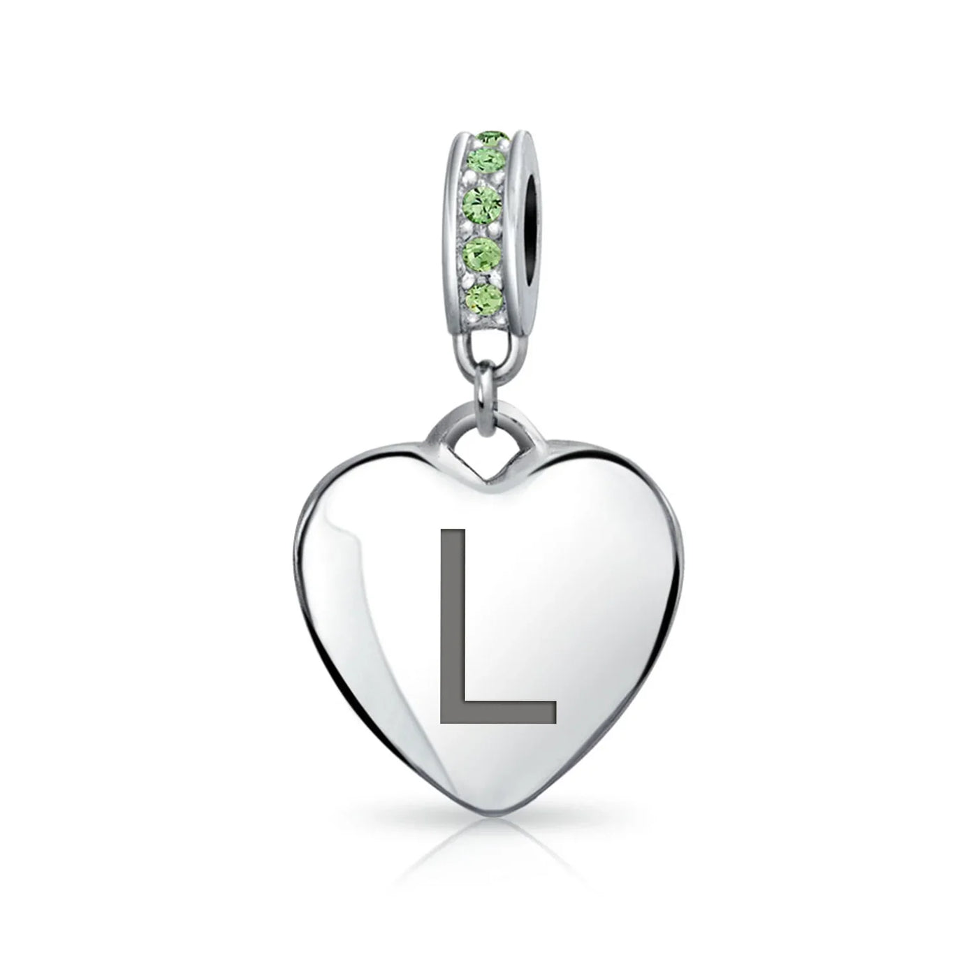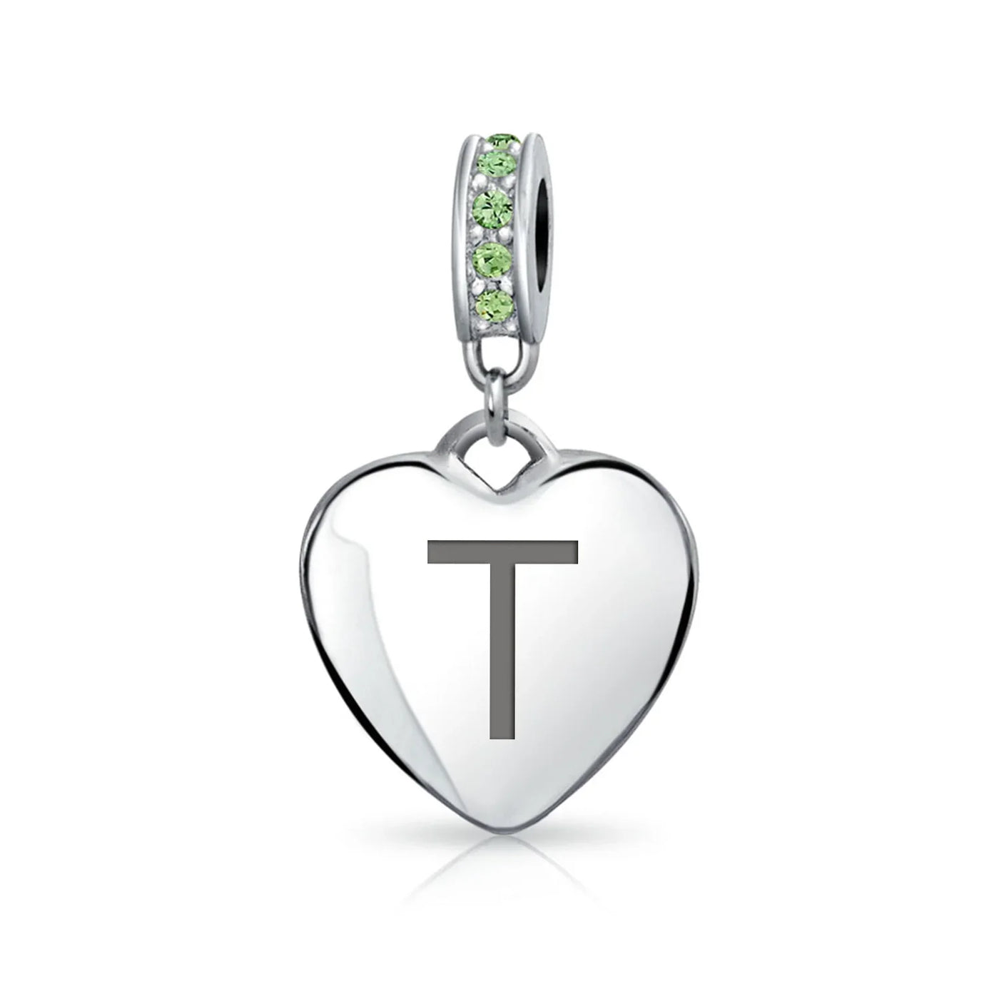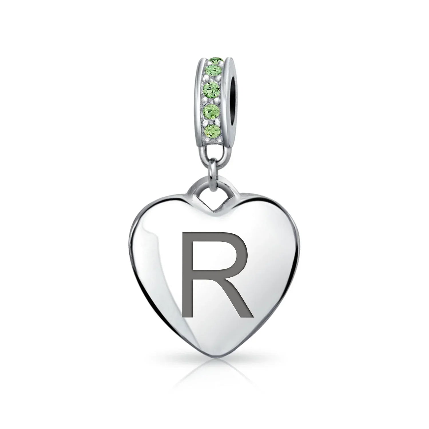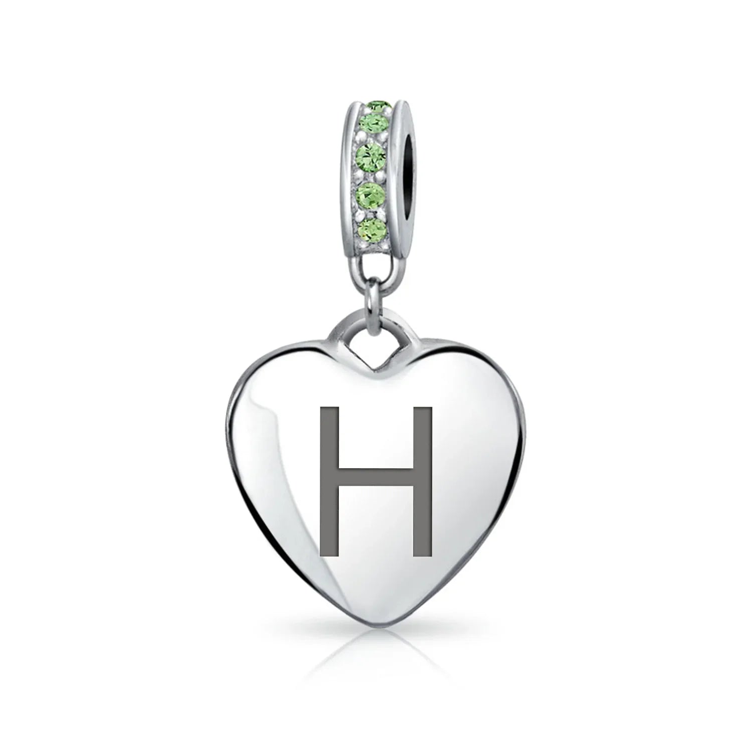 - Why not engrave names inspirational message, letters, numbers, date or coordinates. This modest polished heart shaped charm hangs from a 4.5mm unthreaded core and holds a single, elegant green simulated Peridot August birth month color, perfect for bringing that unique something to your bead story.
