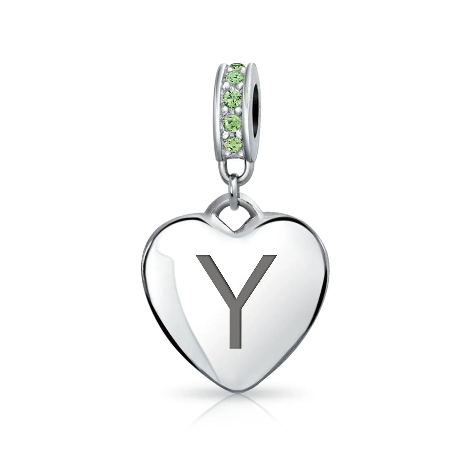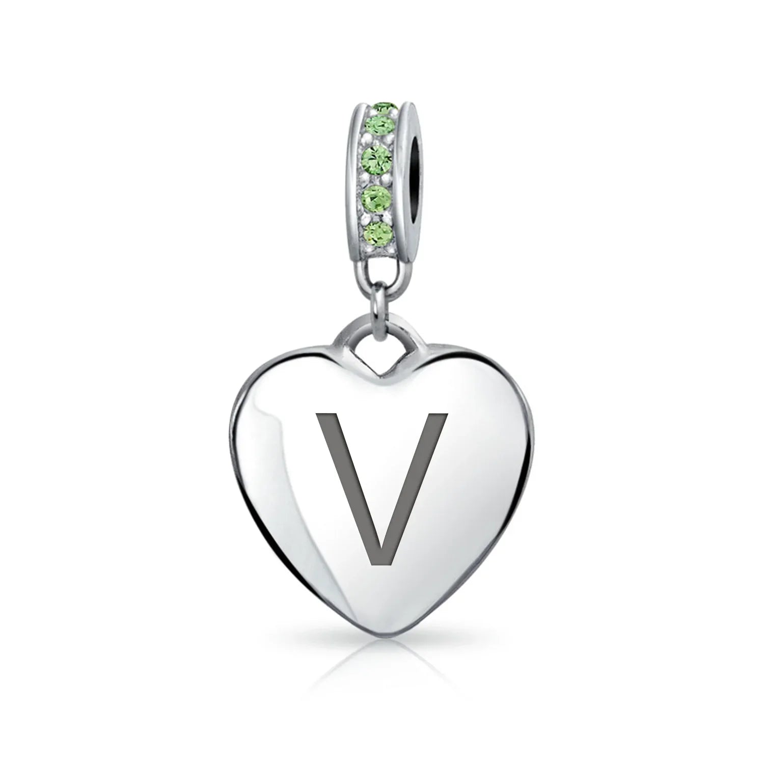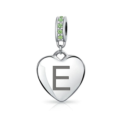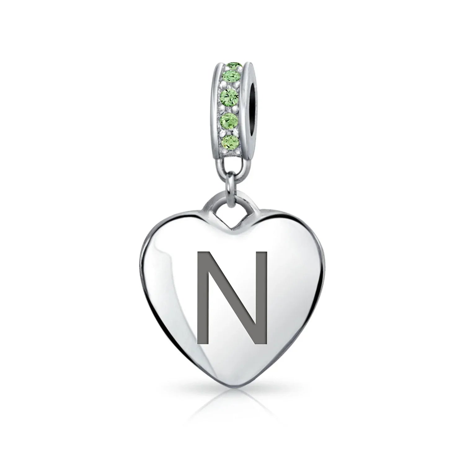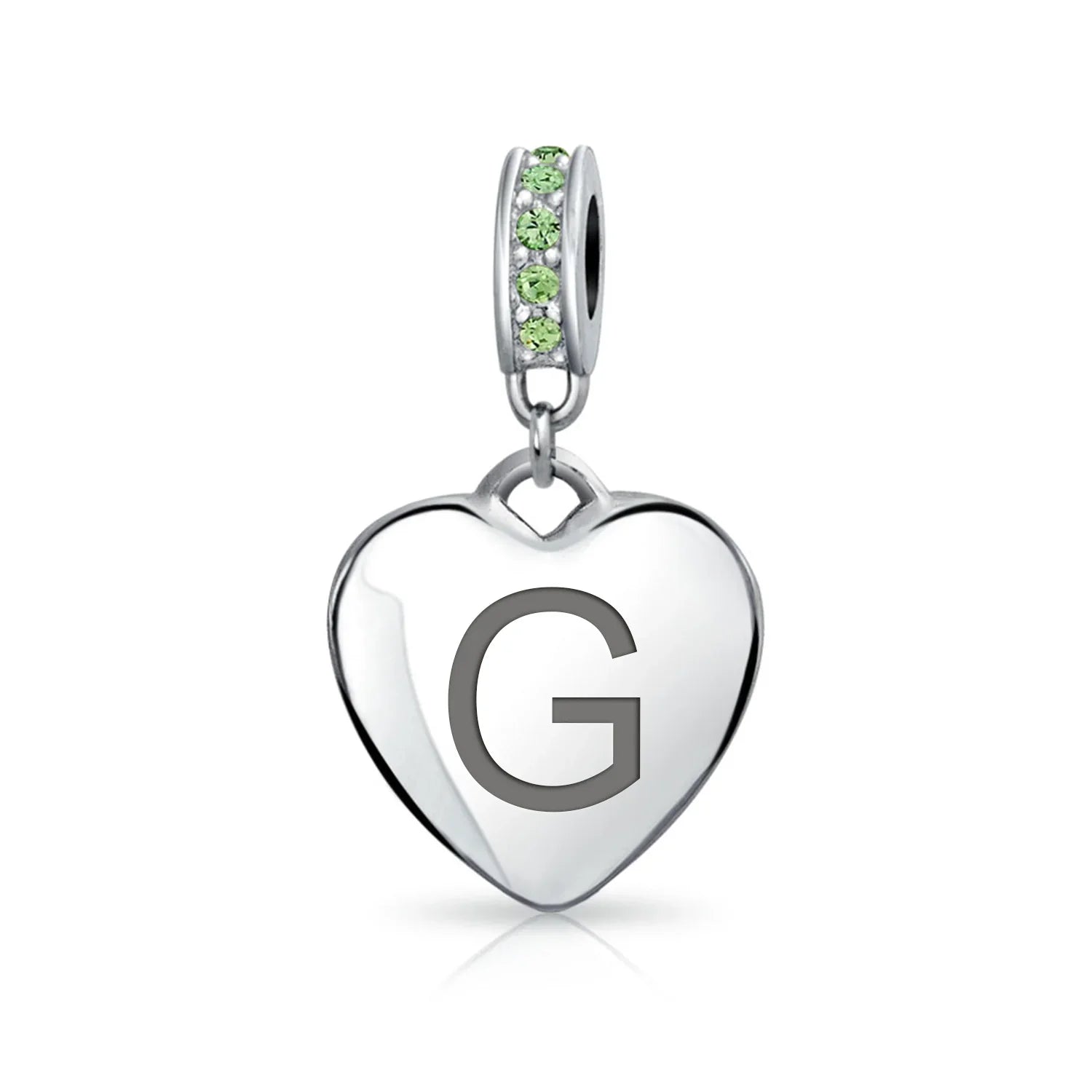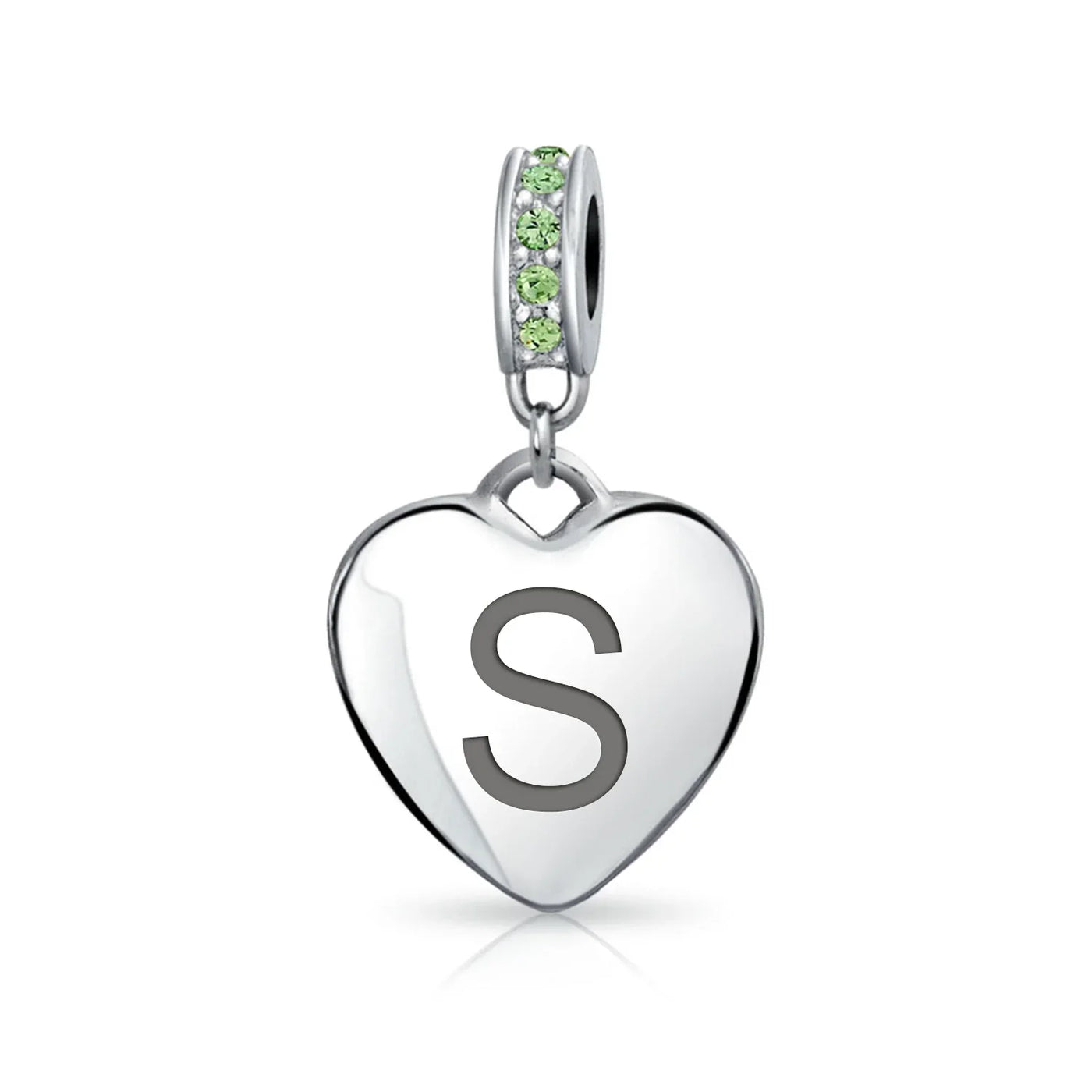 - Why not engrave names inspirational message, letters, numbers, date or coordinates. This modest polished heart shaped charm hangs from a 4.5mm unthreaded core and holds a single, elegant green simulated Peridot August birth month color, perfect for bringing that unique something to your bead story.