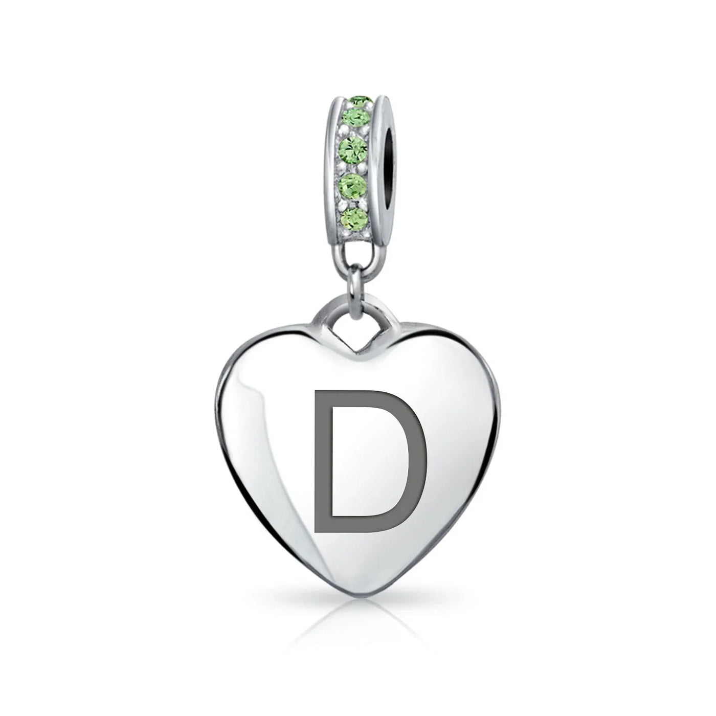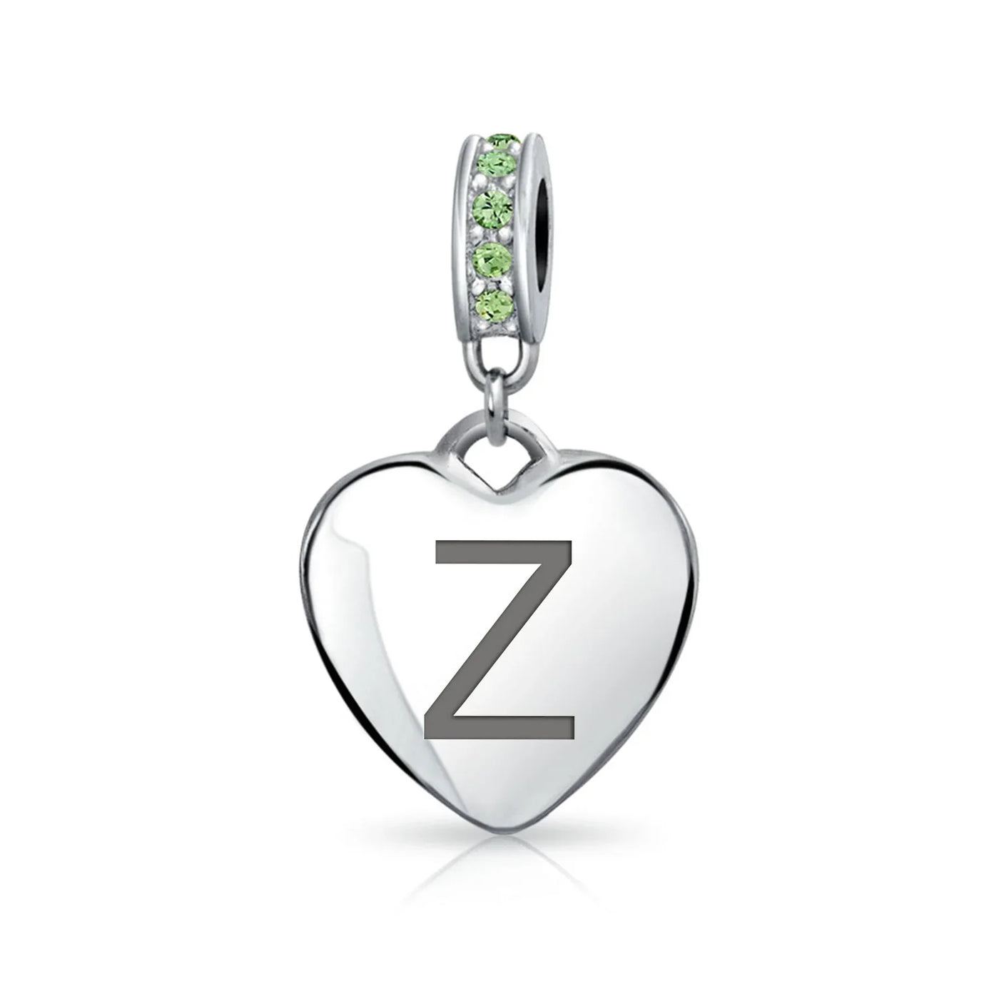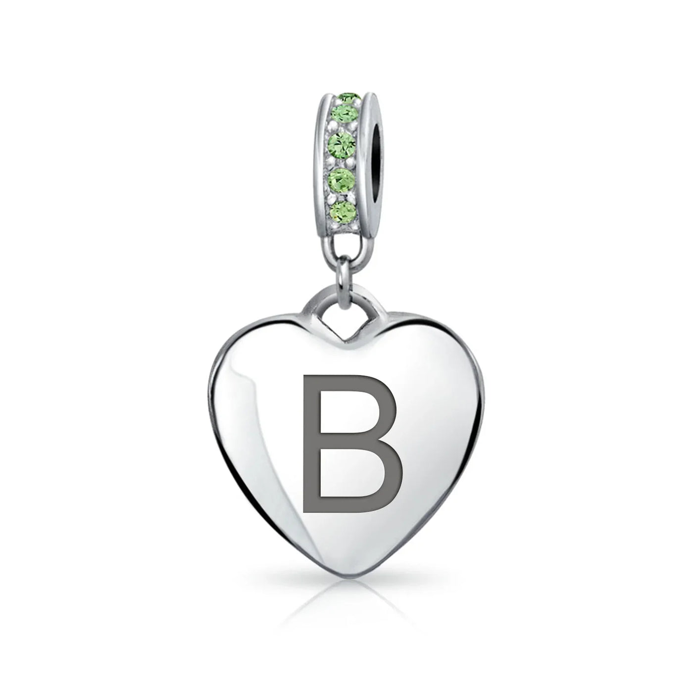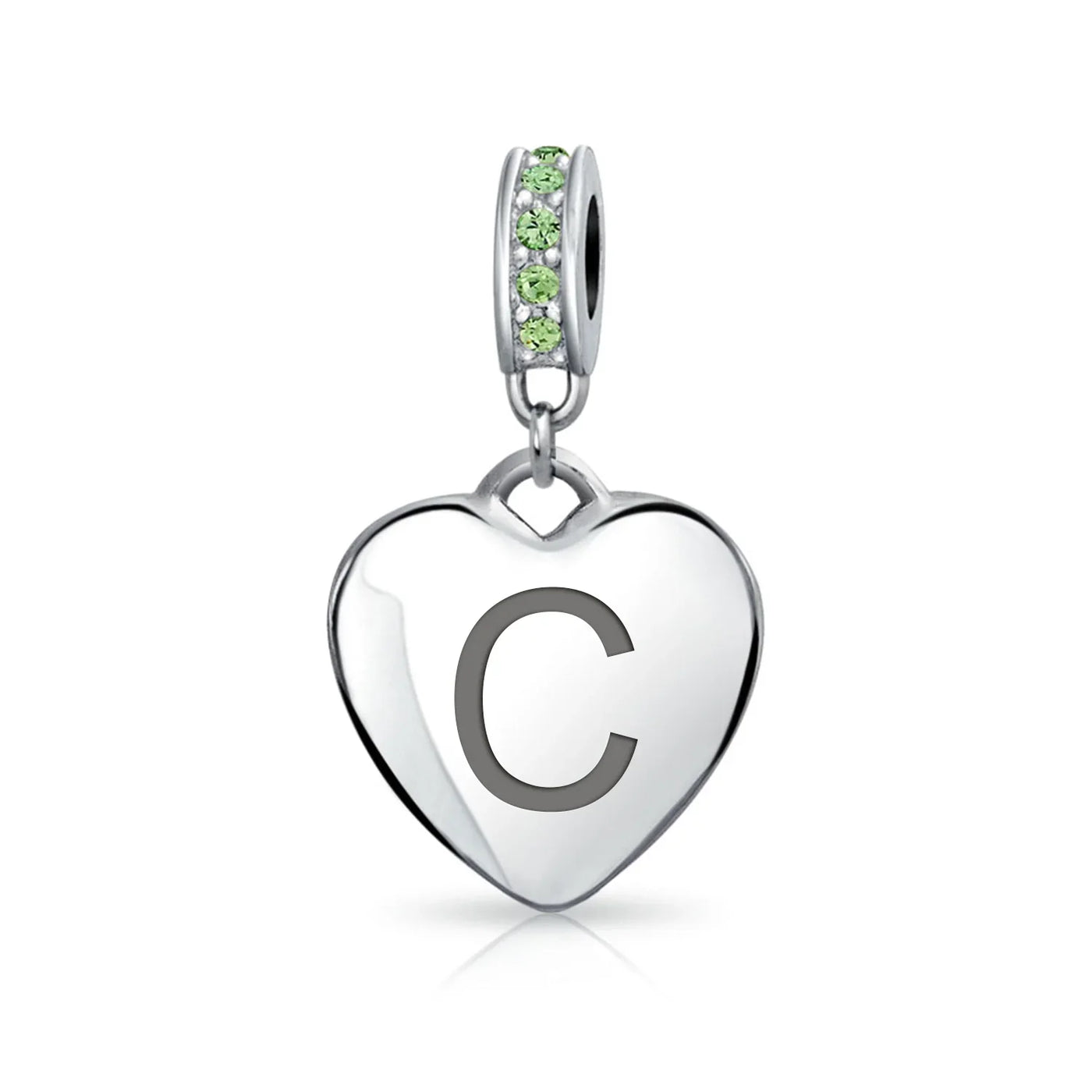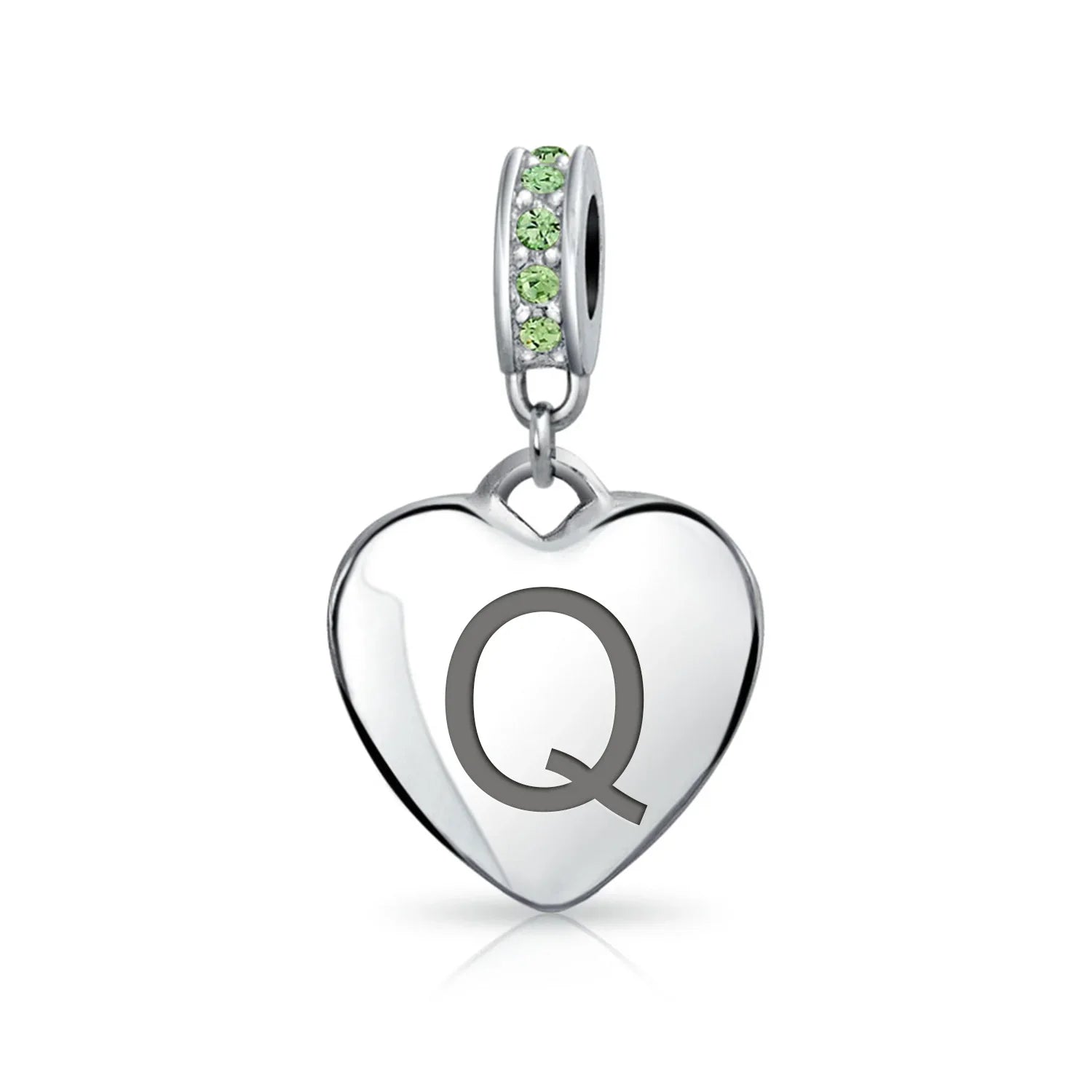 - Why not engrave names inspirational message, letters, numbers, date or coordinates. This modest polished heart shaped charm hangs from a 4.5mm unthreaded core and holds a single, elegant green simulated Peridot August birth month color, perfect for bringing that unique something to your bead story.