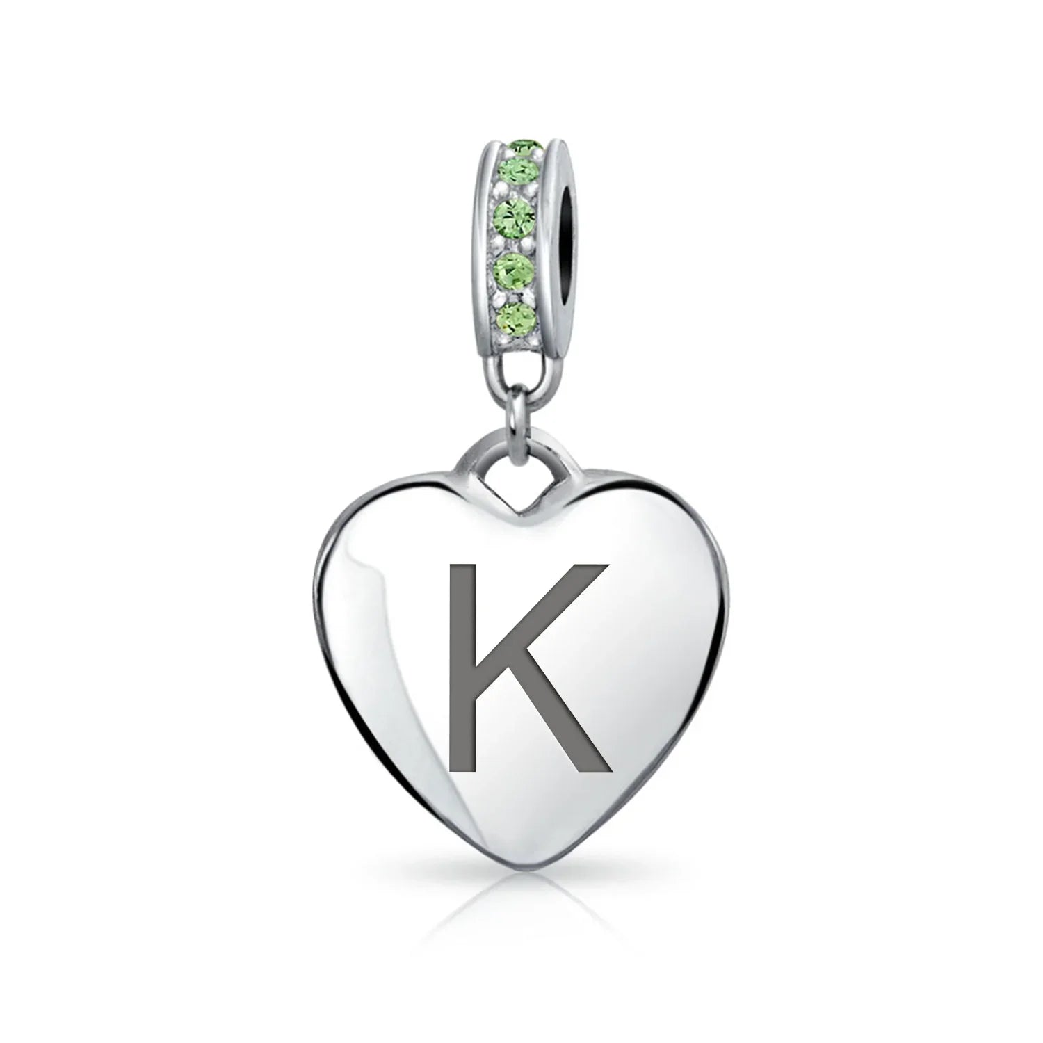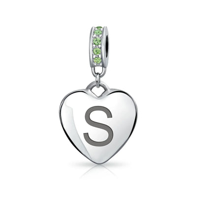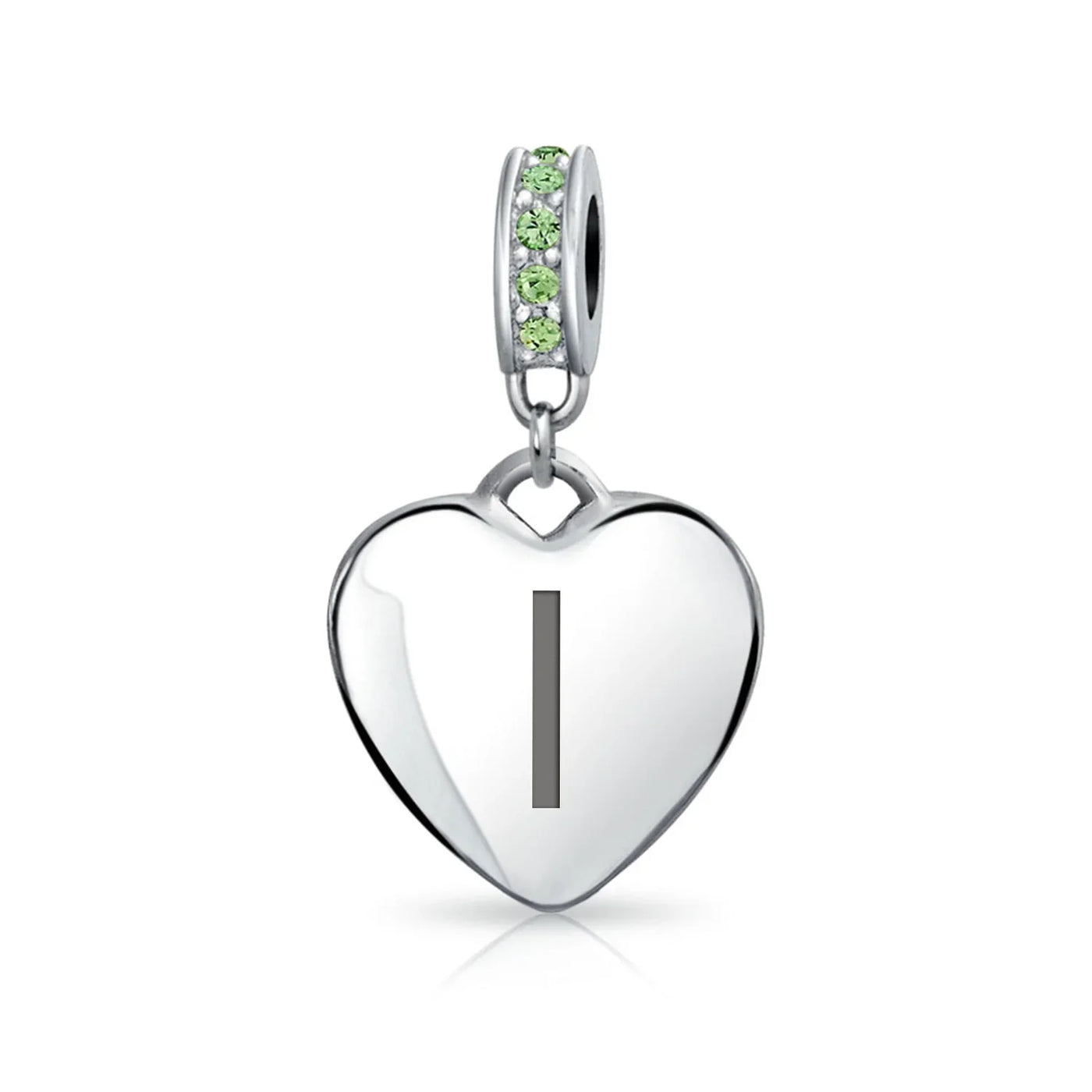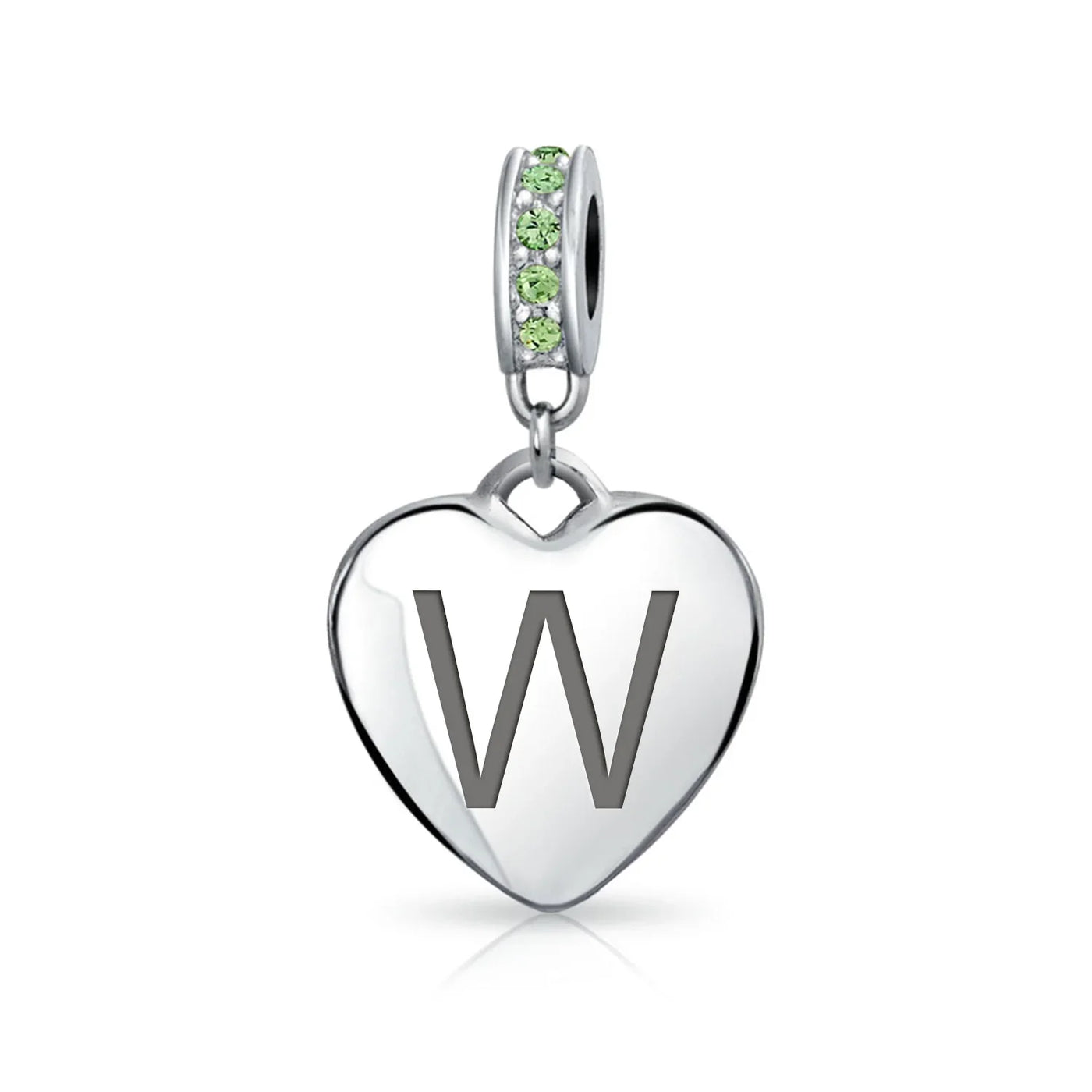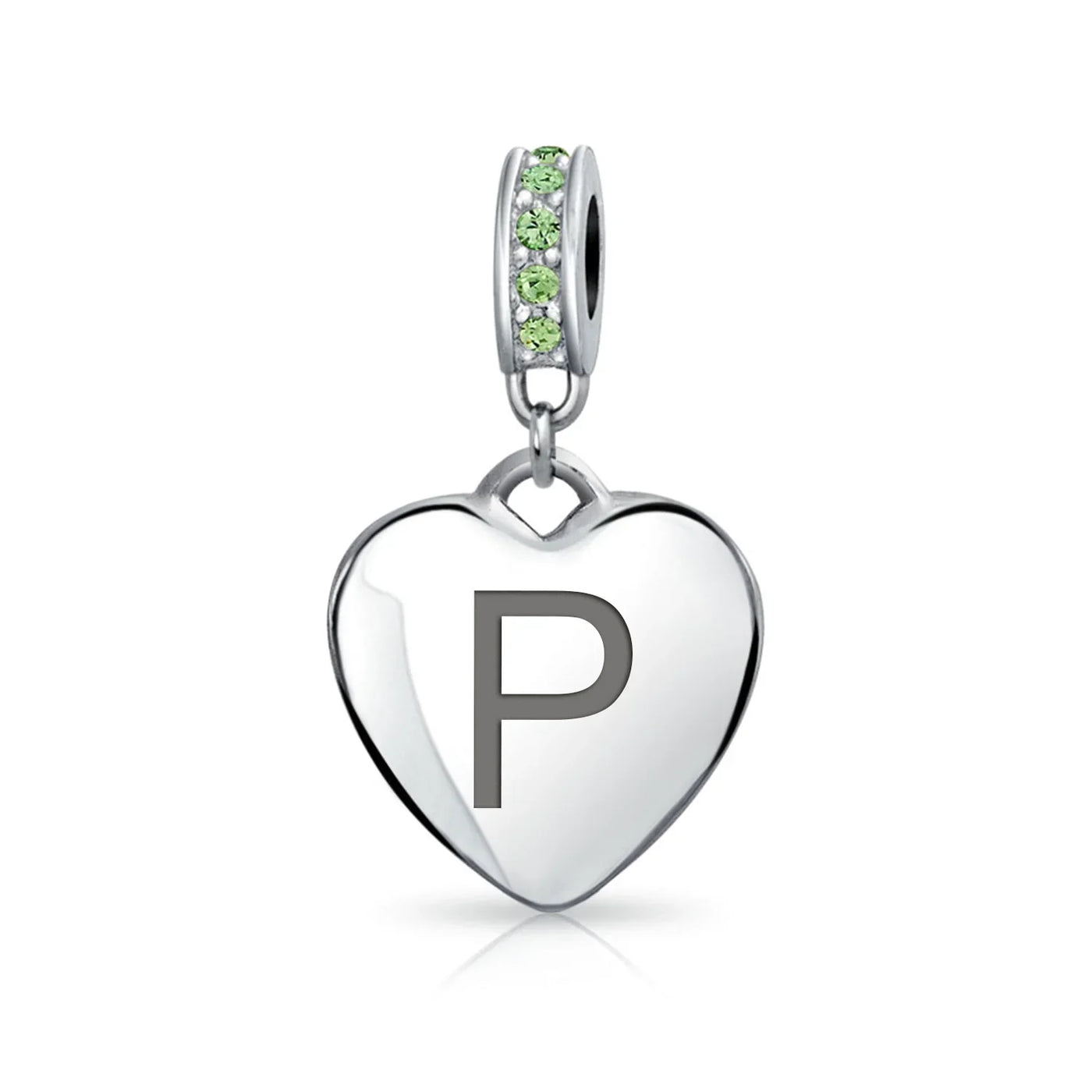 - Why not engrave names inspirational message, letters, numbers, date or coordinates. This modest polished heart shaped charm hangs from a 4.5mm unthreaded core and holds a single, elegant green simulated Peridot August birth month color, perfect for bringing that unique something to your bead story.