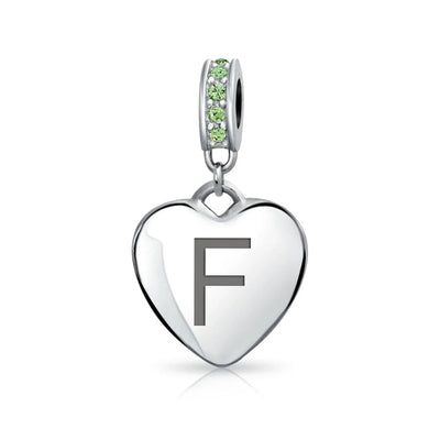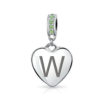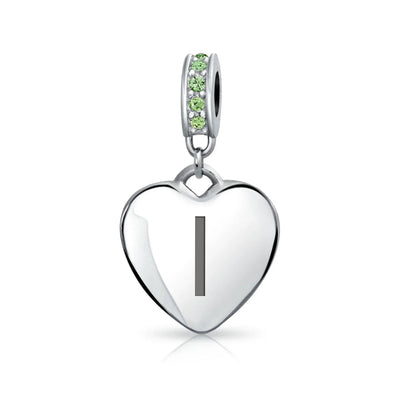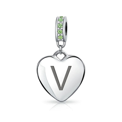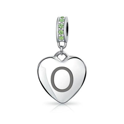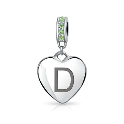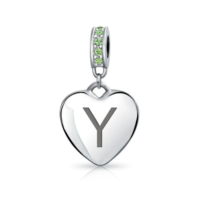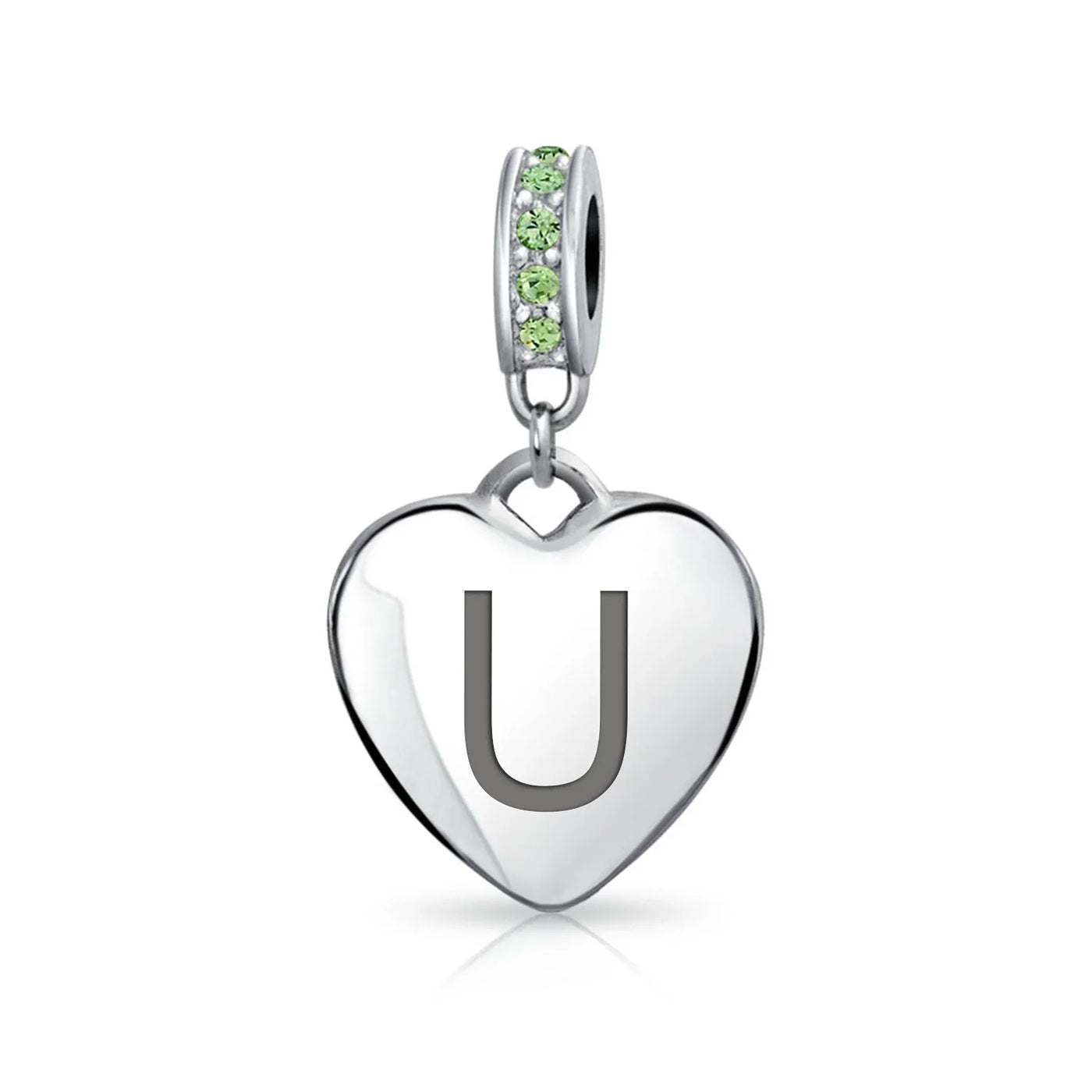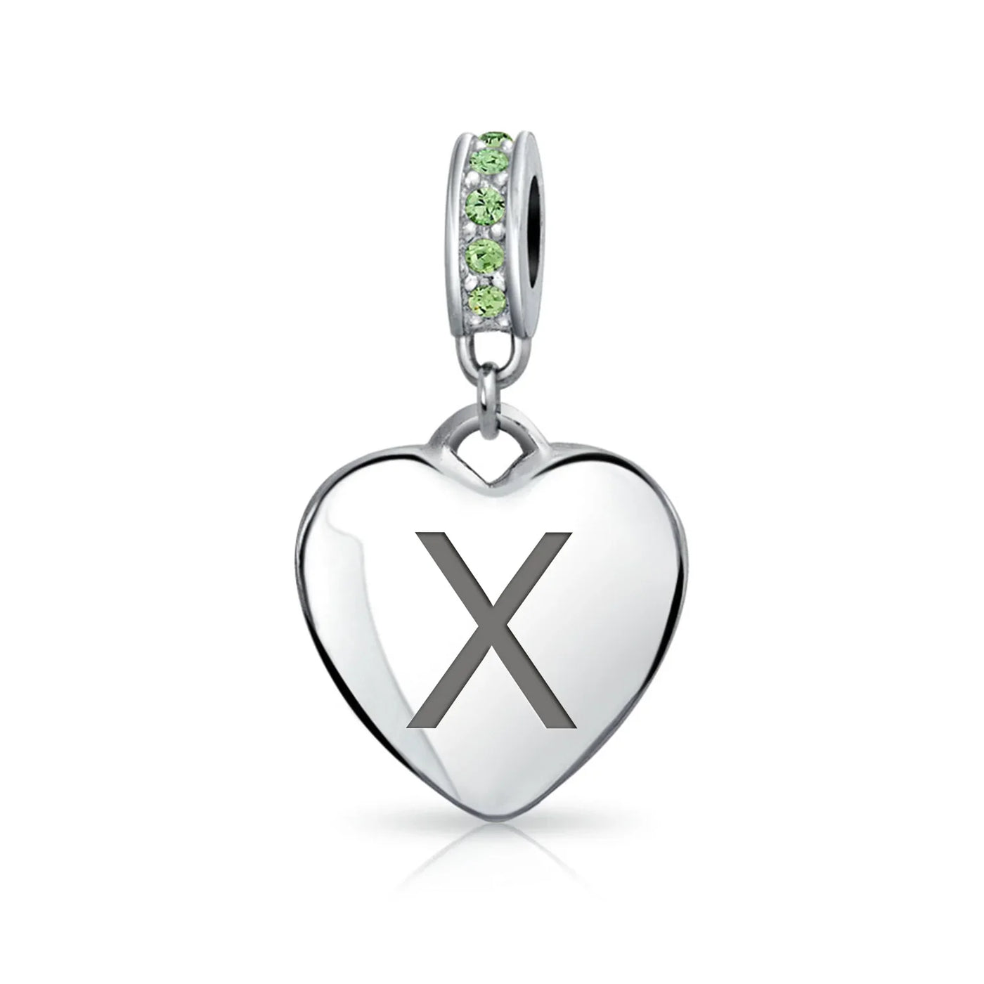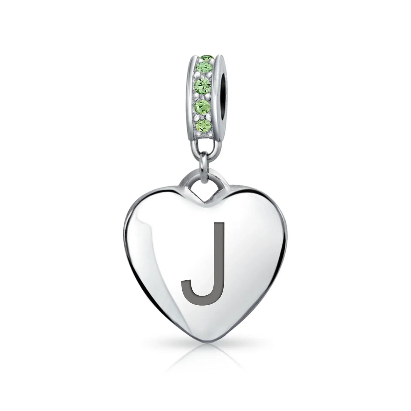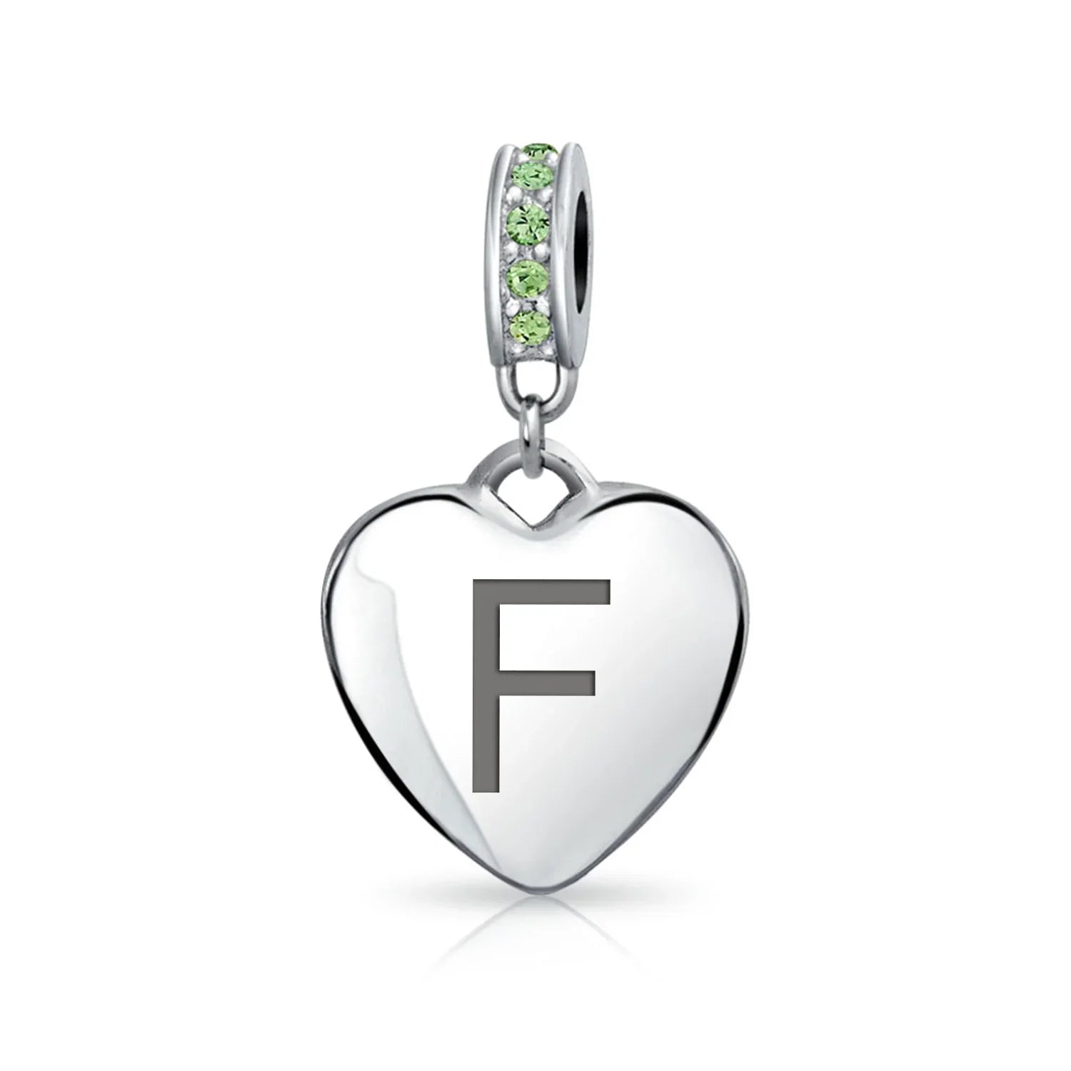 - Why not engrave names inspirational message, letters, numbers, date or coordinates. This modest polished heart shaped charm hangs from a 4.5mm unthreaded core and holds a single, elegant green simulated Peridot August birth month color, perfect for bringing that unique something to your bead story.