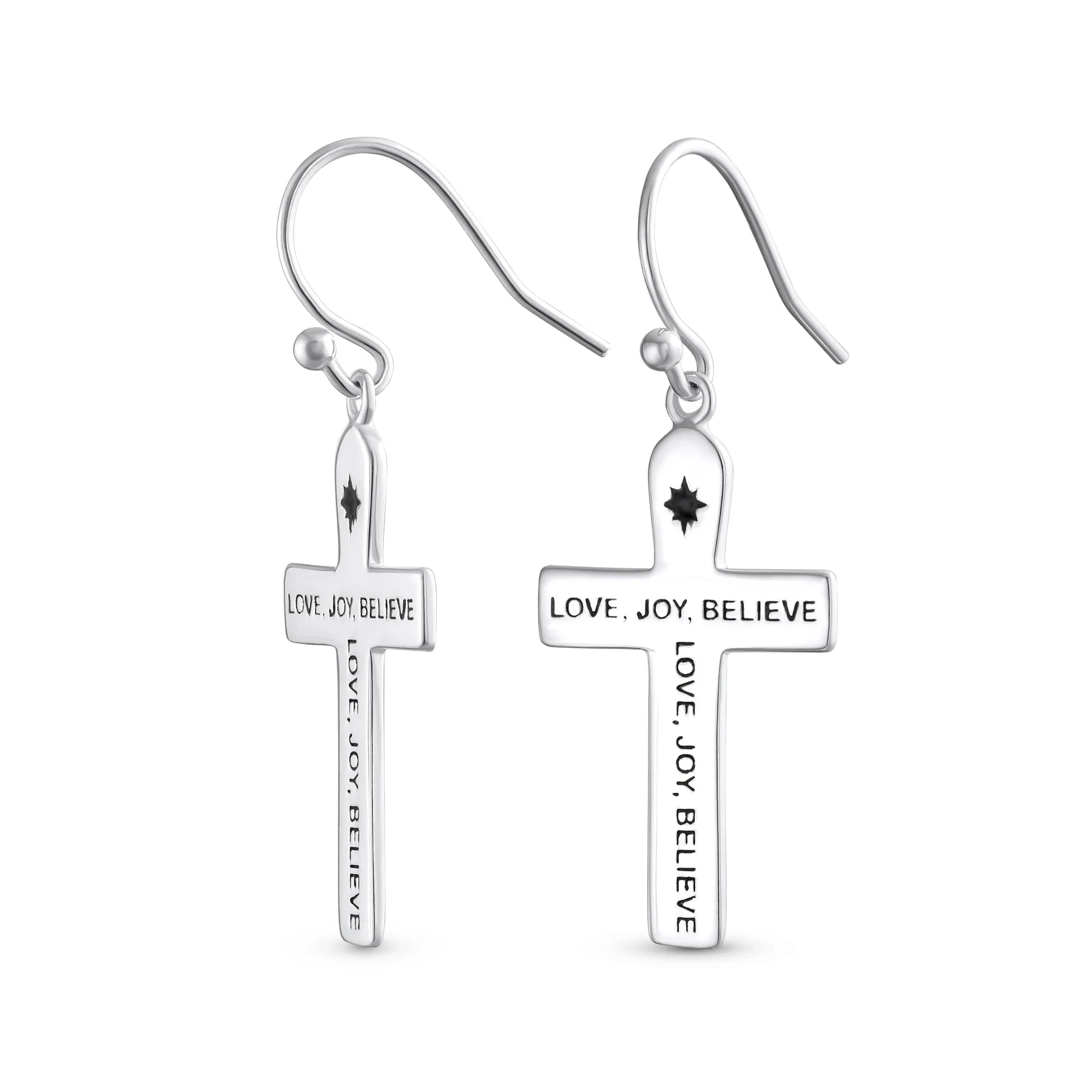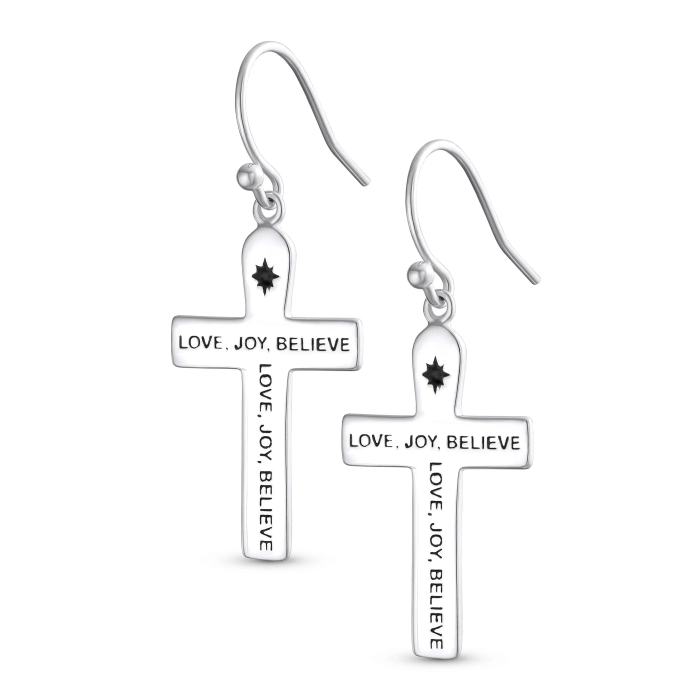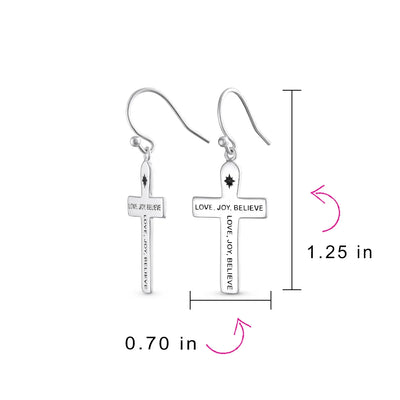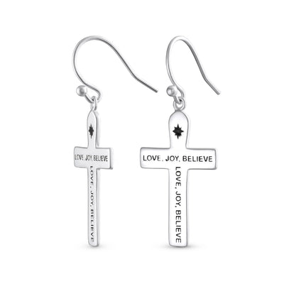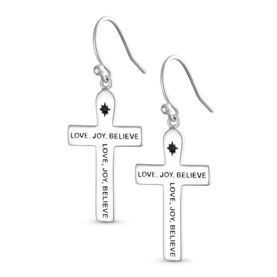 - Showcase your faith with these elegant dangle fish hope earrings featuring LOVE, JOY, BELIEVE. Crafted in high-quality .925 silver, they shine brilliantly. The contemporary cross motif adds sophistication to any outfit.