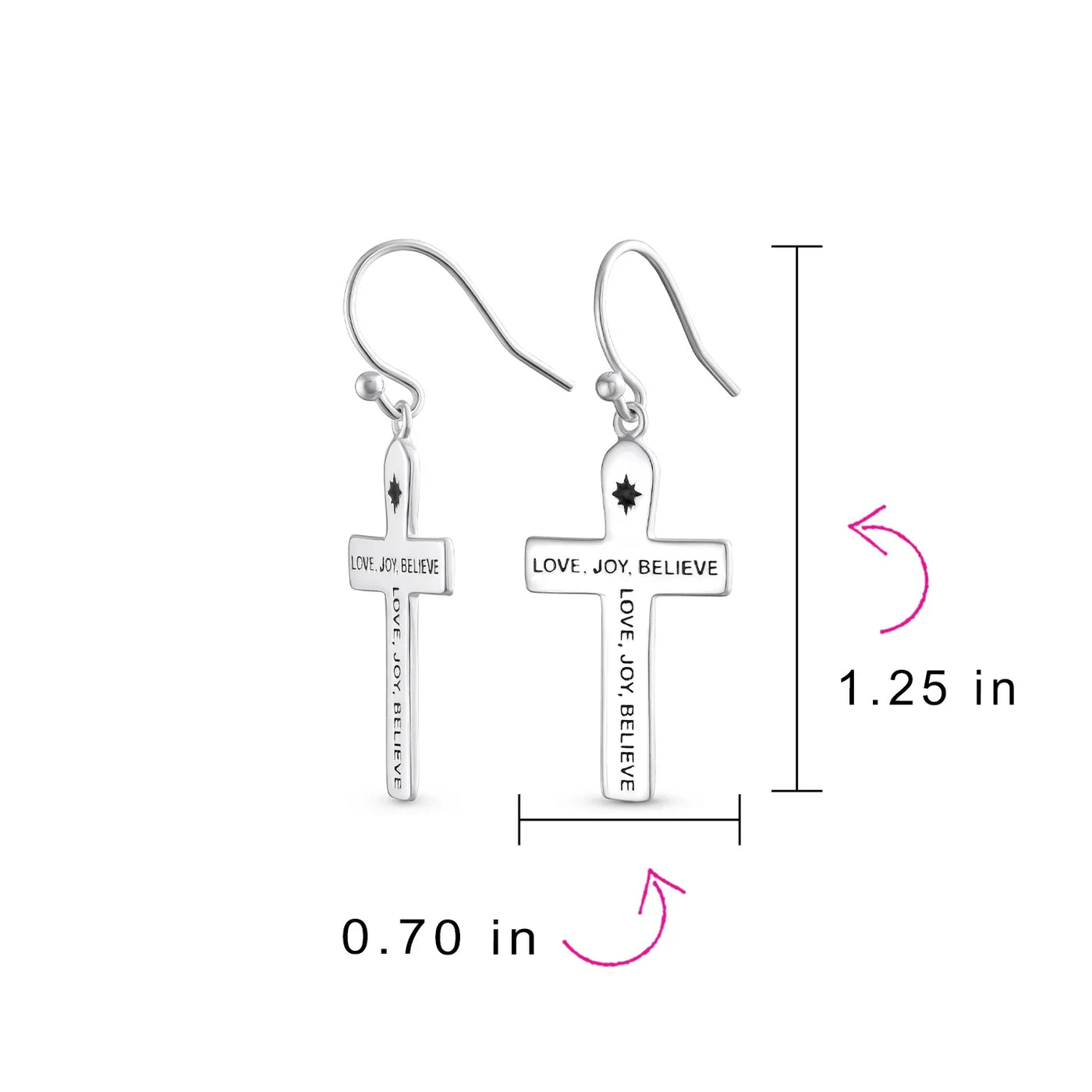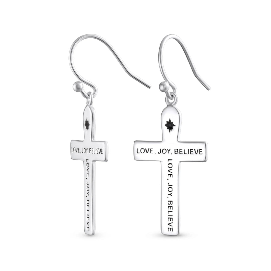 - Radiate spiritual energy with these beautifully engraved words: Love, Joy, and Believe. Elevate your style with these stunning dangle fish hoop earrings. The timeless design of the classic cross makes it suitable for any occasion, perfect for daily casual wear.