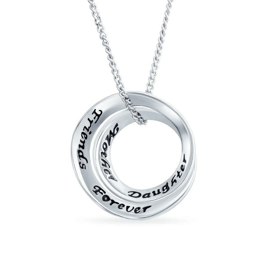 - Elegant and stylish, our mother-daughter Infinity circlet pendant necklace is the perfect Mother's Day gift. Show your love with this .925 Sterling Silver message pendant. Inscribed with "mother daughter friends forever" on two connected circles. This polished double circlet pendant hangs at 16 inches on a delicate curb chain. Securely fastens with a spring ring clasp and features a double extender. A beautiful .925 Sterling Silver necklace with a heartfelt message. Ideal for moms and daughters to cherish their bond. Perfect for any occasion, spread the love with this timeless piece.