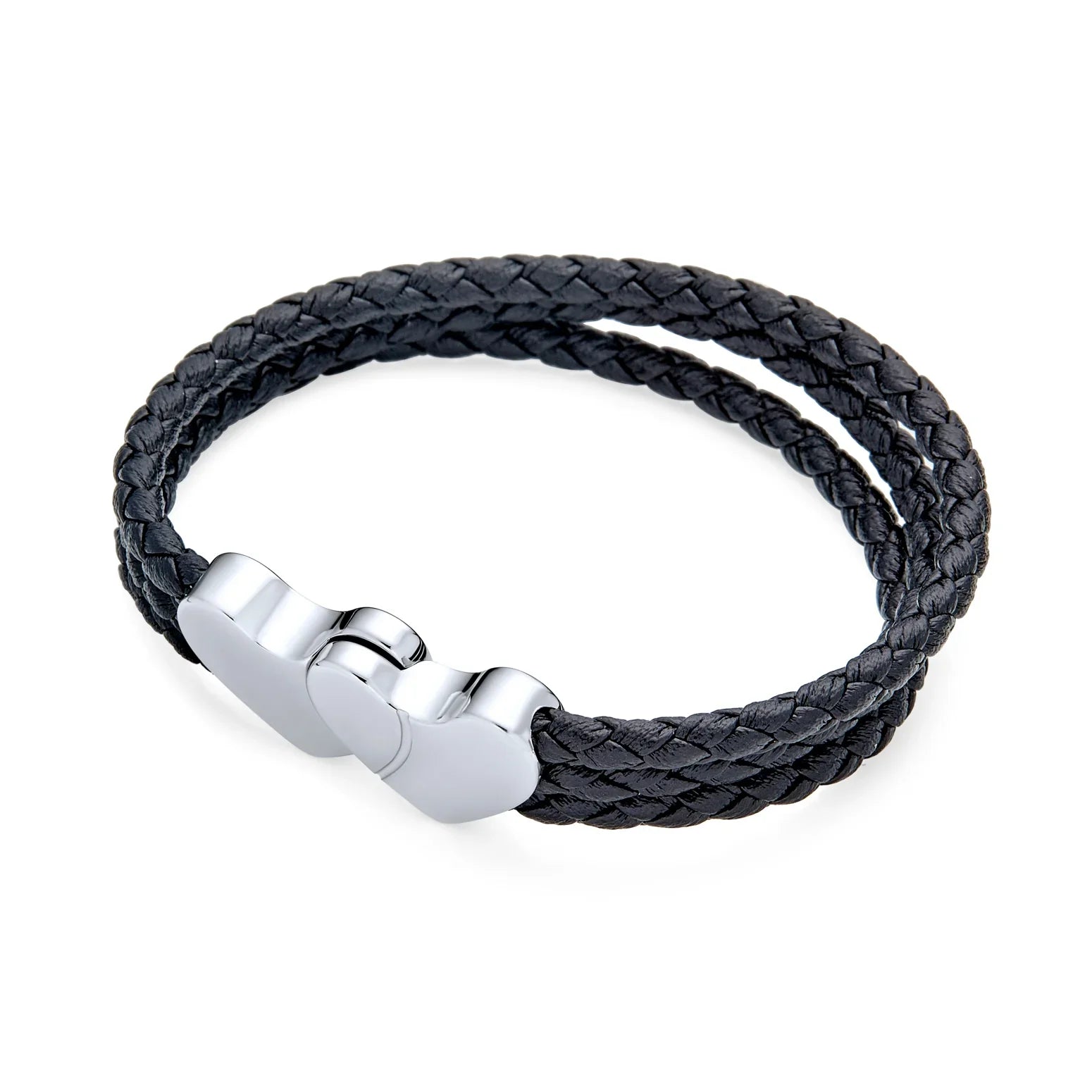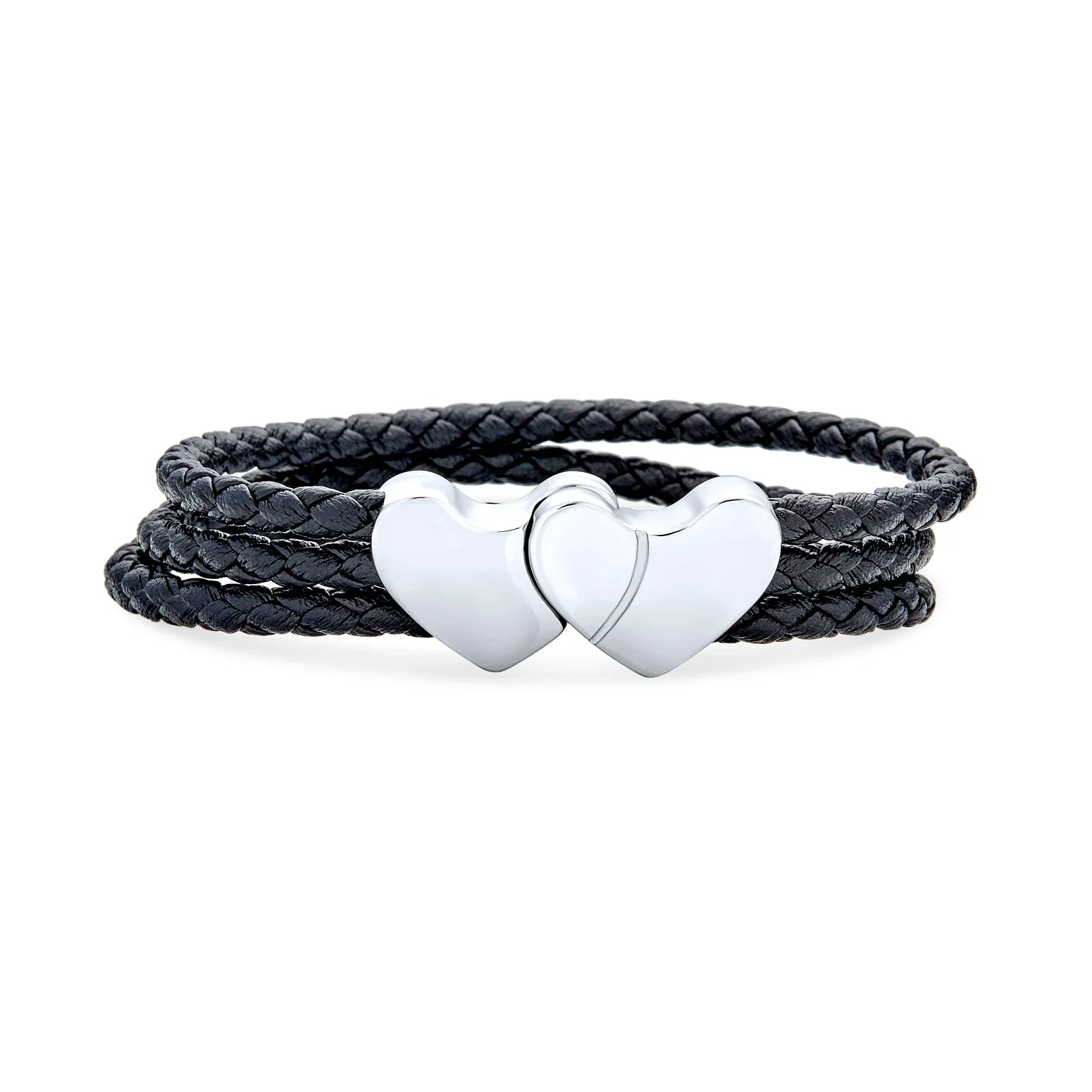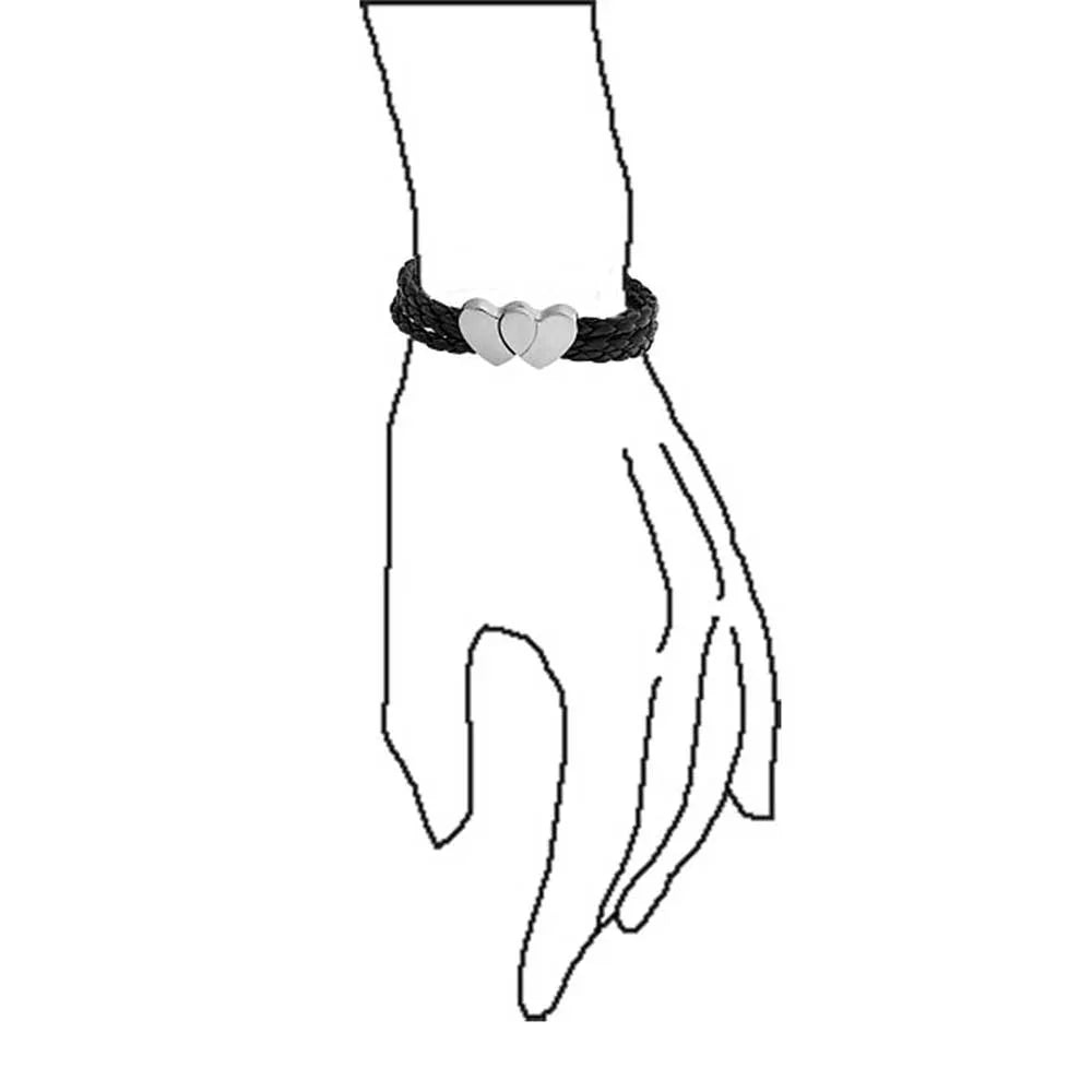 - Add a touch of romance and style to your look with our latest double heart bracelet. Crafted with two interlocking stainless steel hearts as the clasp, this bracelet is both trendy and elegant. The closure is easy to use with a simple twist, making it convenient for everyday wear. The heart-shaped design adds a charming touch to your wrist, while the three braided strands of synthetic black leather provide a lightweight and comfortable fit. This unisex bracelet is the perfect gift for anyone, regardless of age or gender. With an 8-inch length, it is suitable for most wrist sizes. Elevate your accessory game with this stunning double heart bracelet.