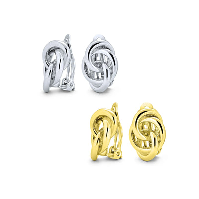 - Experience sublime sparkle and modern elegance with these exquisite clip-on brass earrings, perfect for non-pierced ears. Featuring a charming gold-plated love knot with a gleaming triple open interlocking circle design.