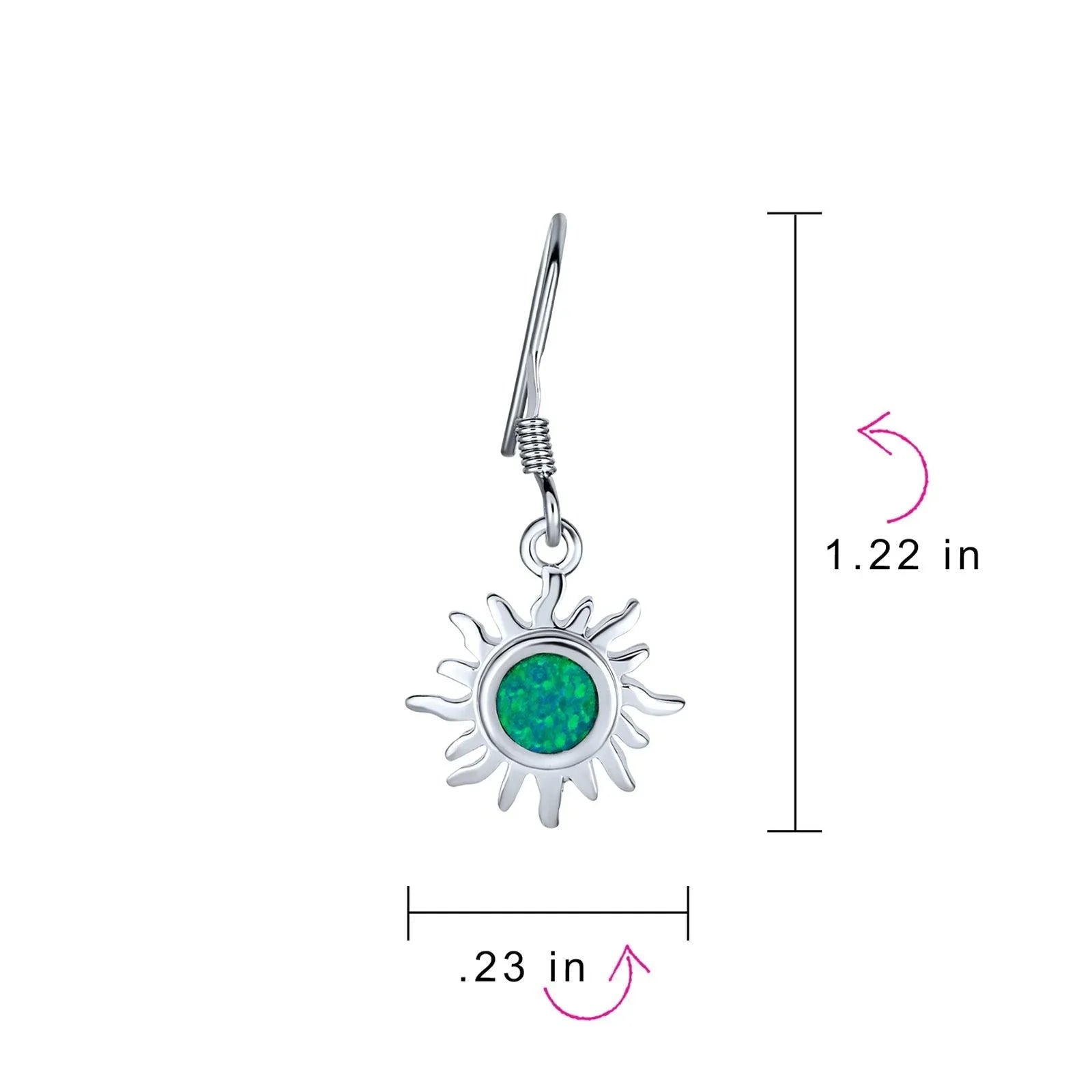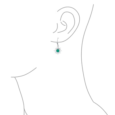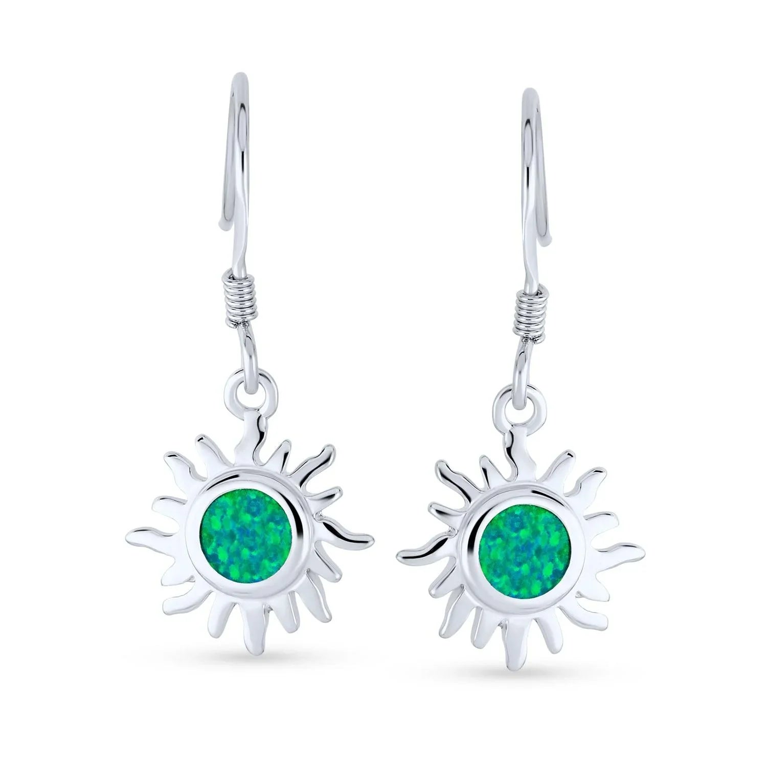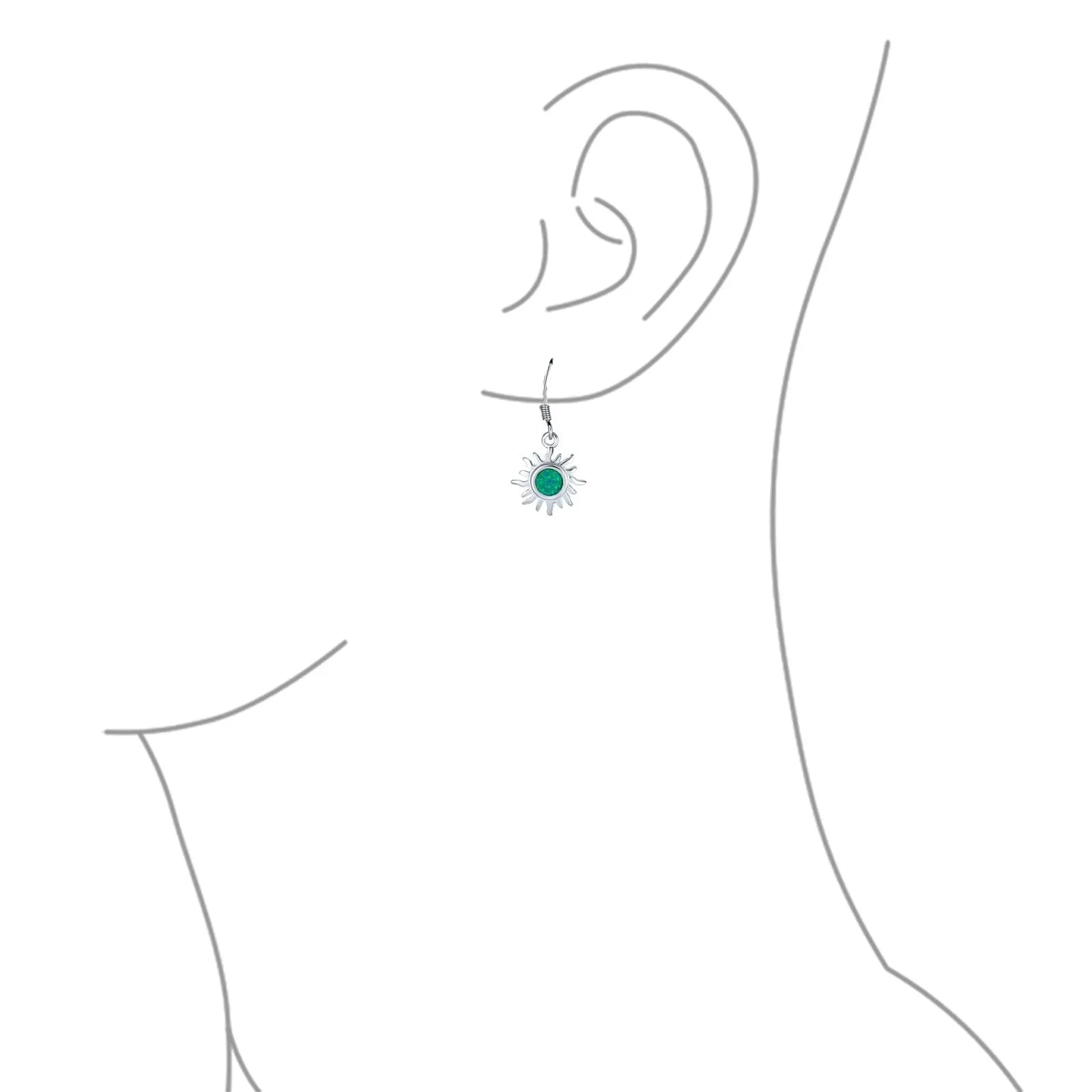 - Add blazing, fierce style to any look with these beguiling, sterling silver, dangle earrings. Accented by a dangling, synthetic fire opal at the center of an eye- catching, sunburst design.