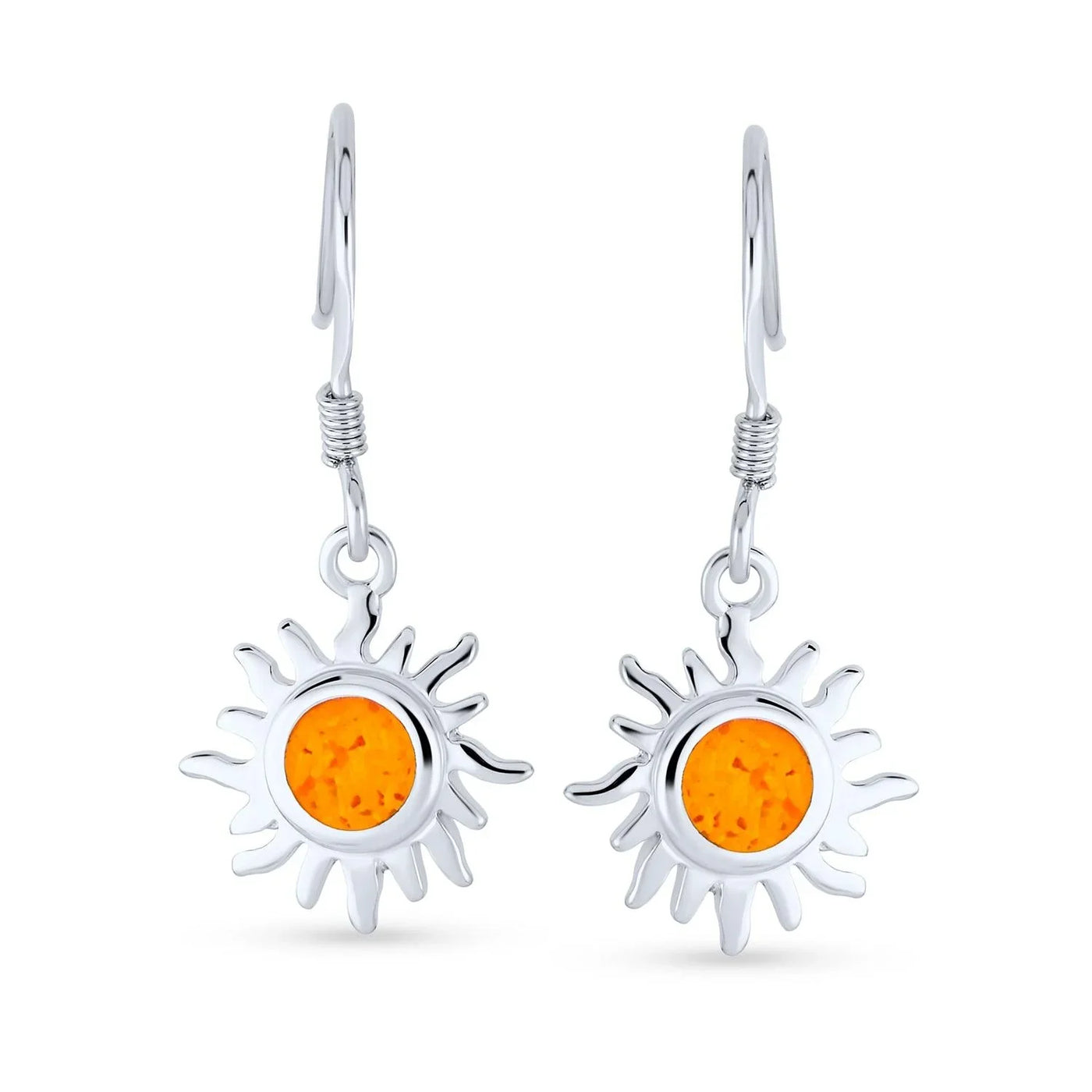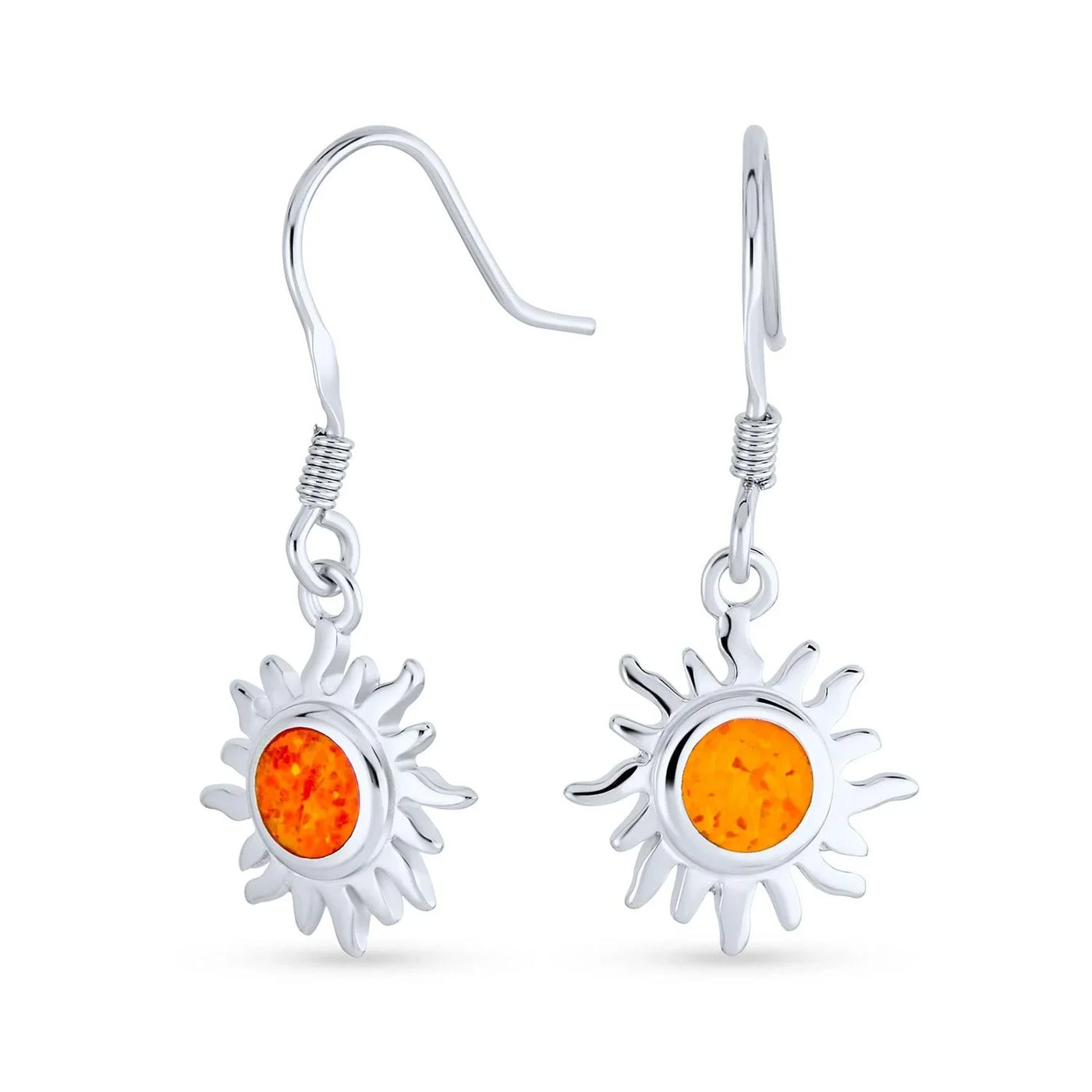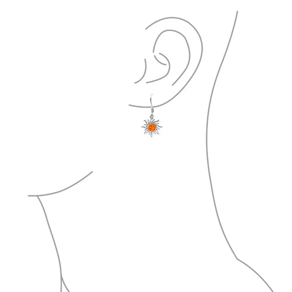 - Radiate with these chic celestial sun dangle earrings. Featuring a glittering Created Mexican fire opal in .925 sterling silver. These orange opal earrings add vibrant color to your summer jewelry collection. Ideal October birthstone gift for those who shine.