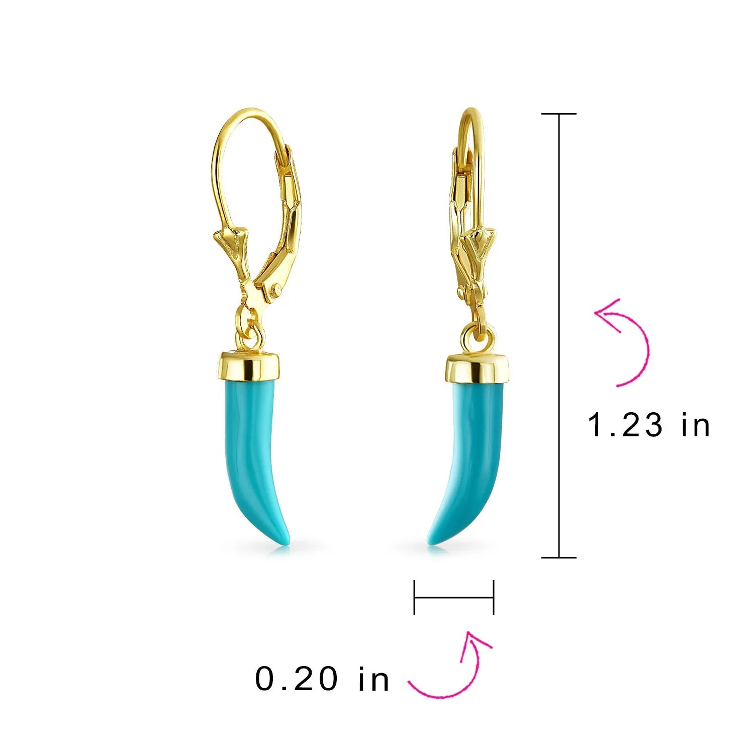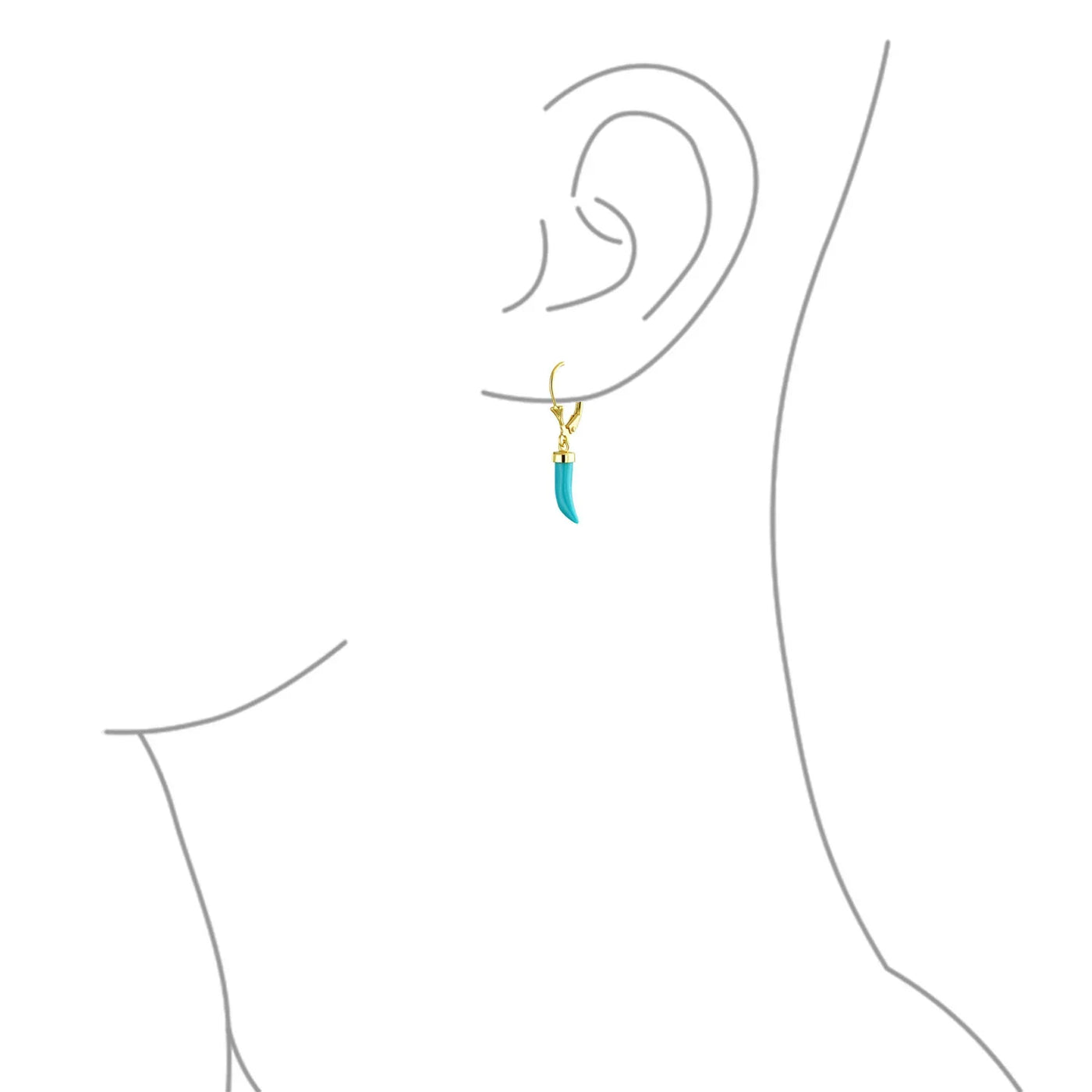 - Enhance your ensemble with vibrant color and good fortune through these exquisite dangle earrings, featuring an elegant Italian horn motif in vivid blue Turquoise. The 14K gold-plated .925 silver lever back adds a luxurious touch to this standout piece.