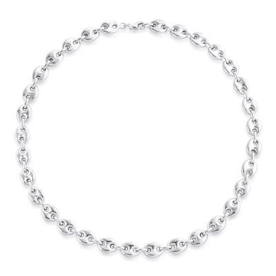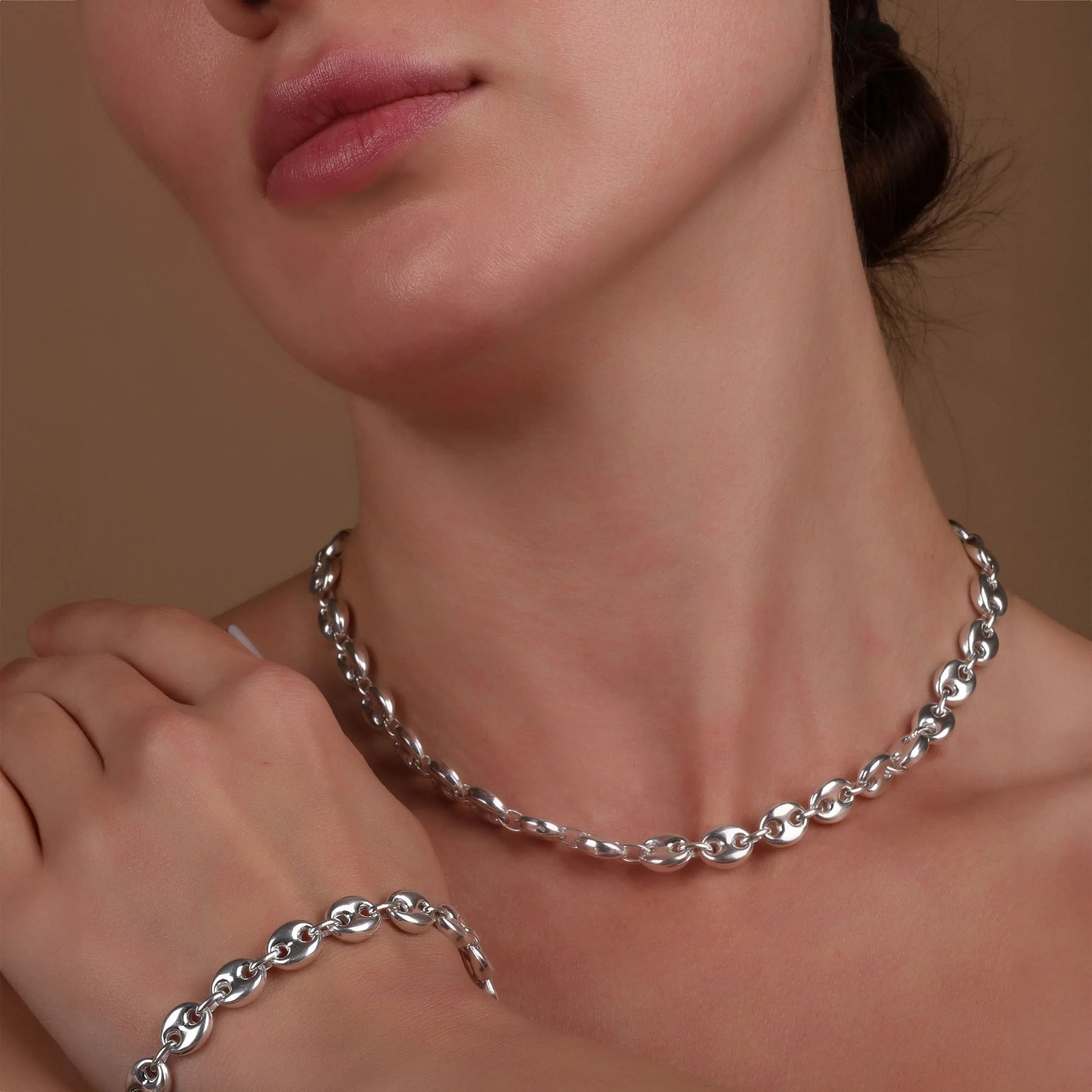 - Complete SET -9MM wide chain with matching earrings - This sophisticated designer chain, popularly known as the Mariner or Anchor chain, draws inspiration from the chains connected to anchors in the nautical world. It is a beautiful choice for anyone who has a fondness for the sea. Not only is it comfortable to wear around your neck, puff links are hollow yet sturdy, ensuring durability.
