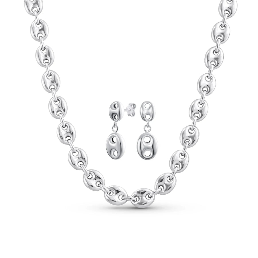 - Elevate your style with this exquisite 925 sterling silver puff marina chain link necklace & earrings set. Crafted with precision, this classic puff marina chain is a must-have. Wear it solo for a chic, sophisticated look or layer for trendy style. Timeless charm and elegance in one stunning accessory.