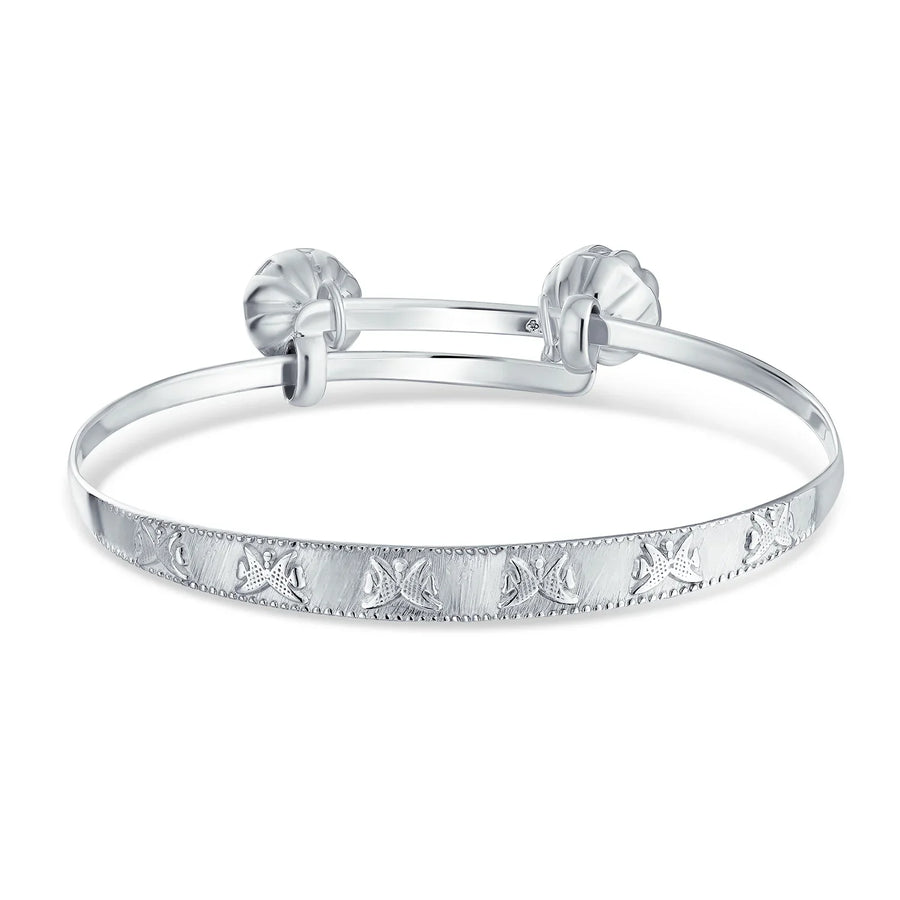 - This adorable butterfly bangle bracelet is a must-have for any jewelry collection. Crafted from .925 sterling silver, it exudes elegance. The adjustable design (4.5-6.5 inches) ensures a comfortable fit. The intricate butterfly motif wraps around the front, leading to two silver-plated brass jingle bells. Ideal for showers, christenings, baptisms, and Christmas, it makes a perfect gift for anyone special.