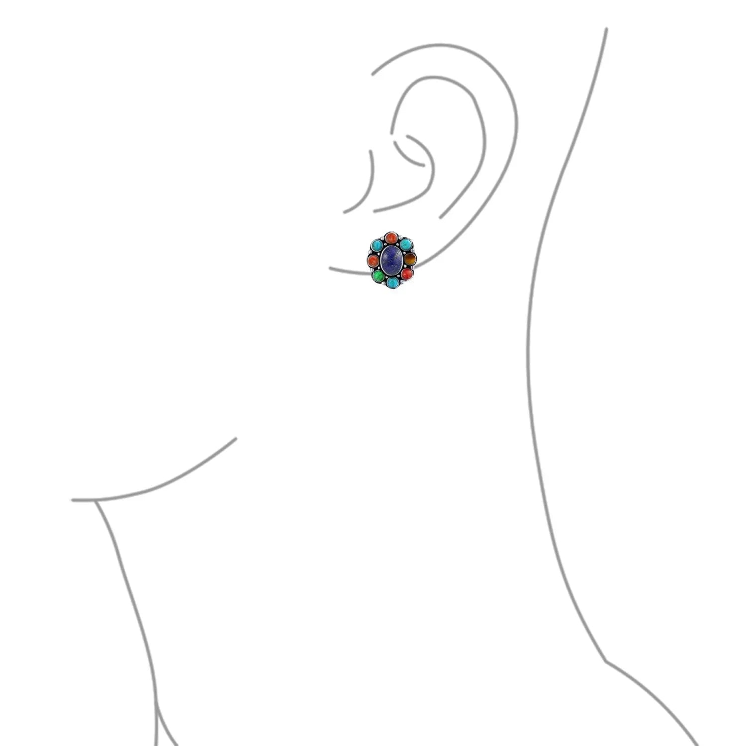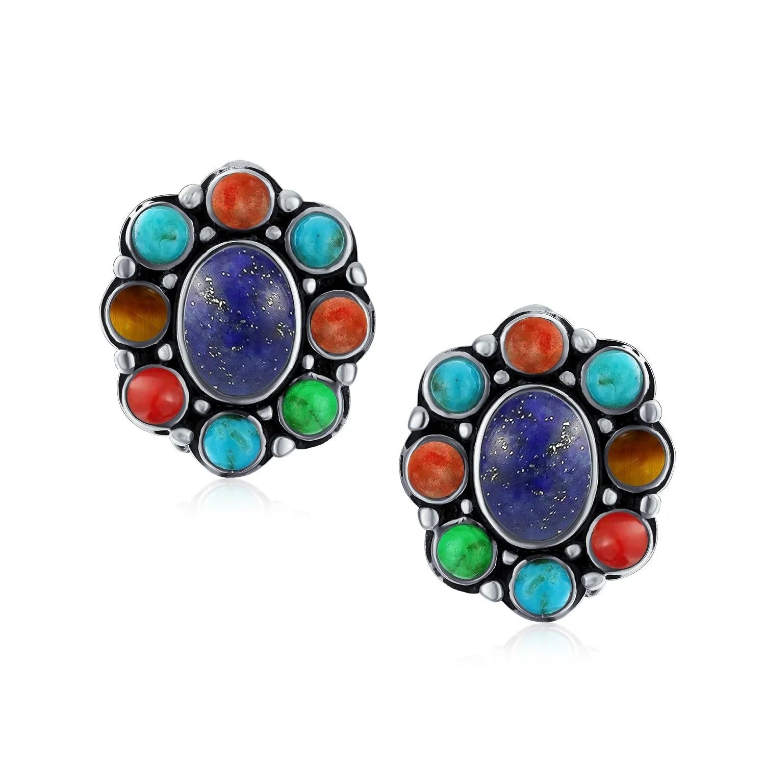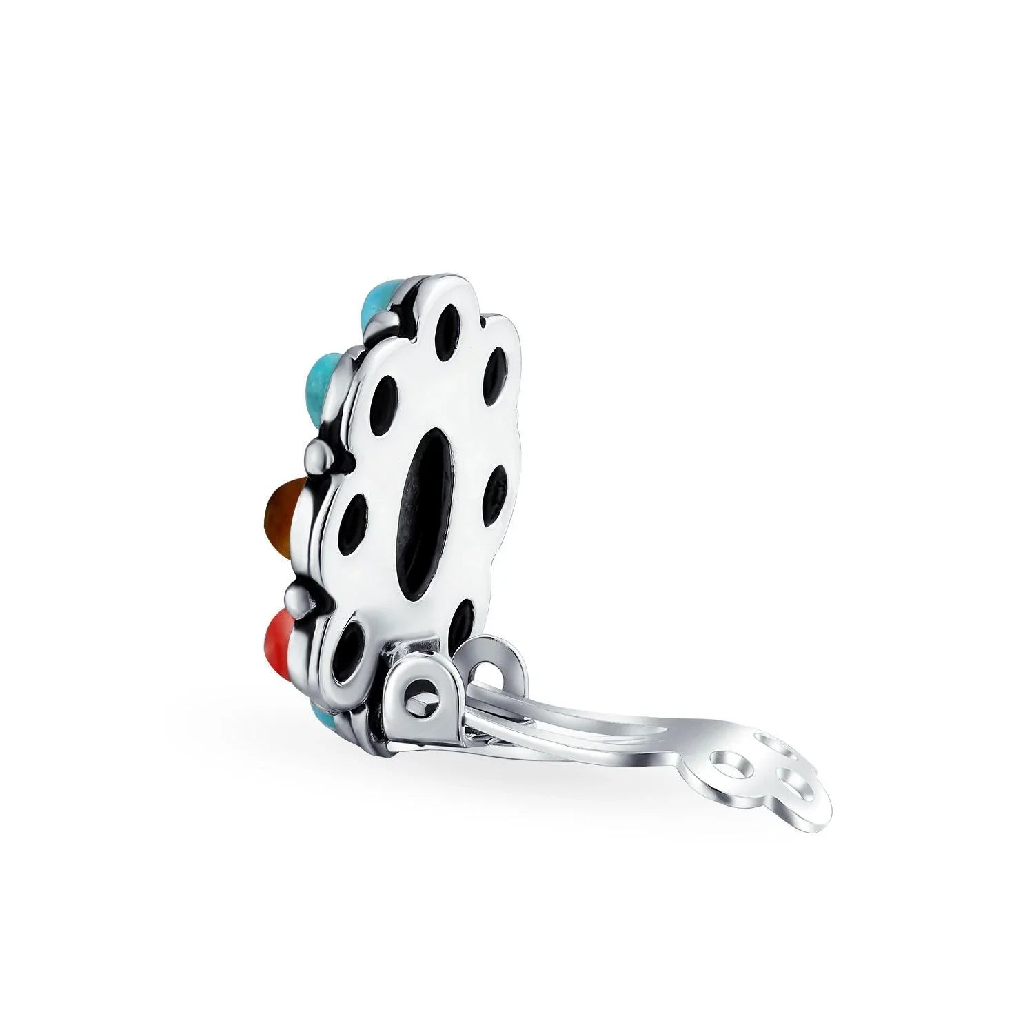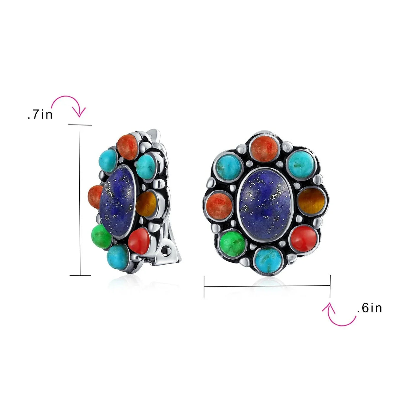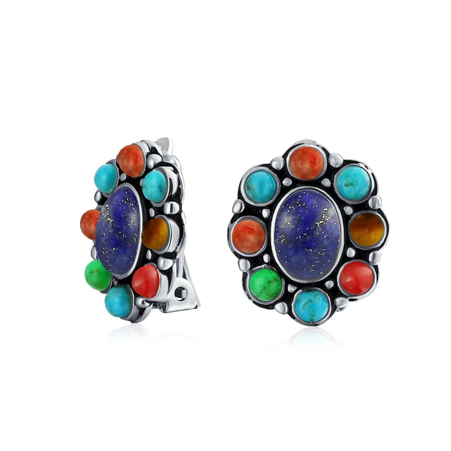 - Elevate your style with these multi-color, multi-stone clip-on earrings. Their feminine design sizzles with bold, vibrant colors. Featuring lapis lazuli, turquoise, green turquoise, and coral stones, bezel set in 925 sterling silver. Balinese Bali Style meets colorful elegance in these cluster earrings. Perfect for any chic woman, no pierced ears needed. Add a burst of color to your jewelry box today!