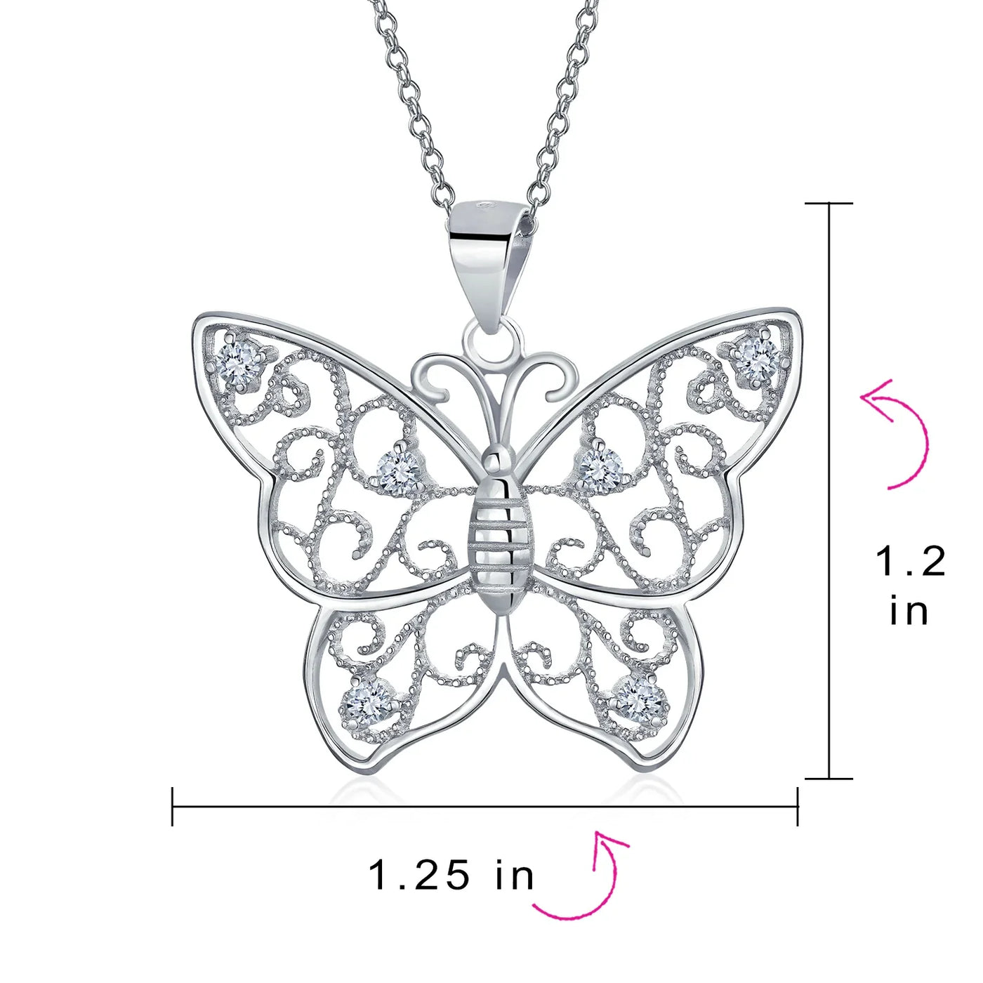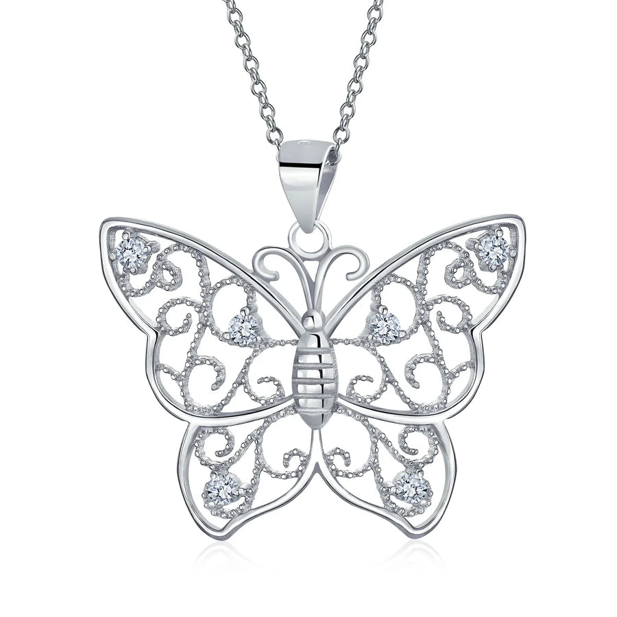 - Let your style go though a metamorphosis and transform your jewelry box with this stunning sterling silver big butterfly necklace. The open filgree design adds a elegant touch, while the garden charm symbolizes transformation. Perfect for gifting to someone special.