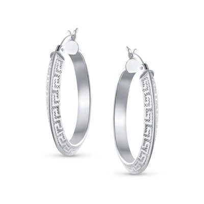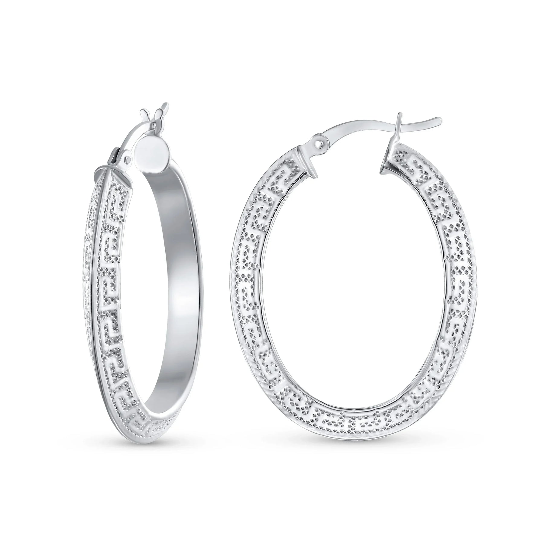- Introducing our latest addition: sterling silver Greek key oval hoops. These timeless earrings feature a design used in fashionable jewelry for centuries. The Greek key symbolizes unity, seen in art and fashion accessories. Our sterling silver Greek key hoop earrings are stylish and symbolize love and devotion. The intricate design adds sophisticated charm to any outfit, reminiscent of ancient Greek heroes. Crafted from 925 sterling silver, these hoops are rhodium plated for tarnish resistance. The hinge mechanism ensures easy opening and secure closure. Lightweight and comfortable, they are perfect for everyday wear. Add these exquisite sterling silver Greek key huggie hoops to your collection today. Order now and experience their timeless beauty and elegance.