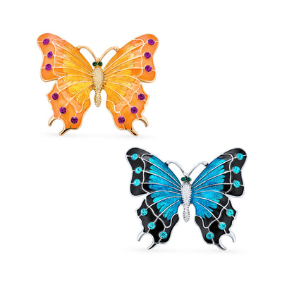 Set of 2 Yellow Blue Black Butterfly Brooch Pin Crystal Enamel Gold Plated