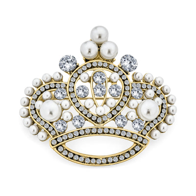 • Show your queen she rules with this elegant, affordable crystal Brooch Pin. Rhodium plated for extra shine and tarnish resistance. Perfect Mother's Day gift to dazzle any outfit. Treat yourself royally with this stunning simulated pearl brooch. Sparkles with round clear crystals in a pave setting, adorned with white pearls.