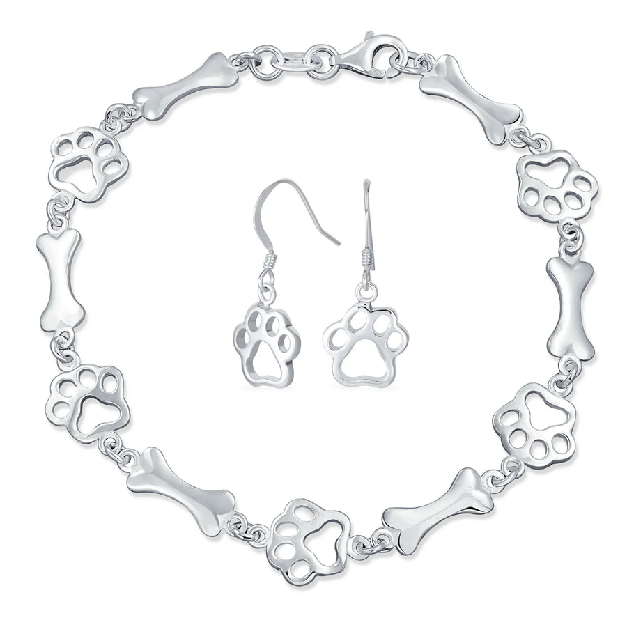 - Show off your love for dogs with this adorable .925 silver link bracelet and earrings. Featuring a charming puppy dog theme with dog bones and cutout pawprints, this bracelet is perfect for any canine lover.