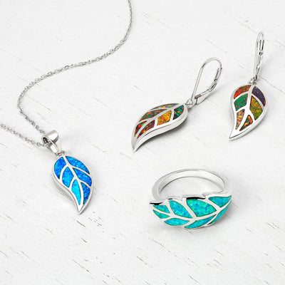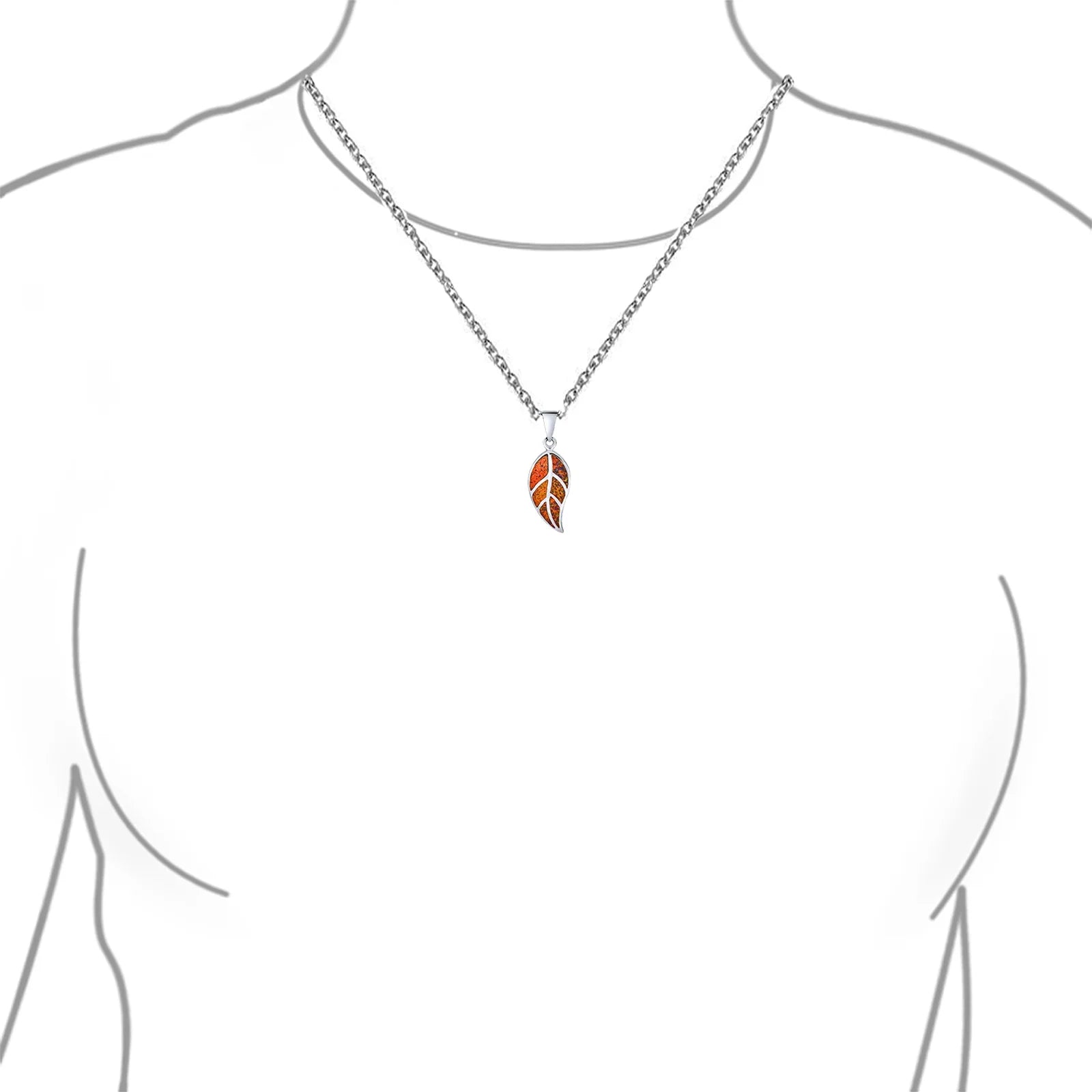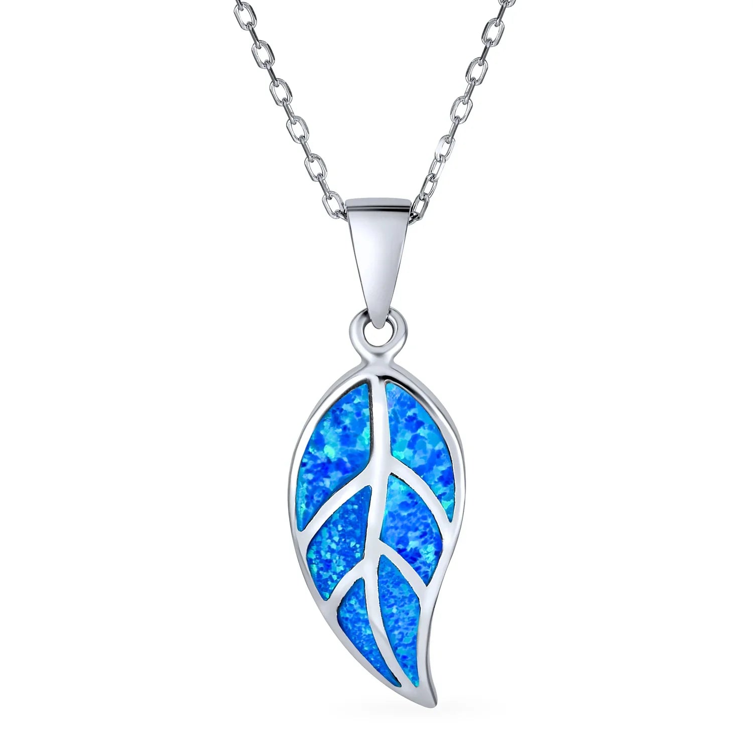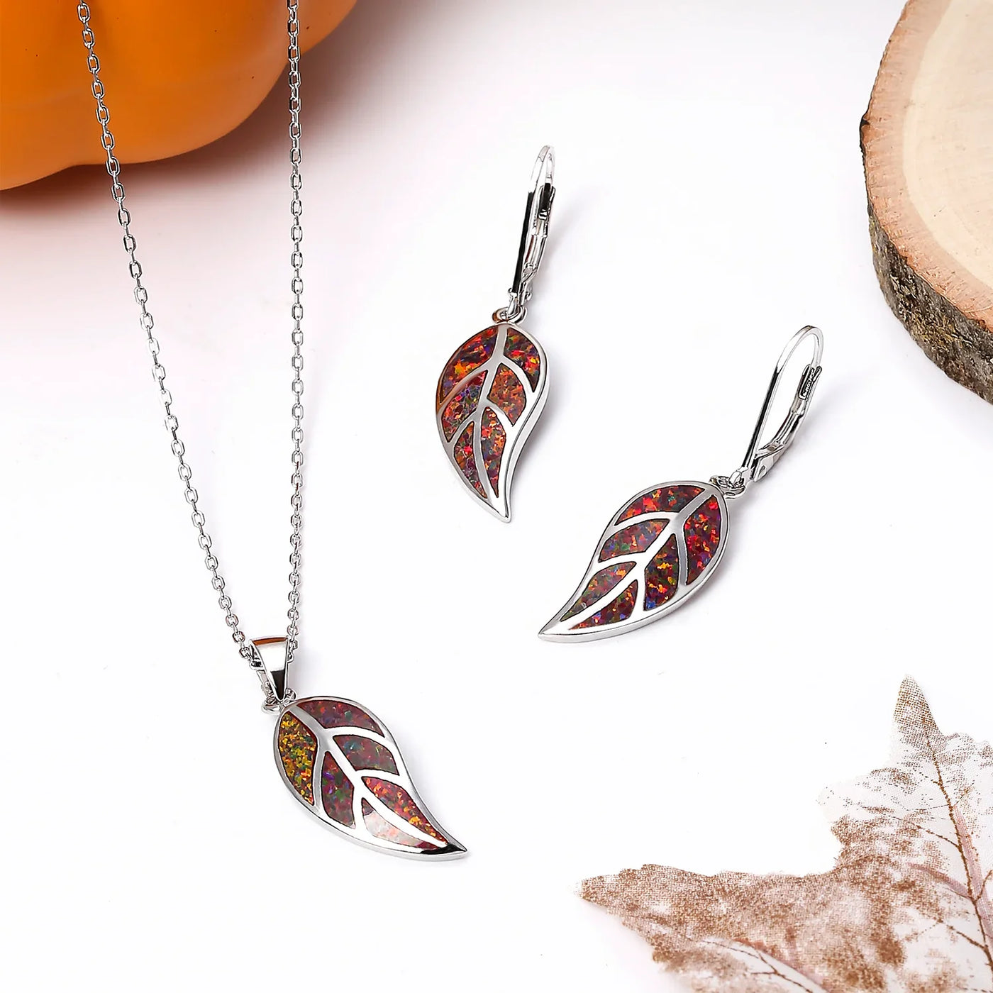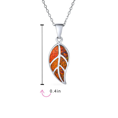 - Enhance your outfit with the stunning beauty of our rhodium plated necklace featuring a synthetic fire opal inlay design. This opal leaf pendant necklace exudes opalescent charm, making it a must-have accessory for nature lovers.