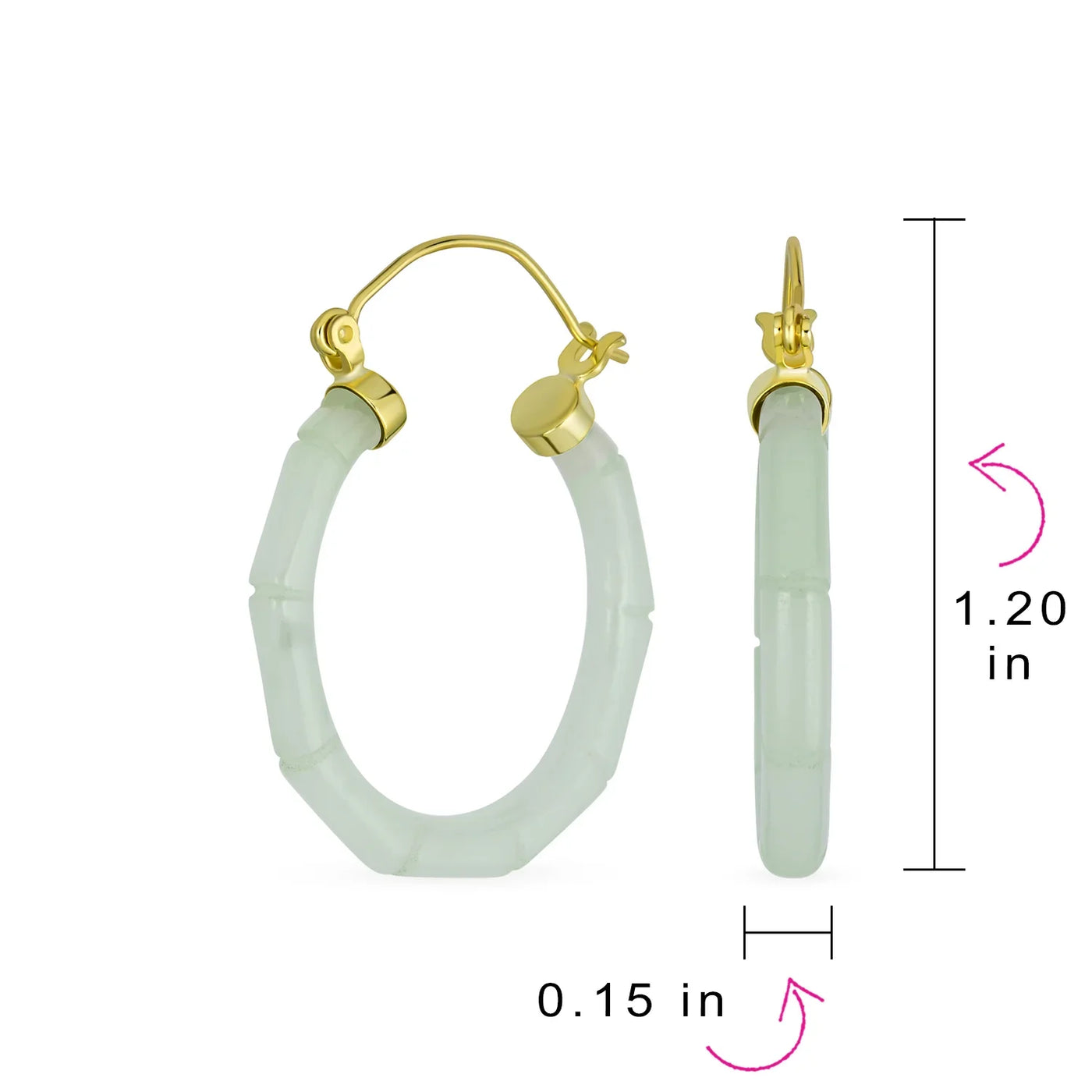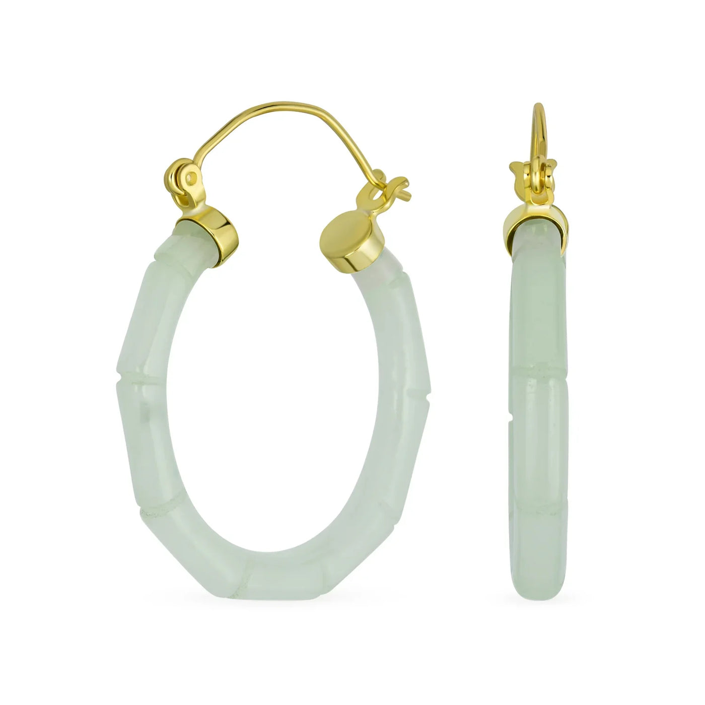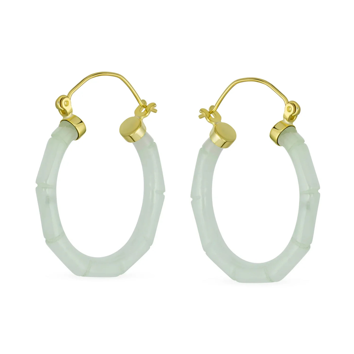 Light Green Jade Gemstone Bamboo CZ Hoop Earrings 14K Gold Plated Silver 1.2"