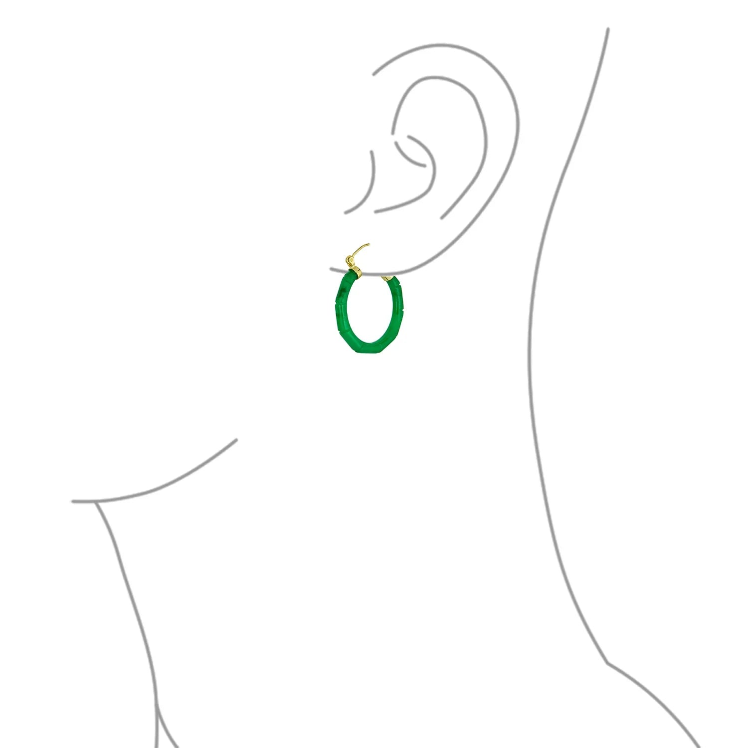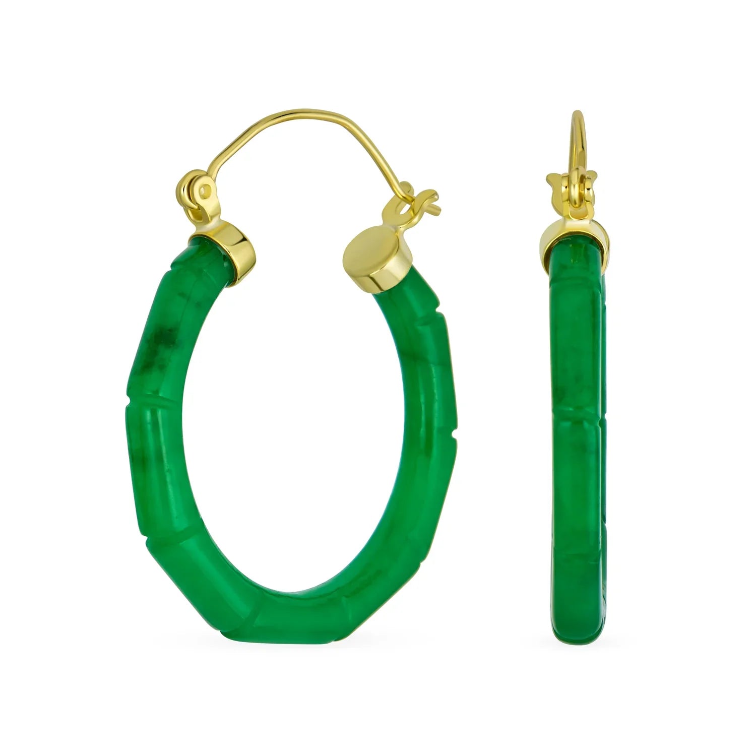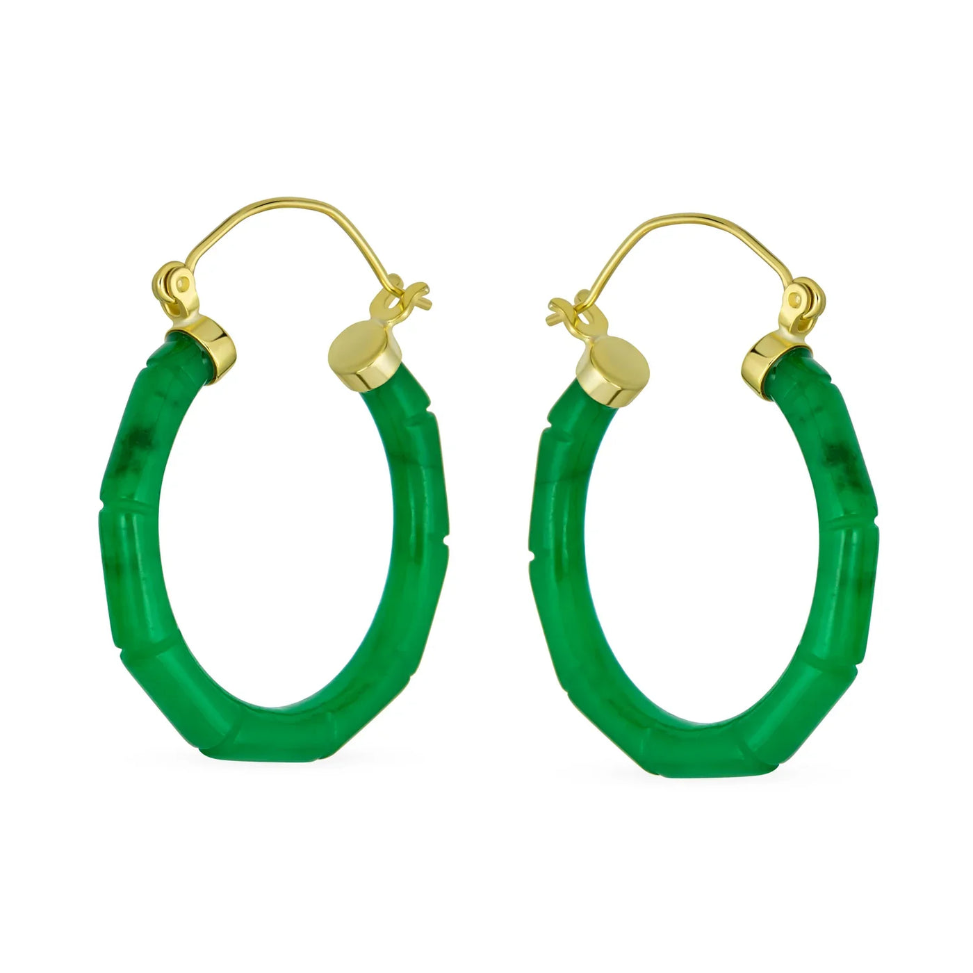 Light Green Jade Gemstone Bamboo CZ Hoop Earrings 14K Gold Plated Silver 1.2"