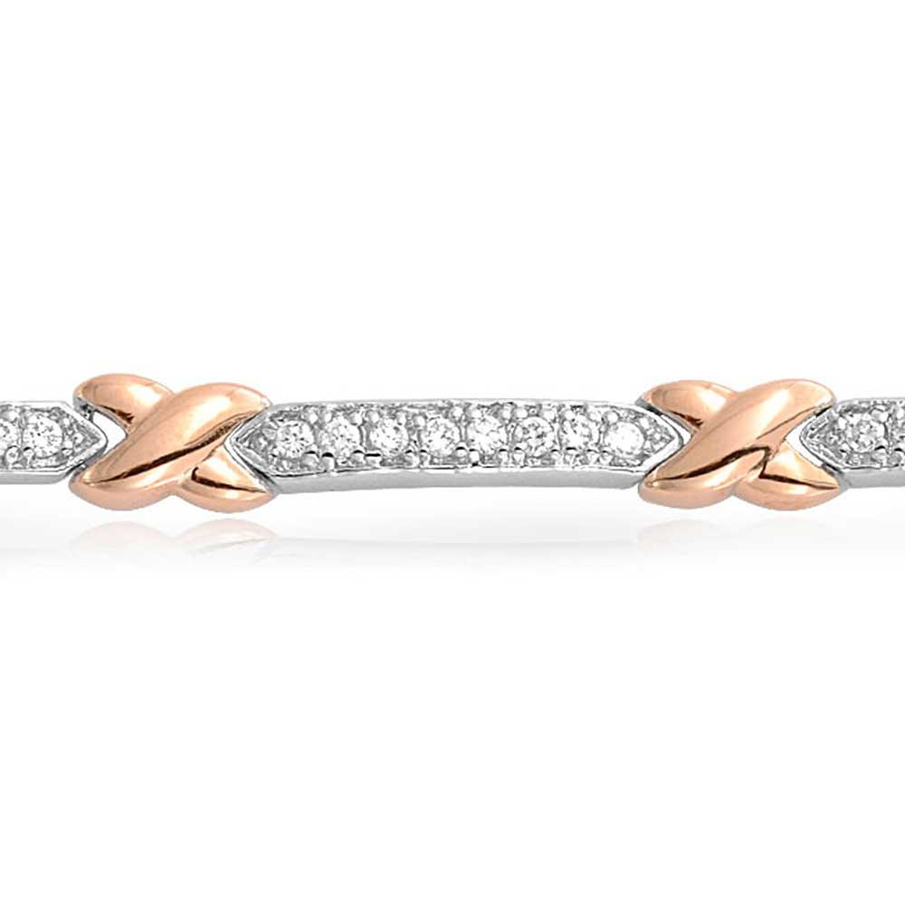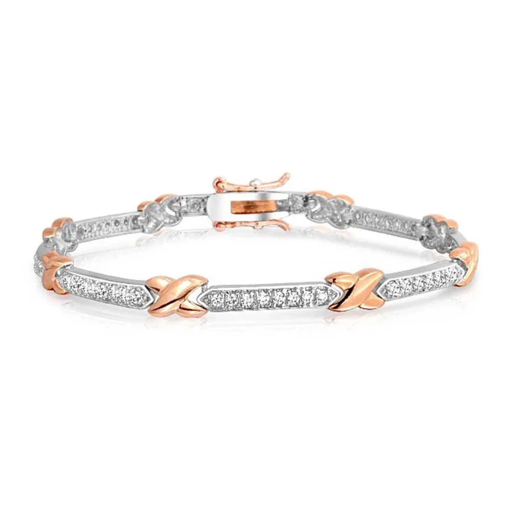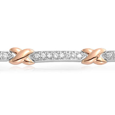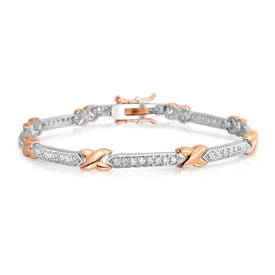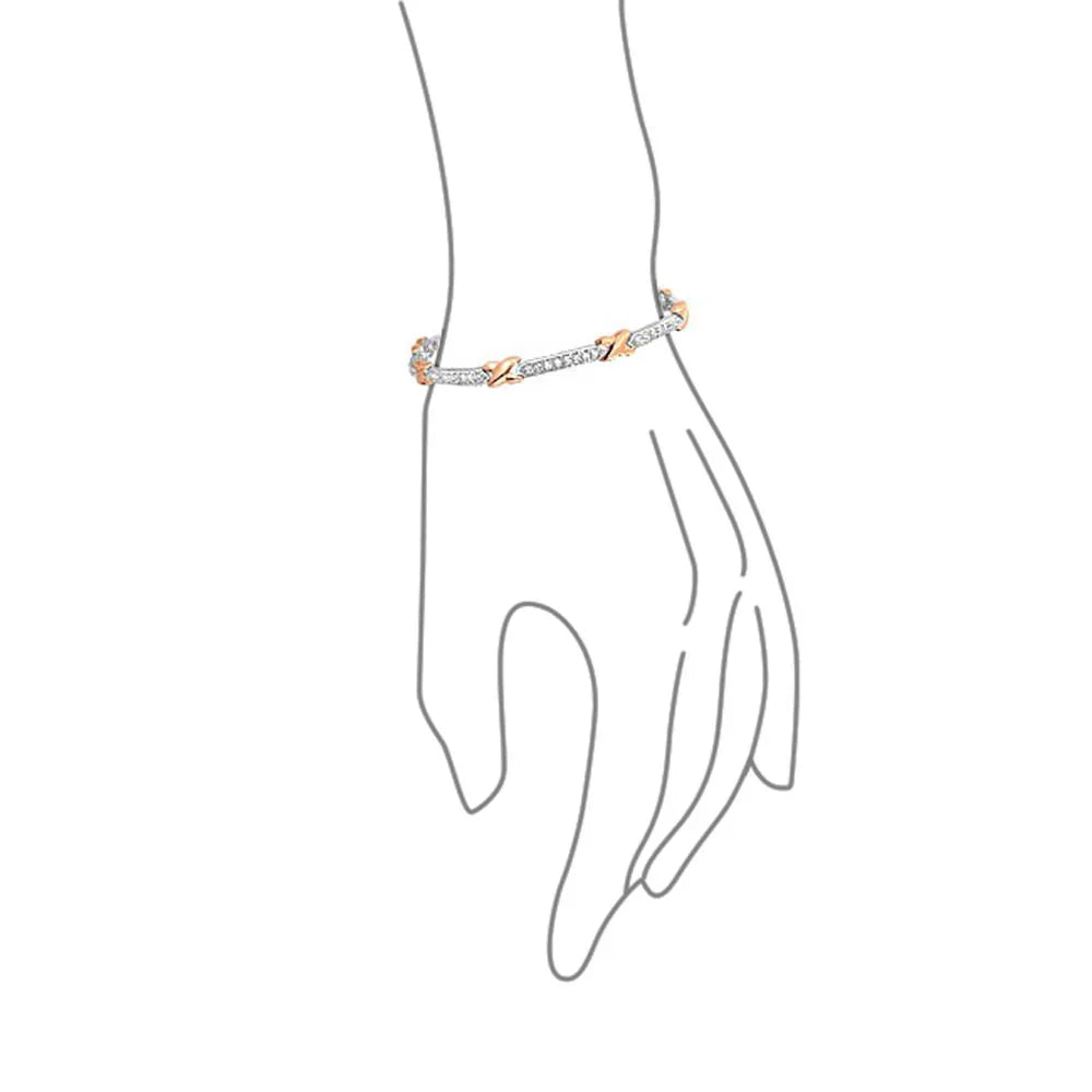 - Captivate someone special with this exquisite tennis bracelet, featuring dazzling rose gold-plated X-shaped kiss motifs that add a romantic touch, enhancing the classic clear CZ design with an eye-catching two-tone elegance.