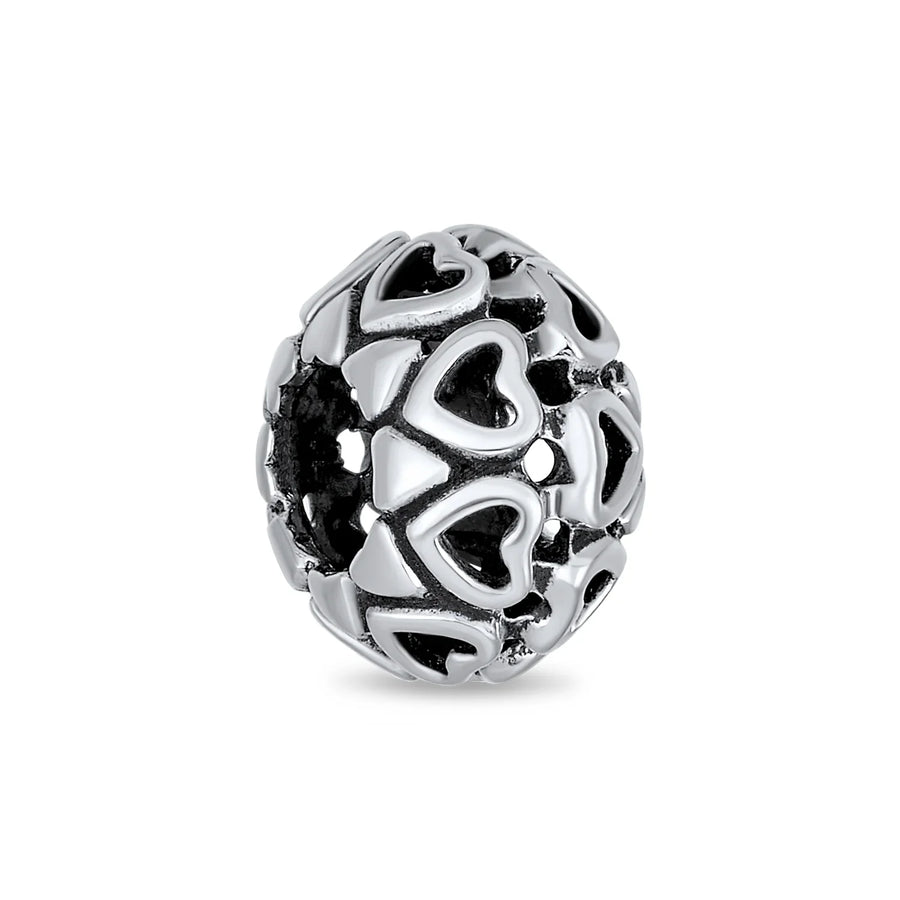 - Combine this Filigree Double Row Heart Bead with other love beads to tell your perfect love story. Crafted from .925 Sterling Silver with an Antique Styled finish, this bead features two rows of interlocking filigree hearts. Perfect for bracelets and necklaces. Discover a wide range of patterns to find your ideal charm. Weighs 1.1 grams.